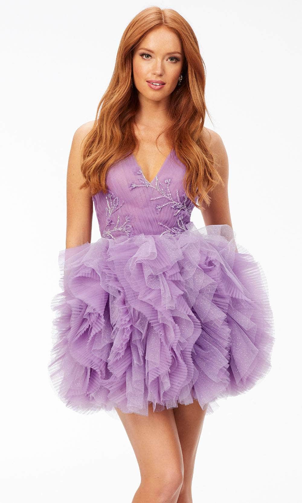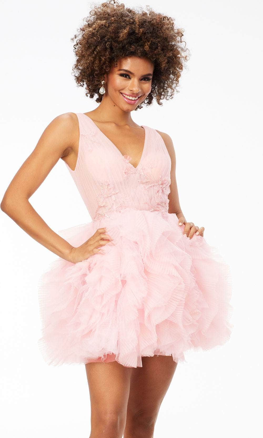 Look your absolute best and create a night that you will never forget in this Ashley Lauren 4546 creation The fitted sleeveless bodice is finished off well with a V-neck that is elegantly embellished with beaded embroidery. It has an open back with a zipper closing for a secure fit. The skirt's fitted silhouette is lovely and welcoming, and it is highlighted with a tiers of ruffled tulle with a mid thigh hem. Fascinate the crowd wearing this exceptional Ashley Lauren masterpiece. Models are wearing Blush, Orchid, and Black/White colors.