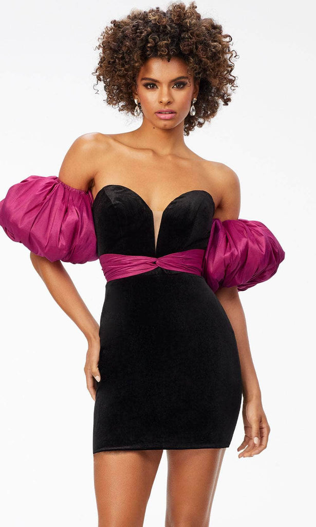 Fashionable and fun, this Fashion Gala-inspired cocktail dress by Ashley Lauren 4559. This sophisticated cocktail dress is tailored of velvet and includes a waistline that is wrapped in taffeta, which then gives way to a fitted skirt. At the next event you attend, you are certain to turn heads thanks to the detachable taffeta puff sleeves which is stunning as the sweetheart bodice accentuates your sexy curves. Clothe yourself in an alluring perfection that would capture a red carpet gala party you are dreaming of in this Ashley Lauren creation. Models are wearing Black & Raspberry, and Black & White colors.