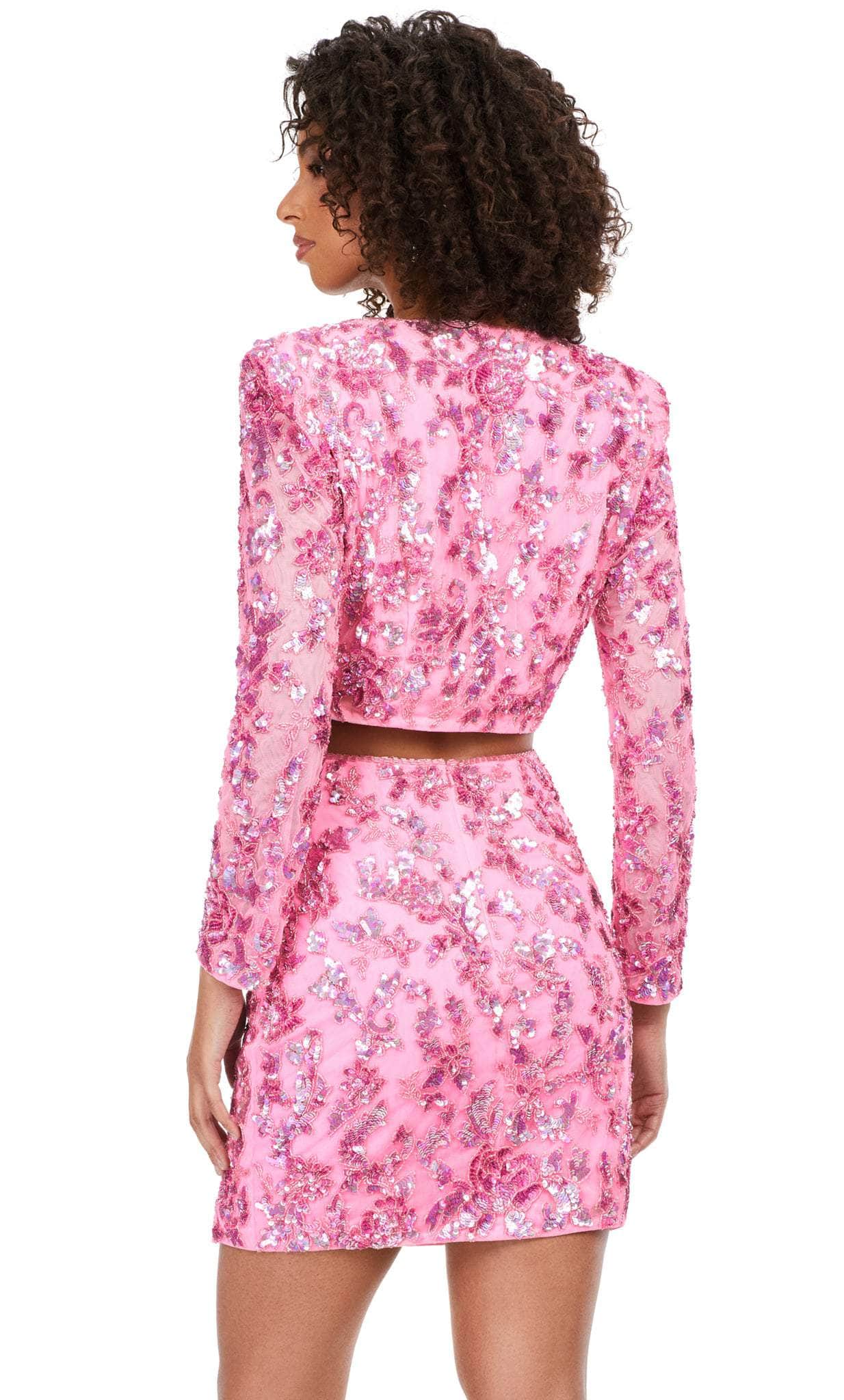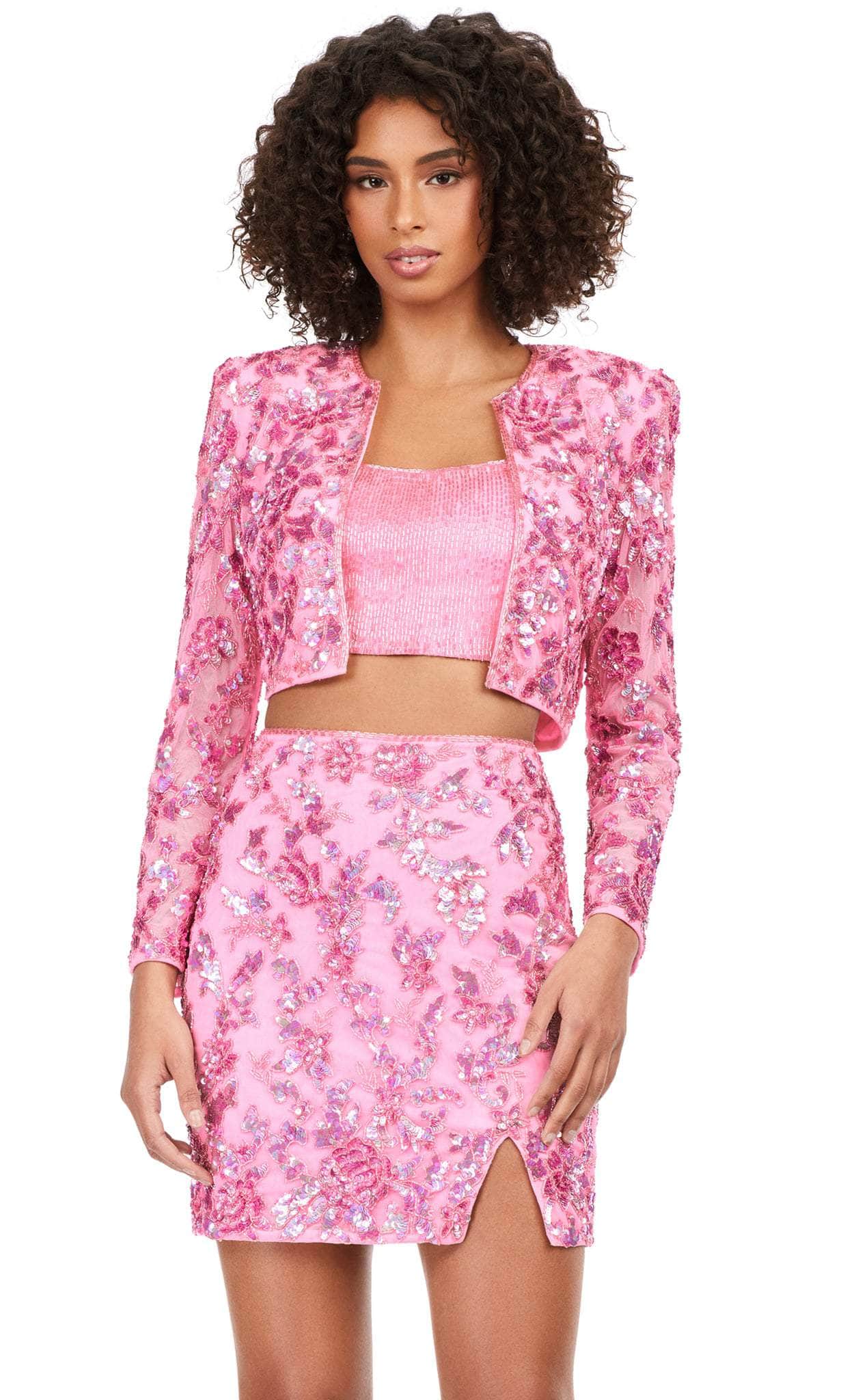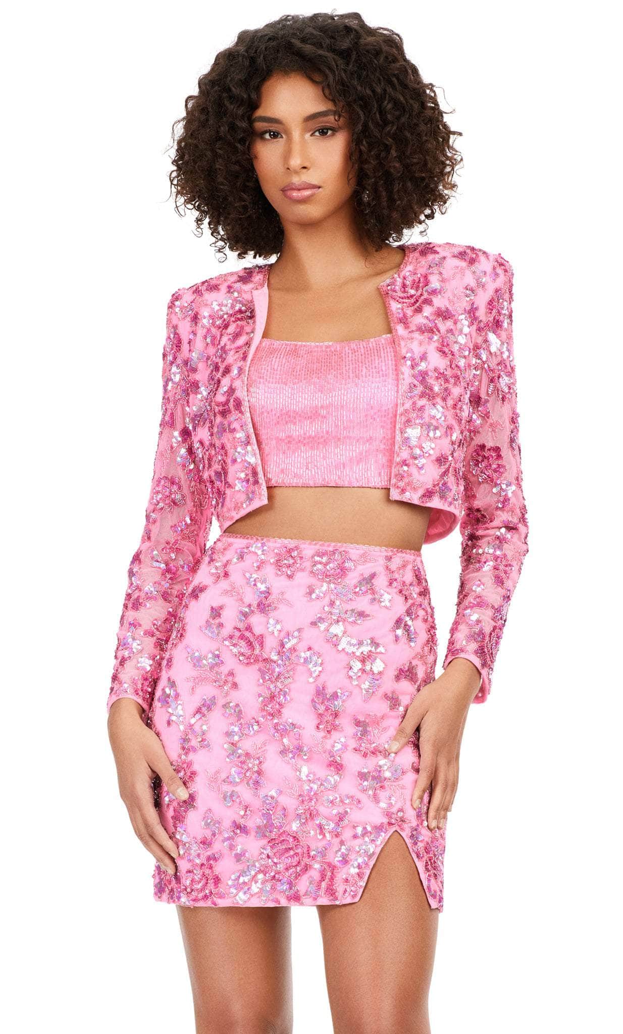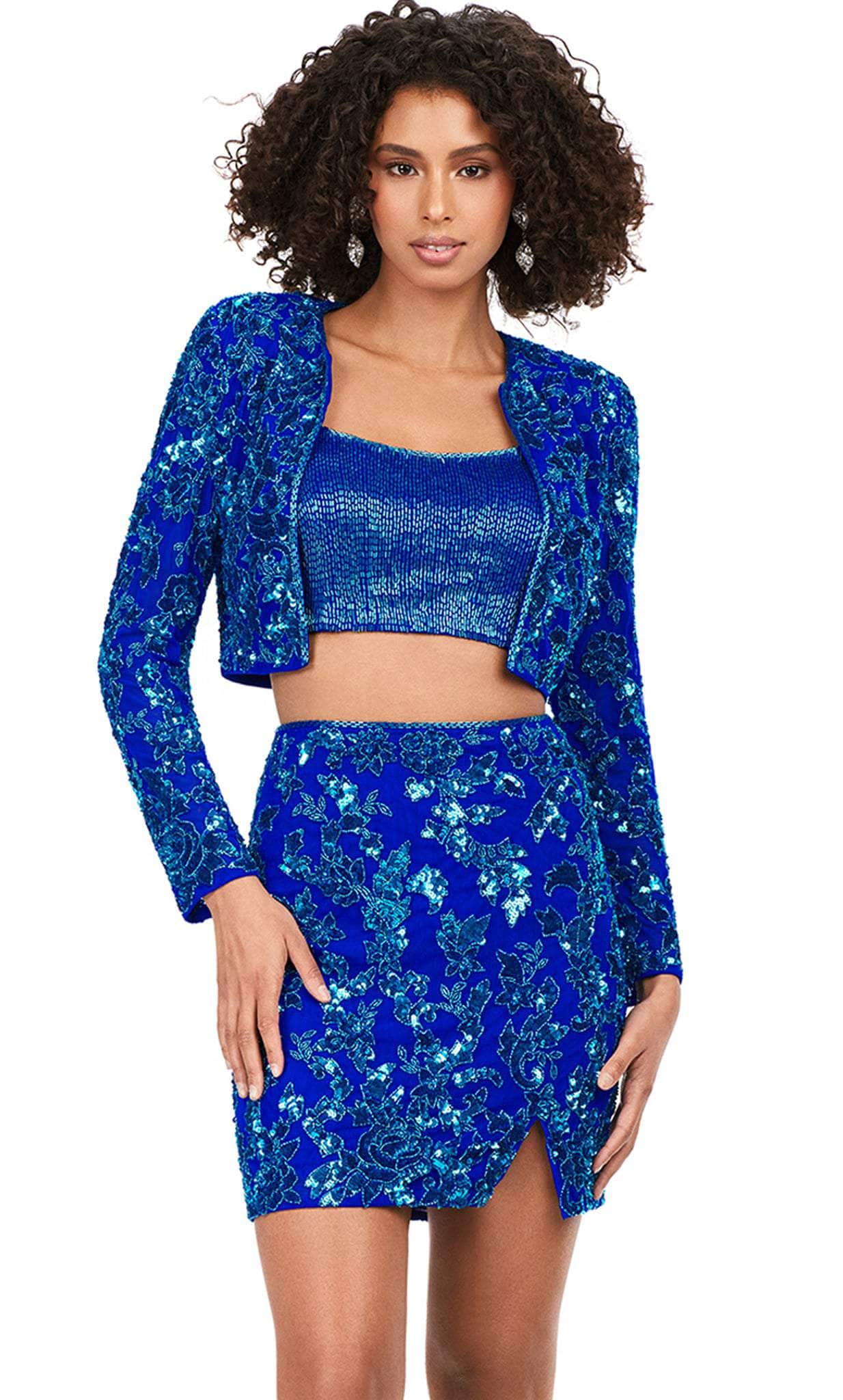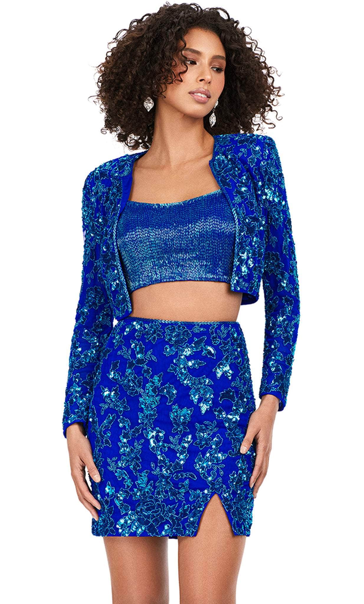Looking for a dress that will make you feel confident, stylish, and elegant? Look no further than the Ashley Lauren 4618 three-piece set. With its glamorous beadwork, long sleeve blazer, and fitted short-length skirt with a side slit, this dress is the epitome of chic and sophistication. The crop top inside features a flattering scoop neckline that accentuates your figure, making you feel confident and beautiful. This Ashley Lauren 4618 is sure to make you stand out from the crowd and leave a lasting impression. Models are wearing Candy Pink, Royal, Ivory, and Black colors.