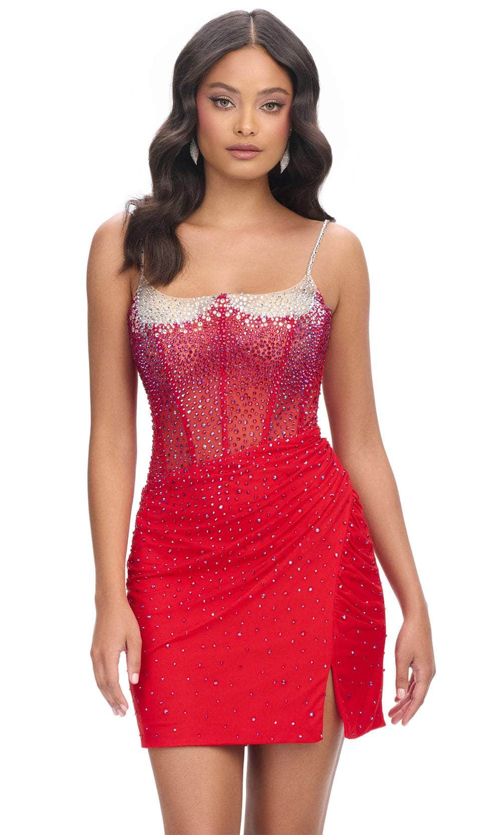 A vision of contemporary allure, the Ashley Lauren 4690 cocktail dress is a masterpiece that exudes sophistication. Delicate spaghetti straps frame the scoop neckline, leading to a captivating beaded corset bustier. The draped skirt, adorned with scattered heat-pressed stones, cascades into a seductive slit and a mini hem, showcasing the wearer's confidence. This Ashley Lauren 4690 creation is a perfect blend of elegance and modernity, ideal for those seeking a standout ensemble for any formal occasion. Models are wearing the Aqua, Fuchsia, Black, Emerald, Hot Pink, Red, Royal, and White colors.