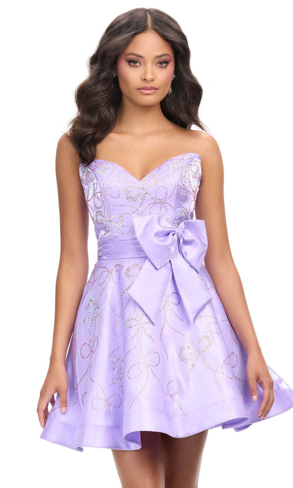 Make a splash in this cocktail dress from Ashley Lauren 4724. Showcasing a fit and flare bodice completely adorned with beads in a pretty ribbon pattern, this style is sure to grab everyones attention. The strapless design and sweetheart neckline are fascinating features. It has a pleated waistband with an oversized bow accent that gives an extra touch of femininity. The back displays zipper closure and a mid-open V-shaped cut that provides you with a snug and attractive fit. It finishes with a horsehair hem and a short A-line skirt. Let this Ashley Lauren 4724 dress elevate your style at any party. Models are wearing Hot Pink, and Orchid colors.