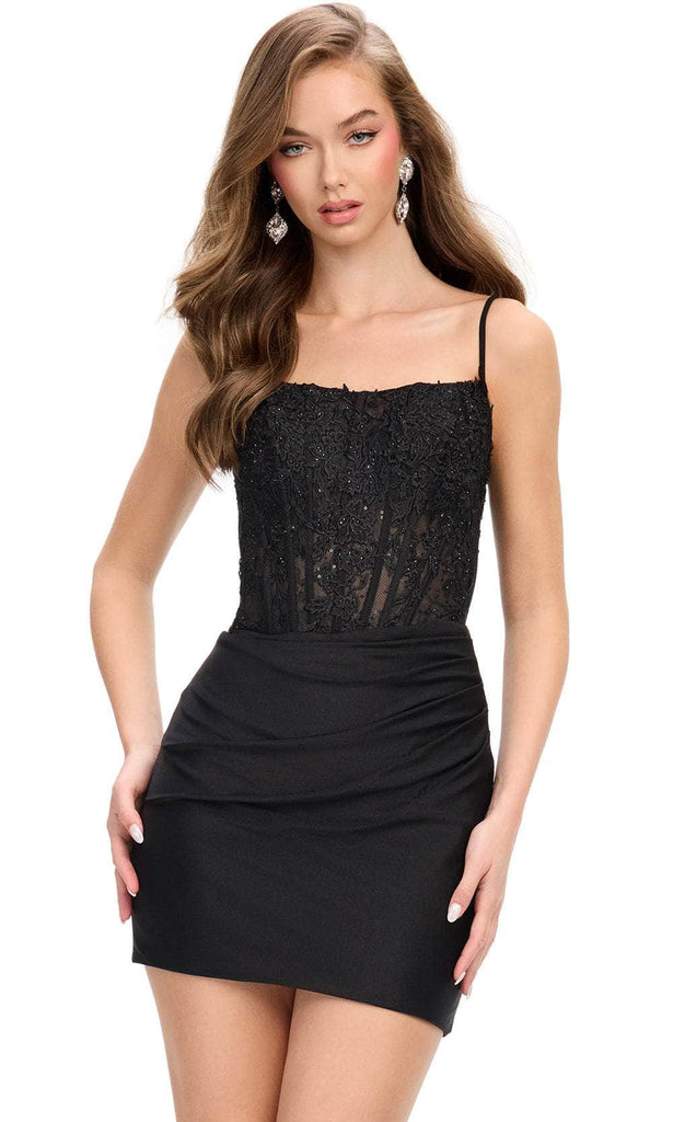 Capture hearts and dance the night away in the Ashley Lauren 4738 creation. This piece has beautiful lace applique in floral motifs and beaded detailing that adds a romantic touch. The soft ruching in the skirt and a corset bustier enhance your curves. Features include the scoop neckline and spaghetti straps that extend to the mid-open back. The mid-thigh skirt forms a sheath silhouette that gives it a feminine and attractive appeal. You are guaranteed to be the envy of the evening in this Ashley Lauren 4738 masterpiece. Models are wearing Black, Hot Pink, and Turquoise colors.
