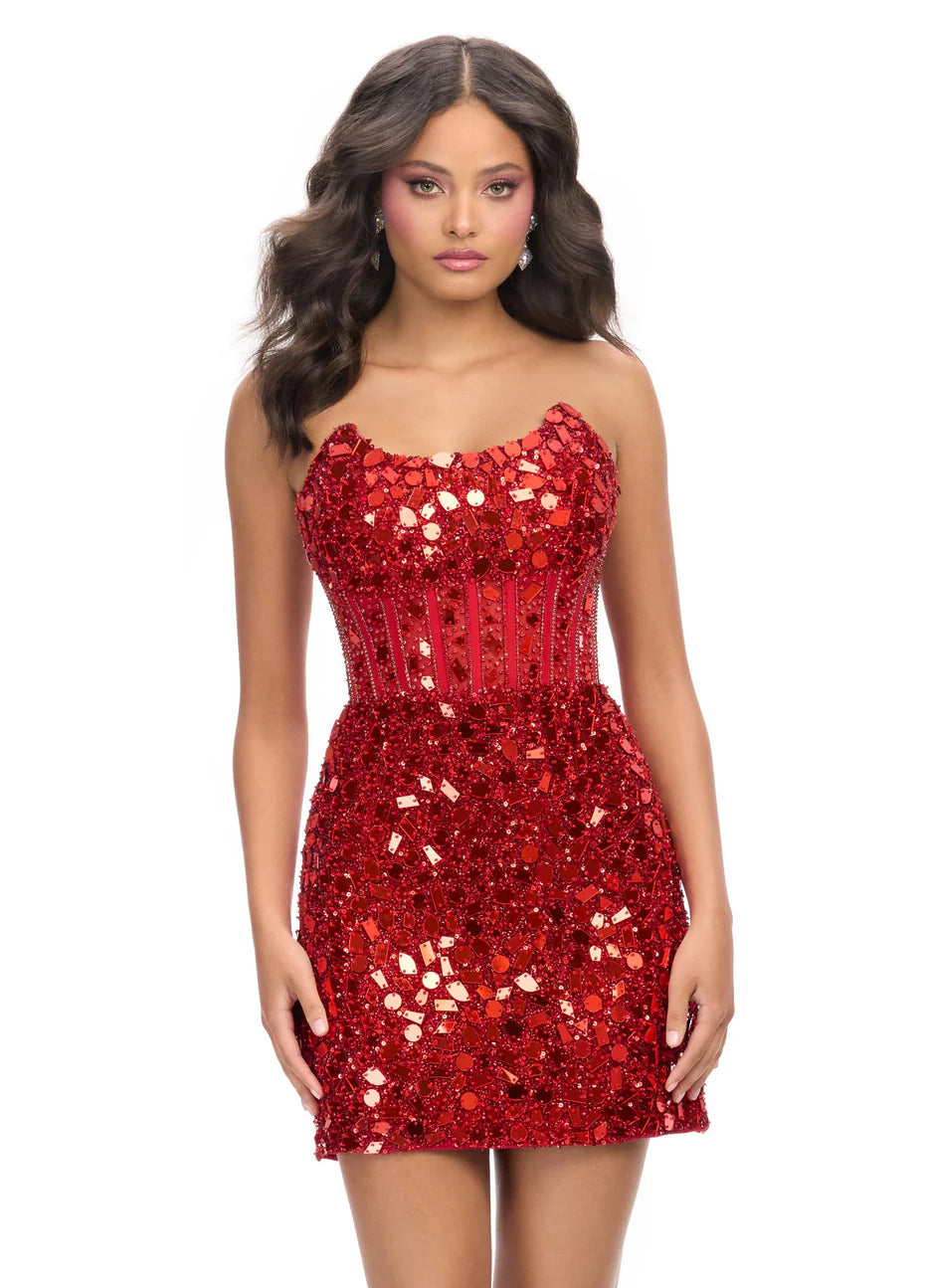 Elevate your party look with this Ashley Lauren 4757 masterpiece. Featuring a corset bustier for a figure-hugging fit, this strapless dress is perfect for hitting the dance floor. It is fully adorned with a combination of cut mirrors, sequins and beads, giving you timeless sparkle all night. The scoop neckline and natural waist add a touch of allure. Your seductive legs are exposed as it flow to the mid-thigh, and finish the look with a sheath skirt that attractively traces your hourglass curves. Go girl and celebrate! Have fun in Ashley Lauren 4757 short dress. Models are wearing Red, Silver, Nude, and Pink colors.