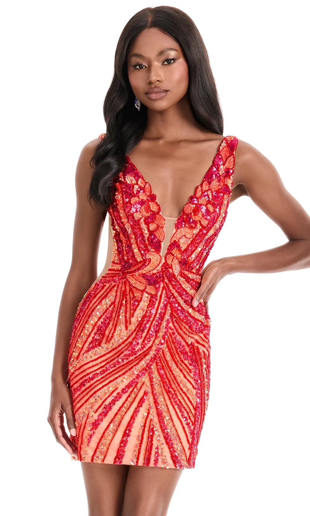 A celebration of texture and brilliance, the Ashley Lauren 4893 is a stunning cocktail dress that leaves a bold impression. Its beaded and sequin design weaves geometric patterns across a sheer fitted silhouette that hugs the body effortlessly. The plunging V-neckline and illusion side cutouts elevate the drama while the open v-back provides a seductive finish. Made for those who embrace high glamour, this mini sheath dress is equal parts sparkle and structure. Make a lasting impression wherever you go in the dazzling Ashley Lauren 4893. Models are wearing Blue/Jade, and Red/Coral colors.
