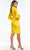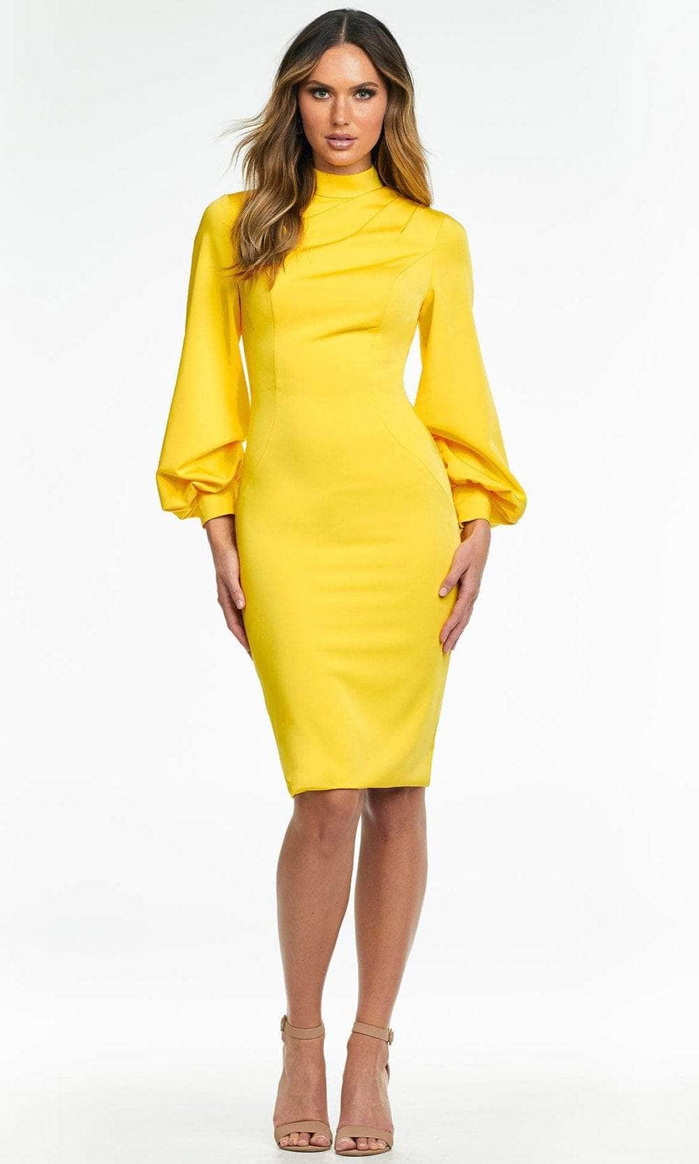 This elegant dress showcases a fitted bodice, long bishop sleeves and high neckline with asymmetrical draping detail. The full back is secured with an industrial back zipper while the sheath skirt runs at knee length hemline. Unleash an inner glamour that attracts all eyes on you in this Ashley Lauren masterpiece. Model is wearing the Yellow color.