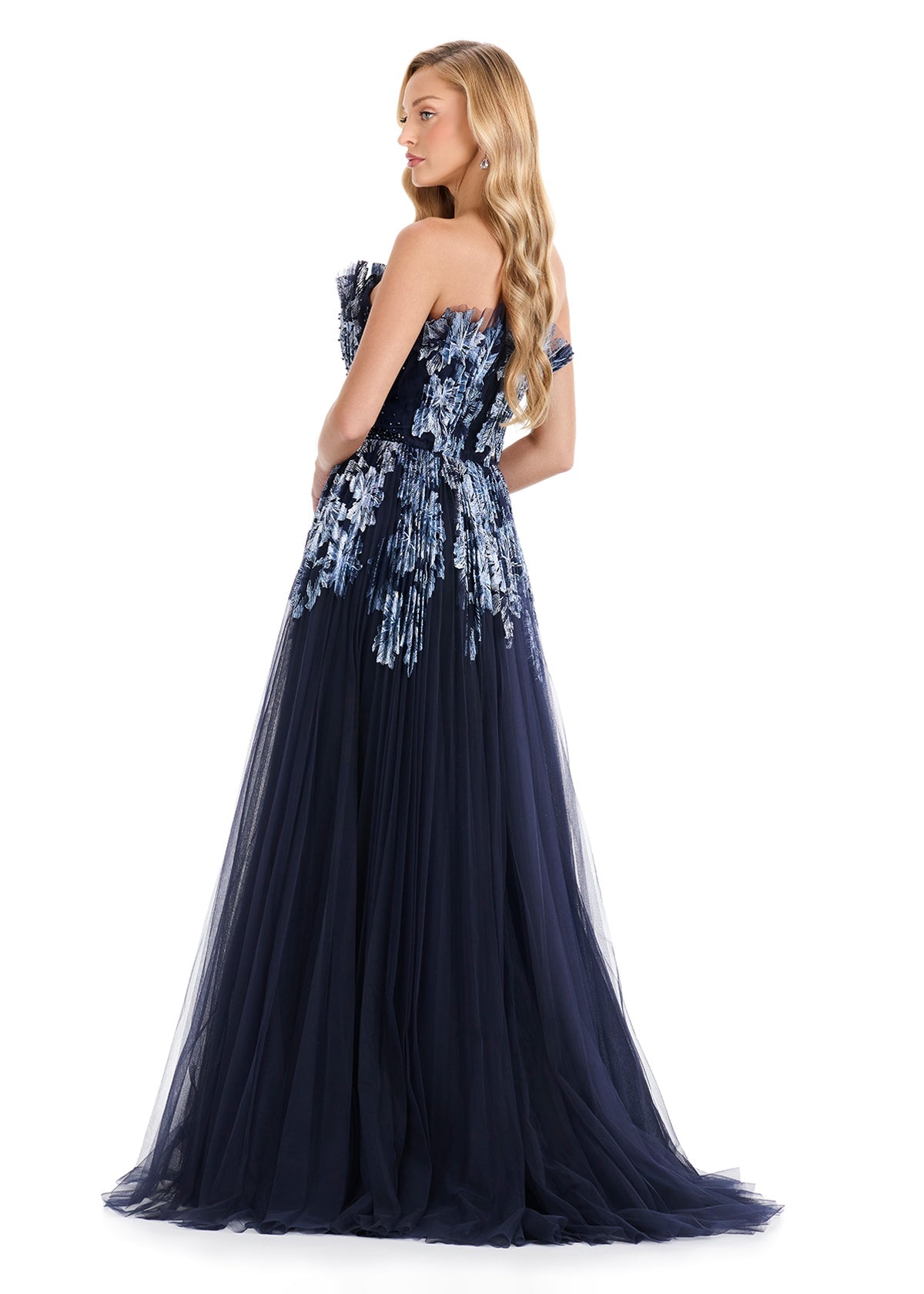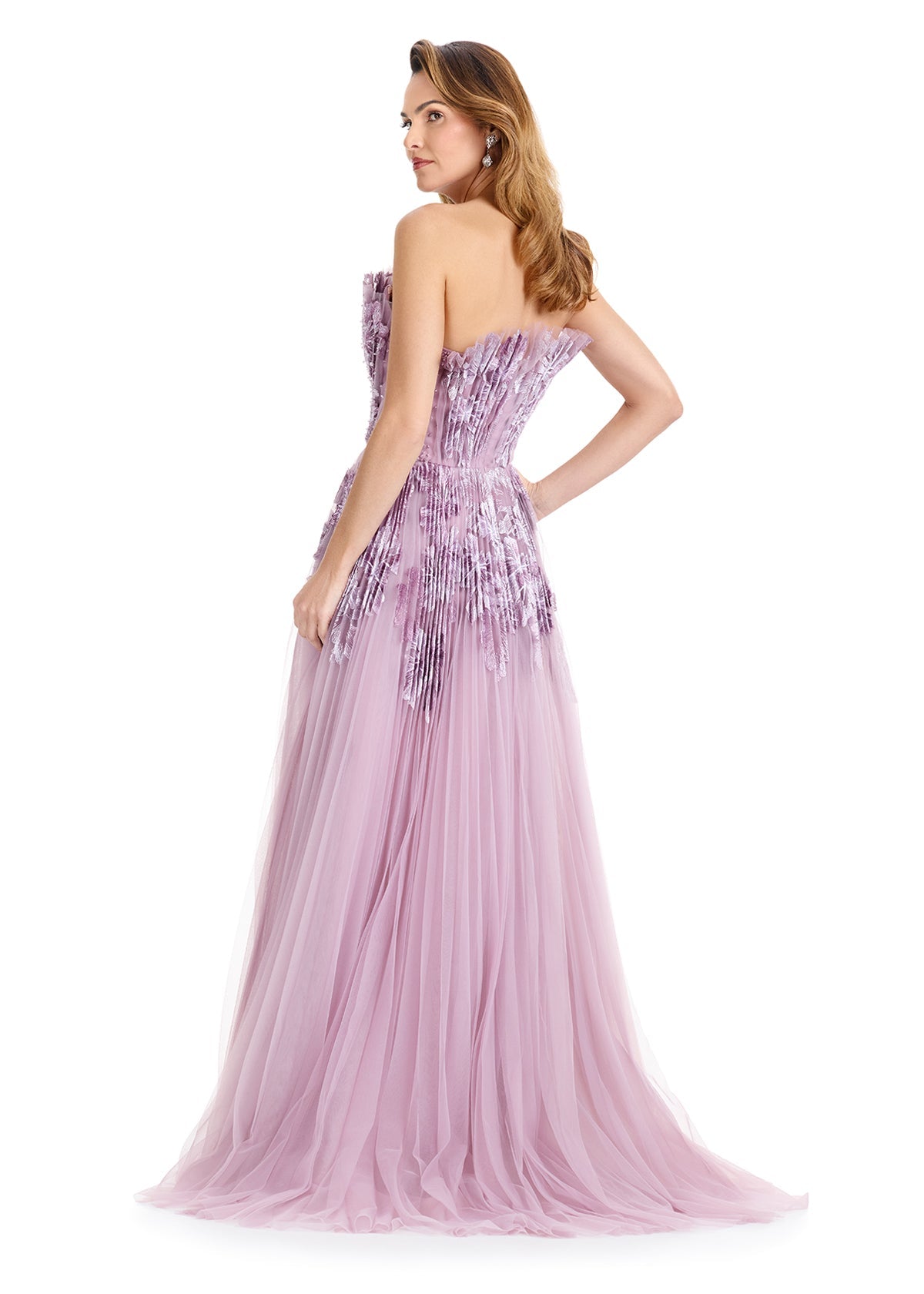Pure glamour unfolds in the Ashley Lauren E12127 gown, a breathtaking vision of sparkle and volume. The strapless cut and straight across neckline draws focus upward, while vertical pleating elongates the bodice and enhances the waistline. A subtle shimmer radiates from the intricate embellishments, cascading through the flowing A-line skirt with stunning dimension. Its regal shape exudes fairytale grandeur, making Ashley Lauren E12127 a must-have gown for galas, premieres, and statement-making occasions. Models are wearing Blue, and Mauve colors.