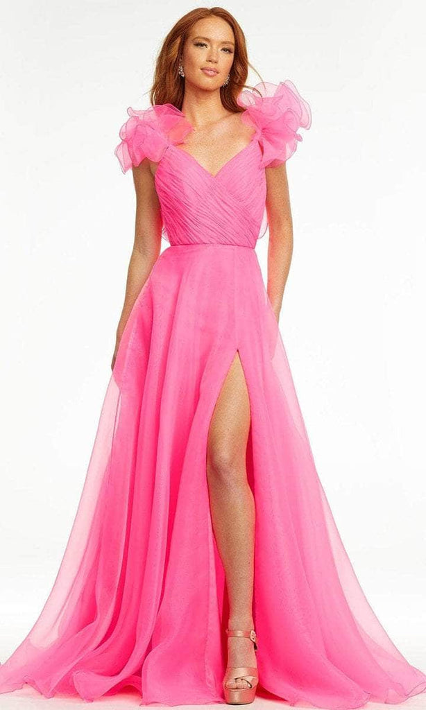 This gown features a ruched bodice framed with a V neckline and V back, with ruffled trims. The flowy A-line skirt is accented with a front high slit and it gorgeously finishes in full length hemline and sweep train. Model is wearing the Hot Pink color.