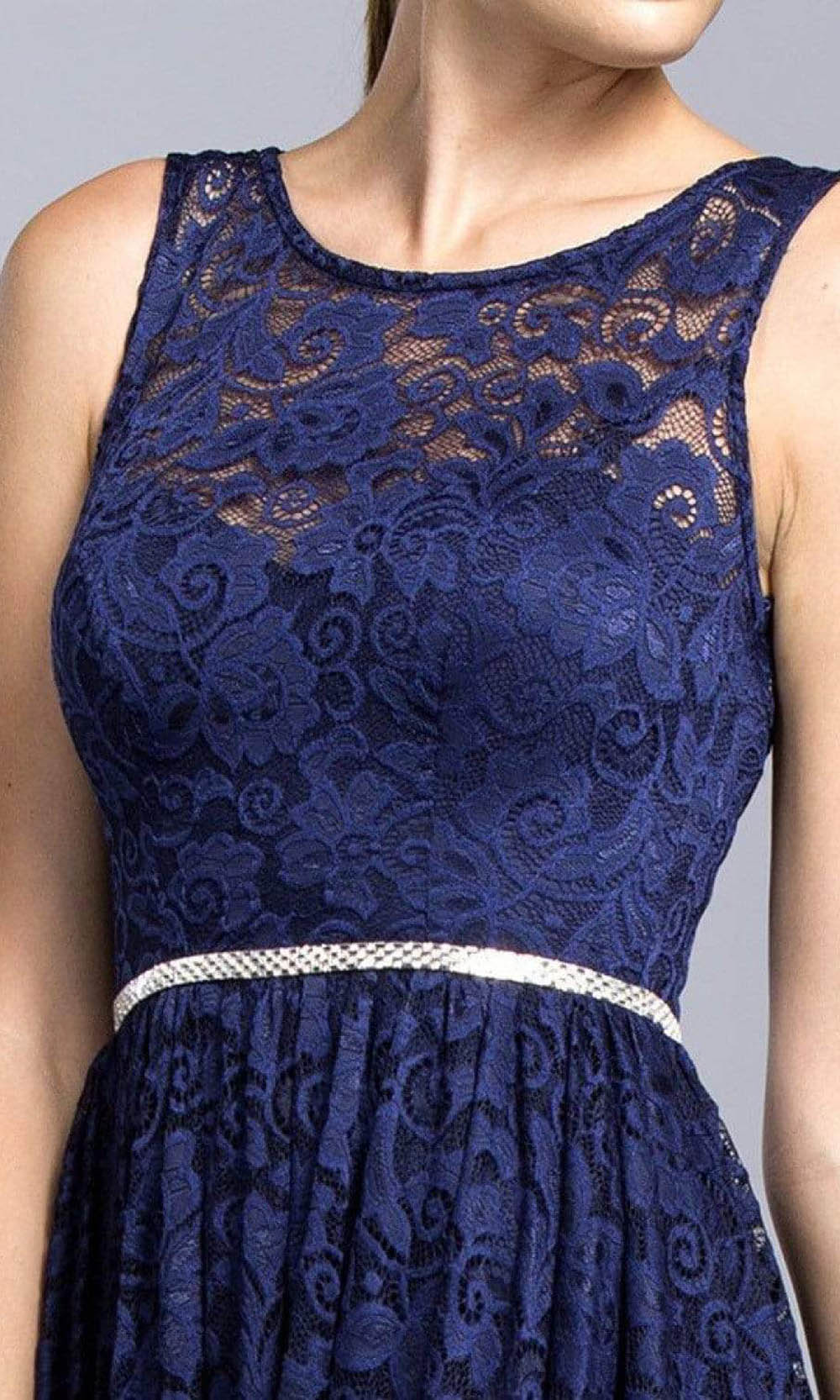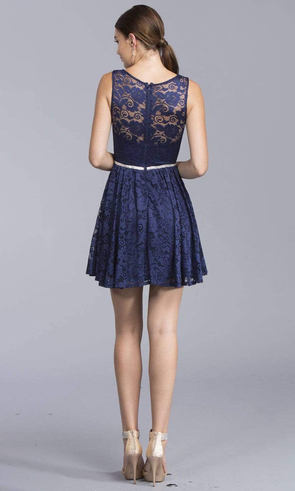 Have all eyes on you in this inspired Aspeed Design D124 creation. Crafted in a lace silhouette, this dress reveals a scoop neckline with a gathered bejeweled waistband. This sleeveless beauty has a sheer full back and a flaring short hemmed skirt. Grace every party with style in this Aspeed Design masterpiece. Model is wearing the Navy color.