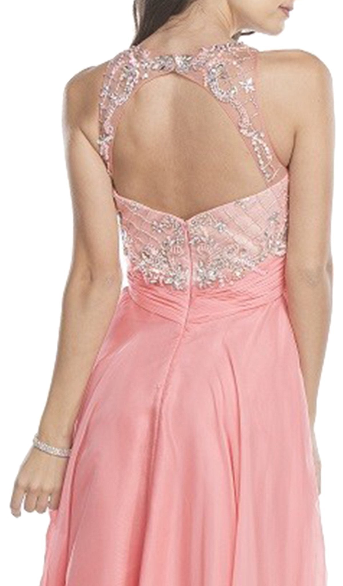 | Details: | Sleeveless, Beaded, Sheer neckline, Ruched waistband, Back zipper closure |