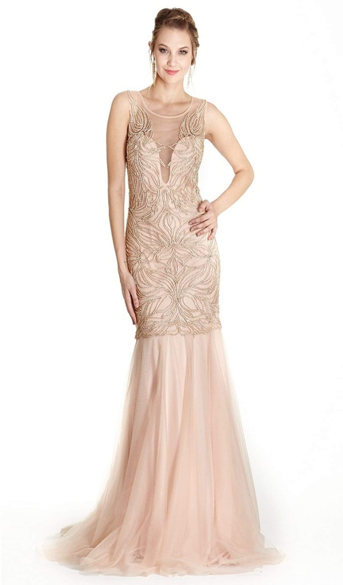 Portray the rich variety of design in this long dress from Aspeed L1764. Presents in a sleeveless, illusion scoop neckline with a plunging neckline detail. The fitted bodice is ornate with embellishments and flaunts a sheer back. The skirt has a trumpet silhouette that perfectly hugs your curves and brings drama with its sweep train finish. Get glam in this fabulous dress from Aspeed.