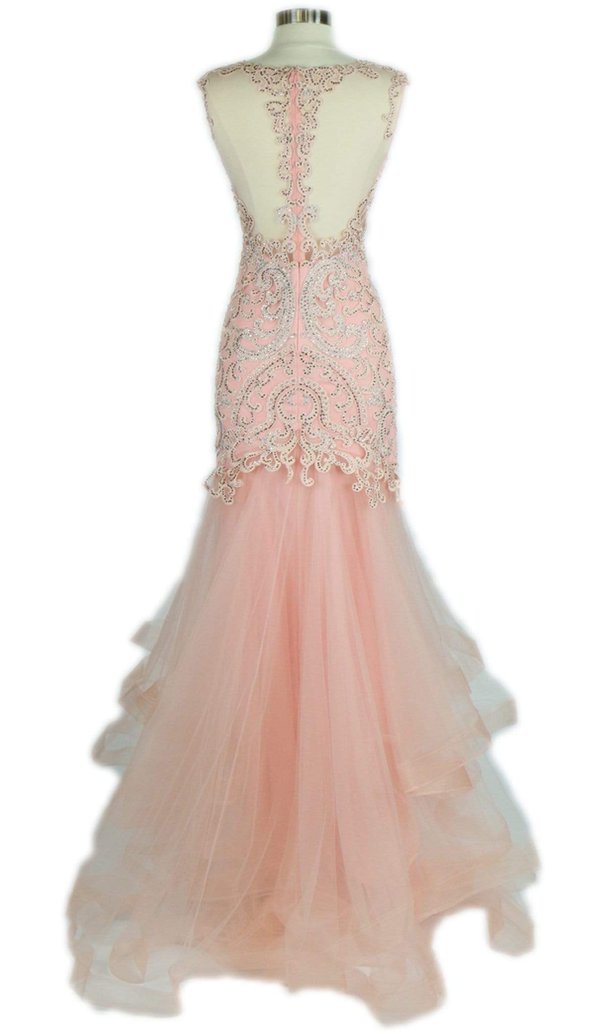 Join us in celebrating your beauty in a sophisticated dress from Aspeed L2012. Fashions cap sleeve, illusion jewel neckline with fitted bodice decked with embellishments. The back has a zipper closure while the trumpet skirt is styled in tiered ruffles with horsehair hemline and sweep train. Make your debut in a red carpet dress from Aspeed. Model is wearing Blush color.