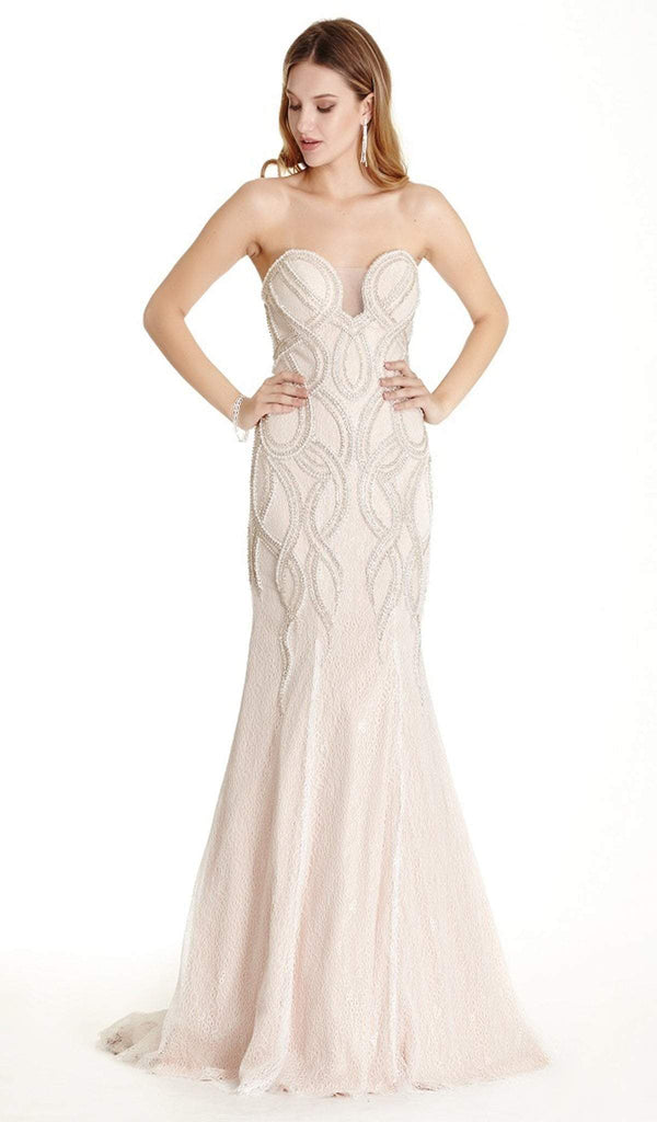 Beam with pride when you wear this radiant dress from Aspeed L1765. Flaunts a strapless, sweetheart neckline with sheer panel. The fitted bodice is detailed with embellishments in beautiful parents. The back has a lace up closure while the skirt flows towards the floor in a trumpet silhouette and finishes in a sweep train. Dress to the nines in this glam dress by Aspeed.