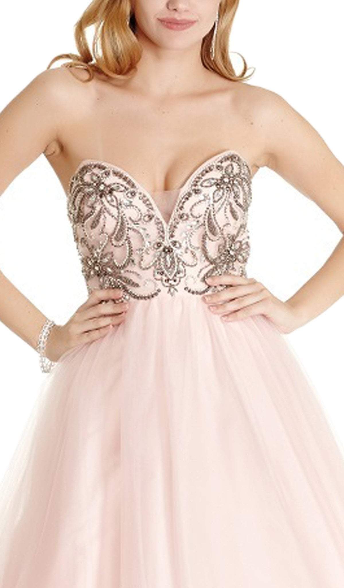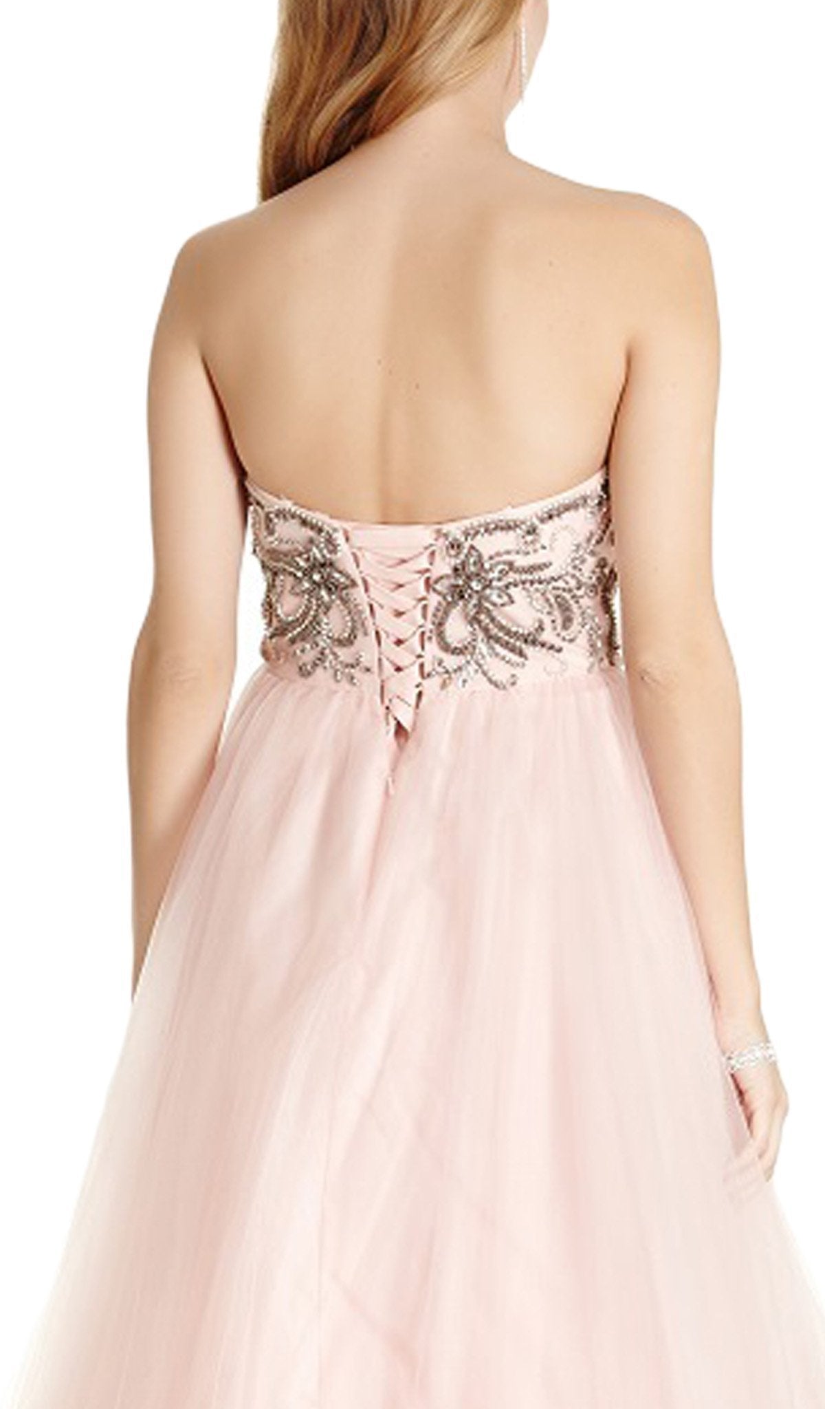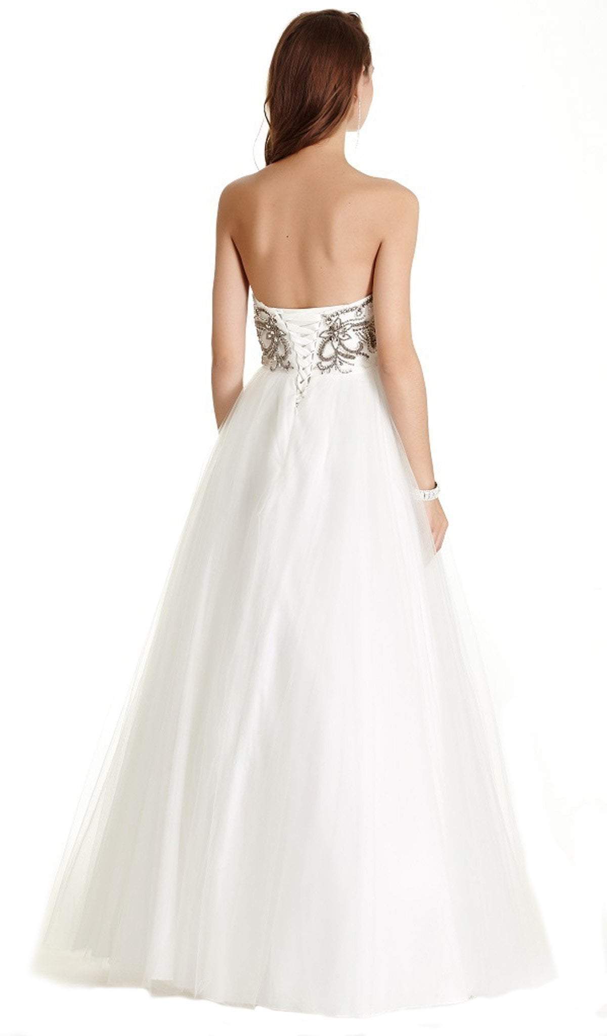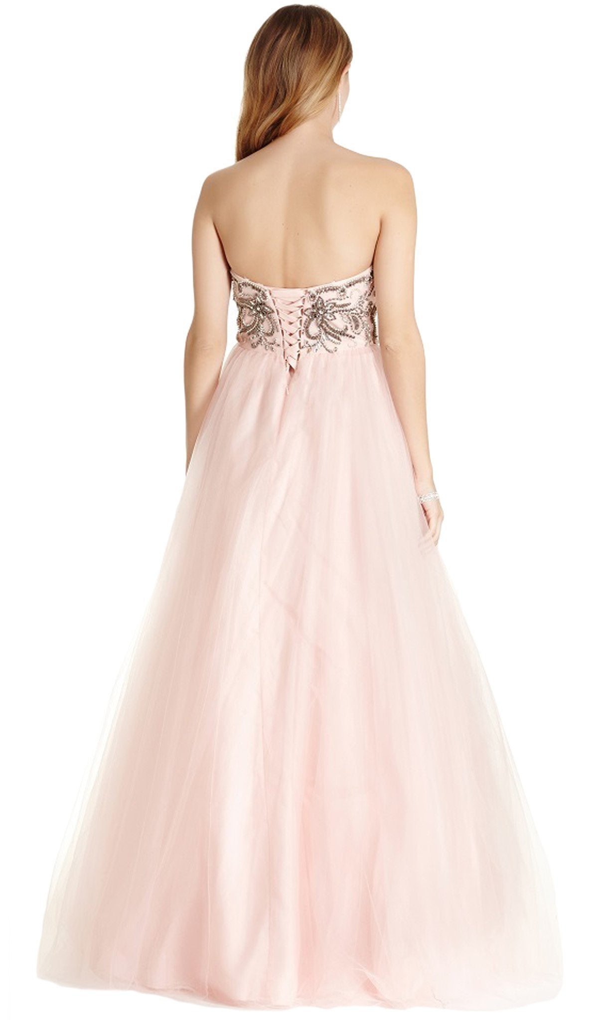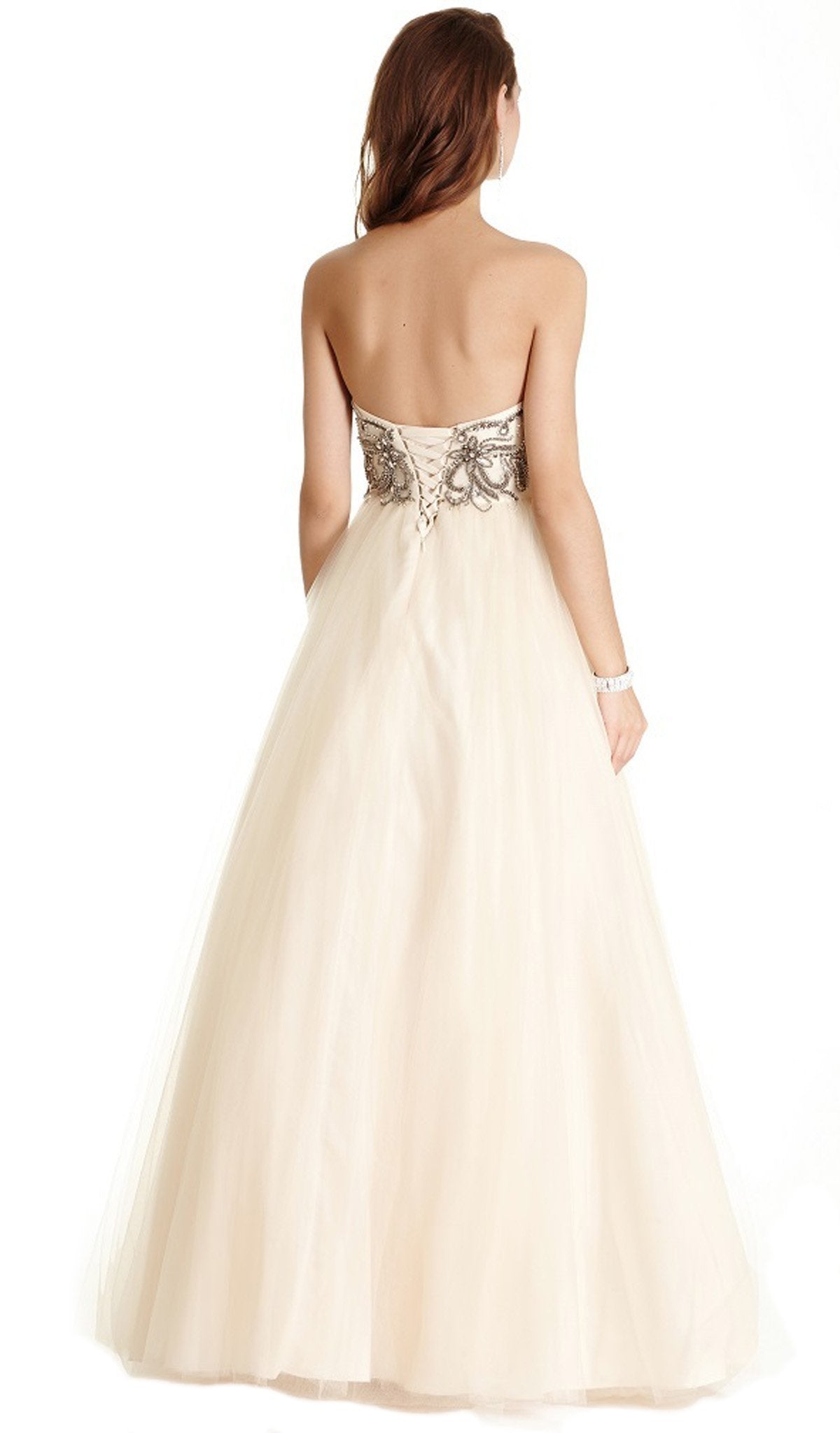 | Details: | Strapless, Embellished bodice, Sheer panel, Plunging neckline, Ballgown skirt, Lace up closure |
