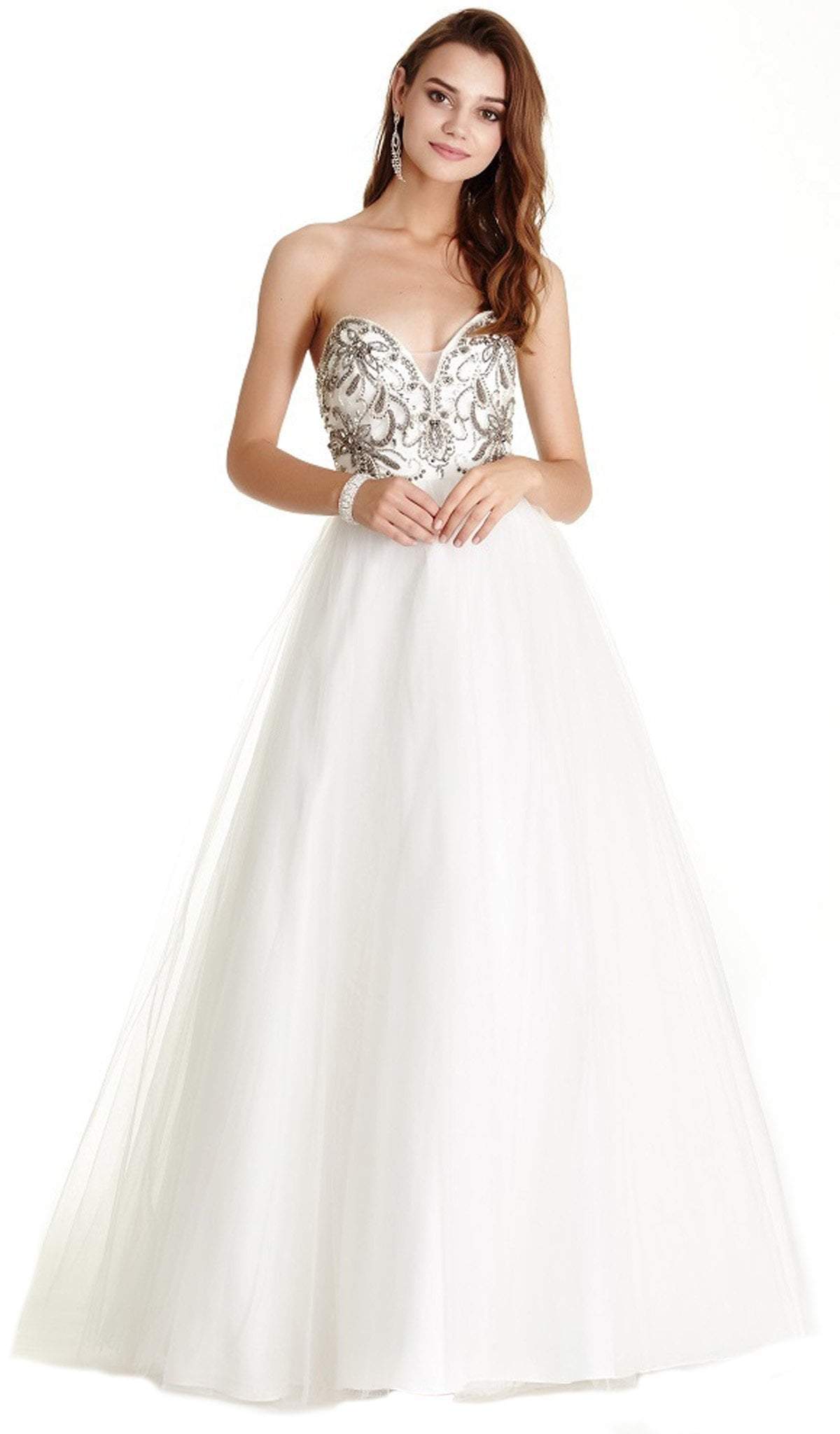 Walk in glamour and let all heads turn on you in this creation by Aspeed L1829. Features a strapless, plunging sweetheart neckline with sheer panel on mid-bust. The bodice is lavishly adorned with embellishments and has a lace up closure. From the natural waist begins a full length ballgown skirt that gives that princess look. This Aspeed gown is sure to make you the darling of the party!