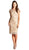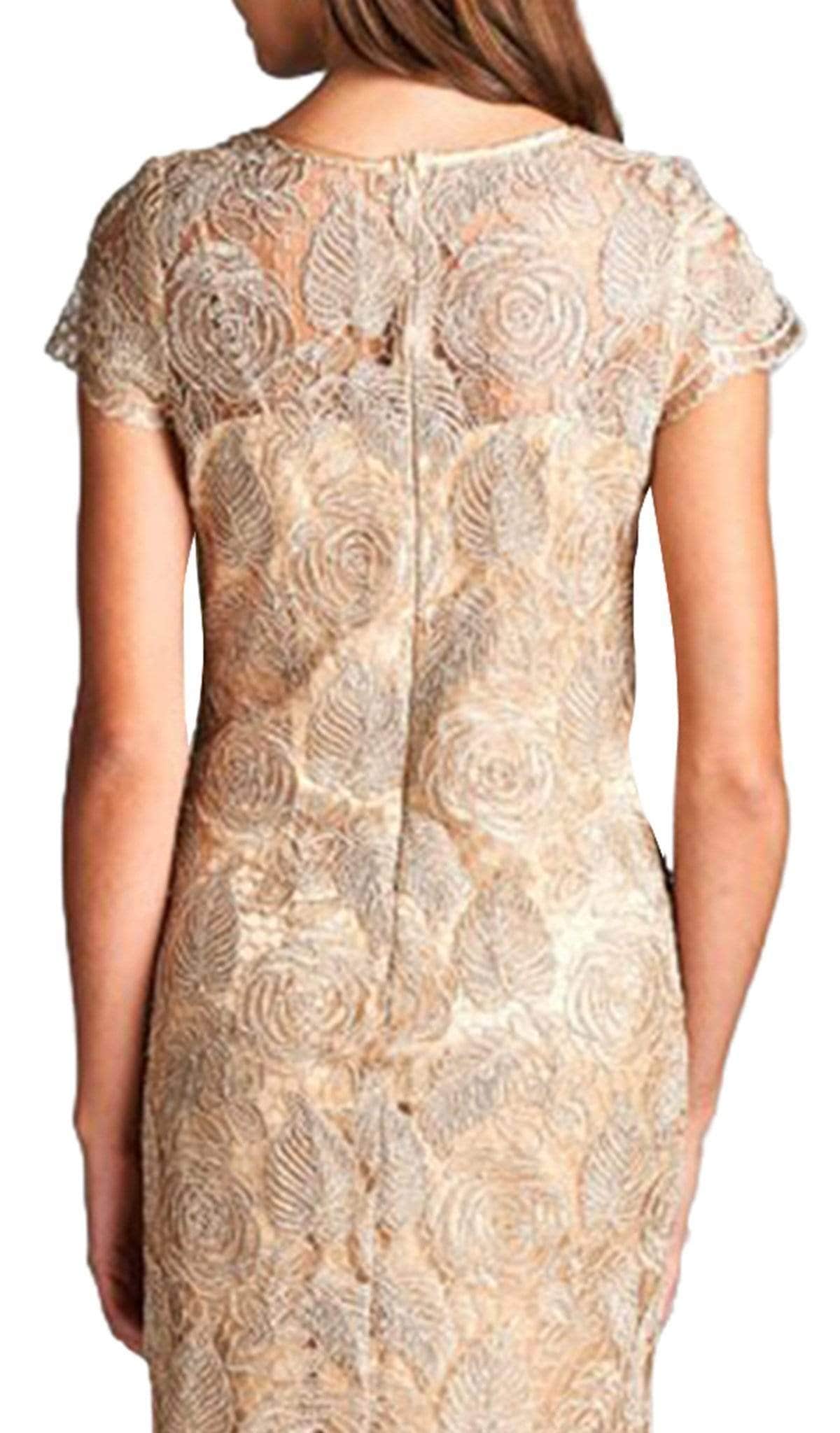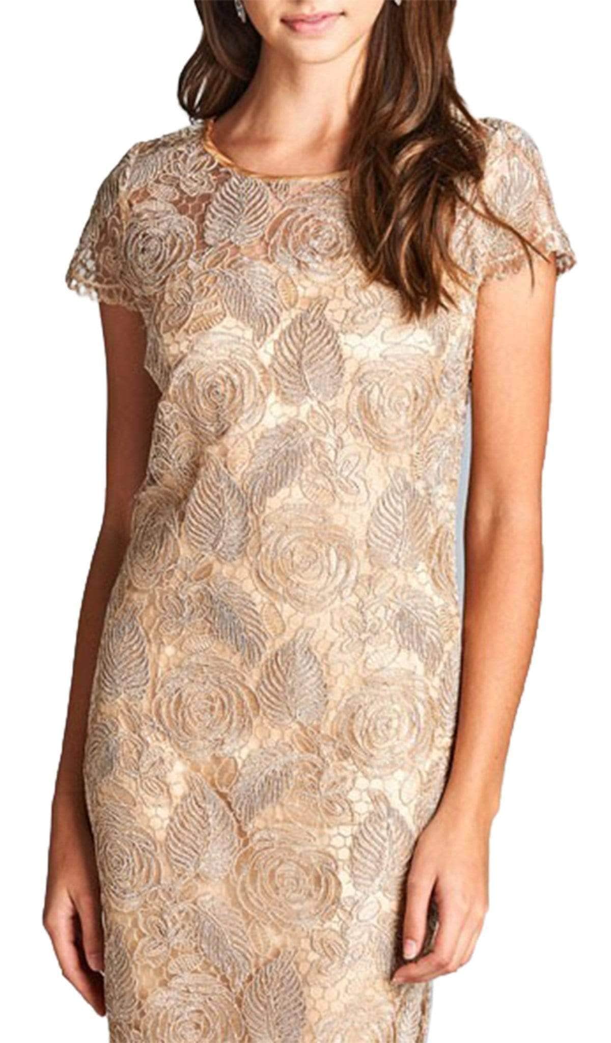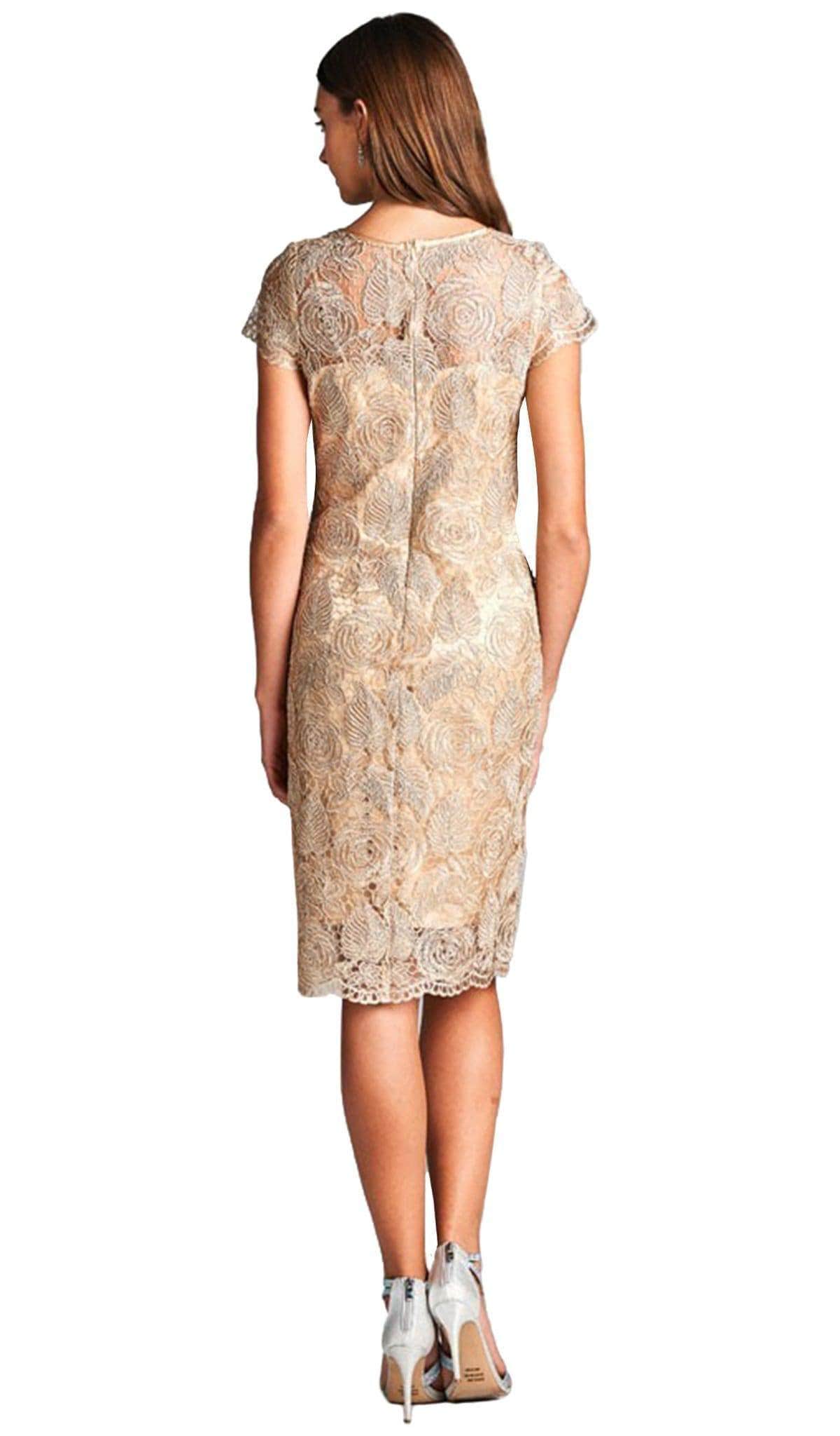 Elegantly beautiful short cocktail dress with lace leaf overlay. Features a jewel neck and short sleeves in semi-sheer yoke and shoulders. Designed in classy sheath silhouette this dress finishes at knee length hem. Model is wearing the Champagne color.