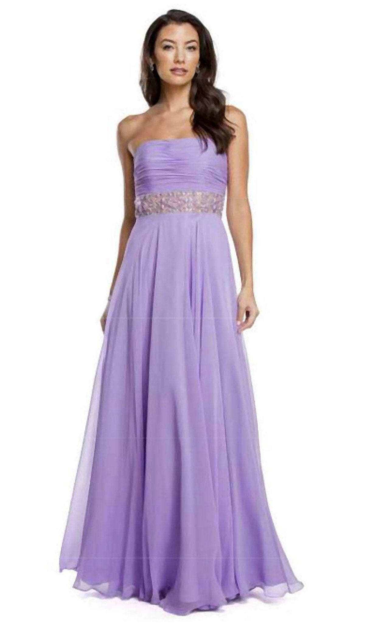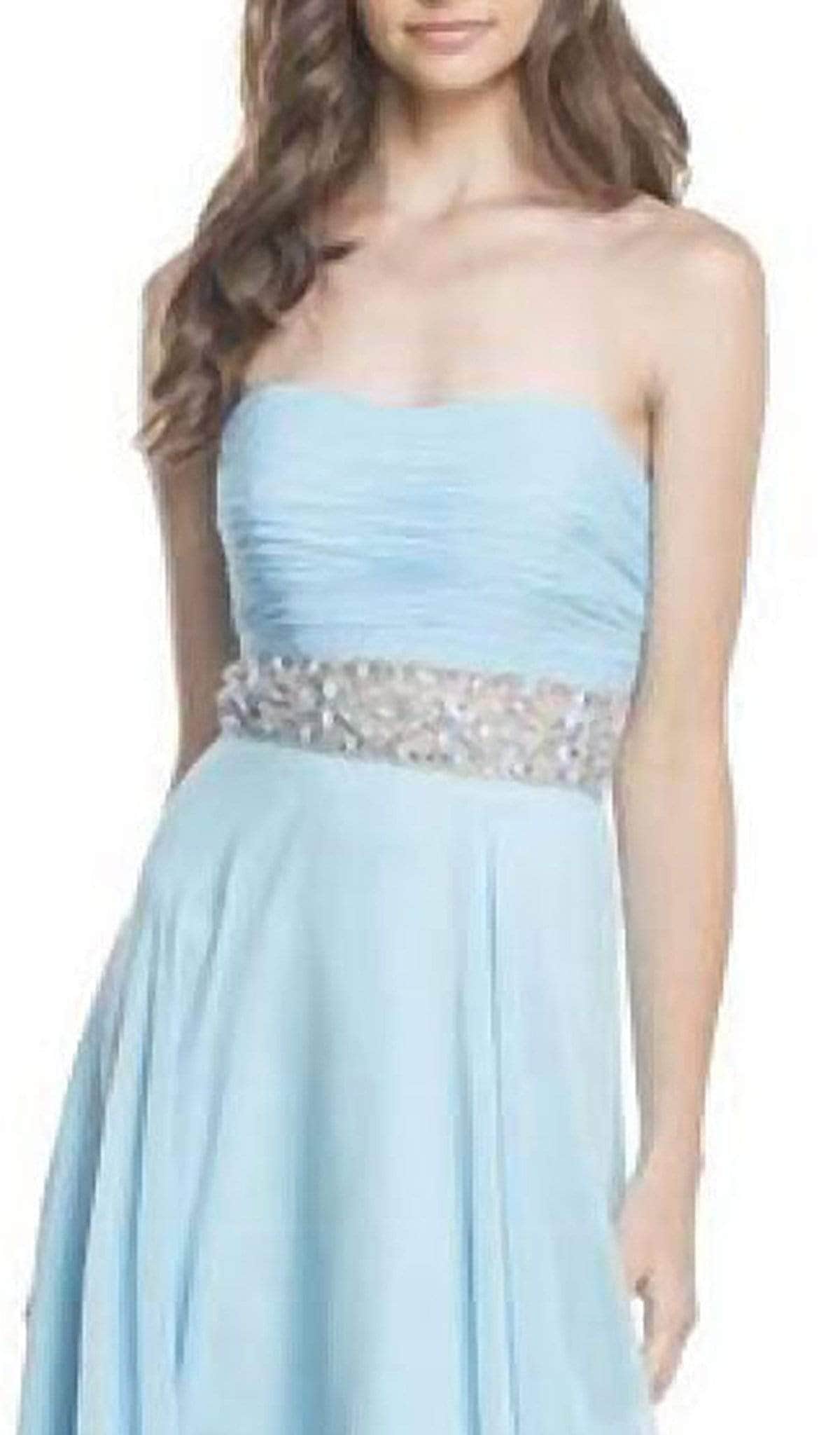 The strapless bodice is designed with pleating topped with a sweetheart neckline complemented with a mid-open back. The empire sheer waist is beautifully embellished with lovely accents. Wonderful pleats cascade through the A-line skirt of this absolutely awesome gown as a center zipper closure secures the back for a flattering fit. Models are wearing the Aqua, Lilac and Yellow colors.