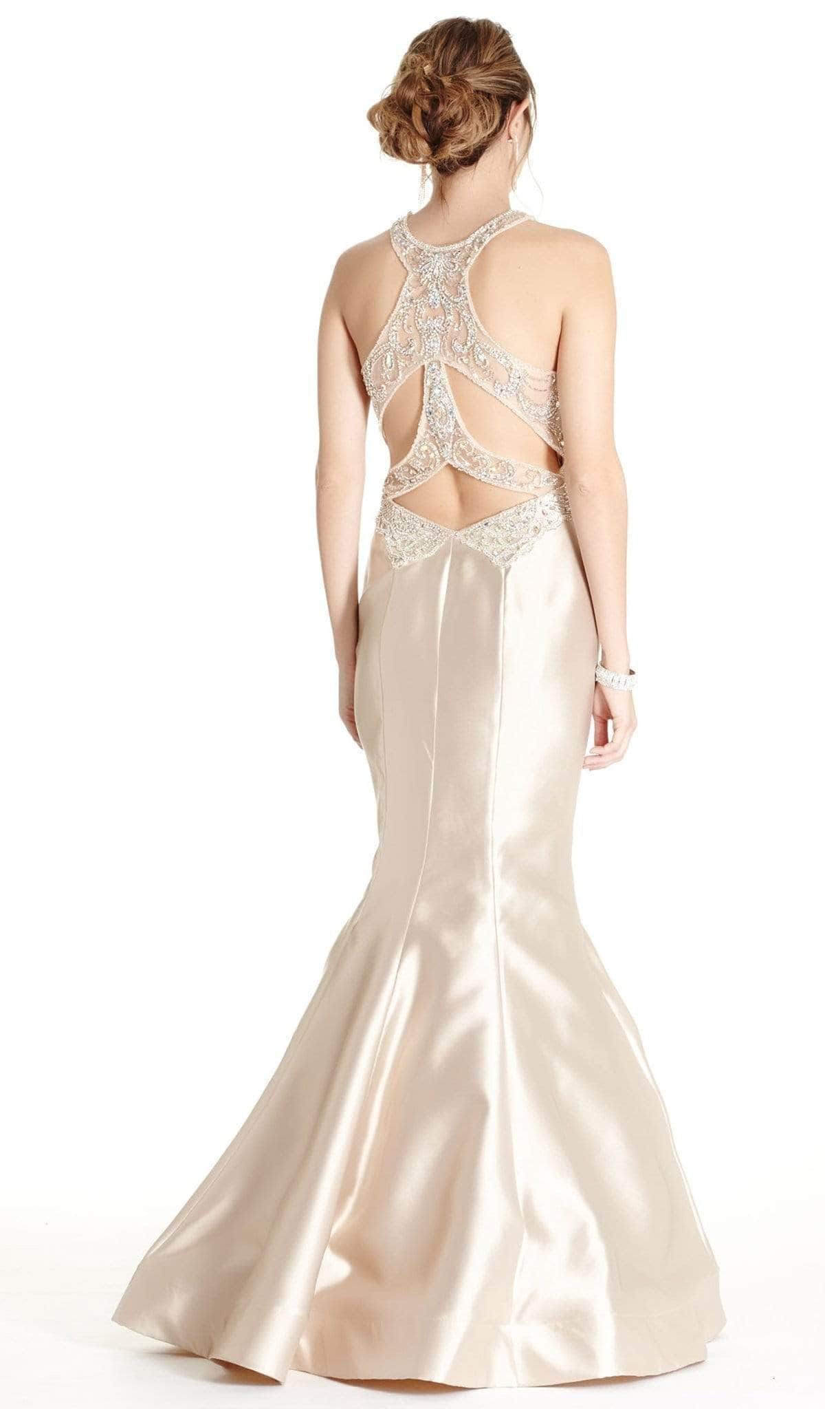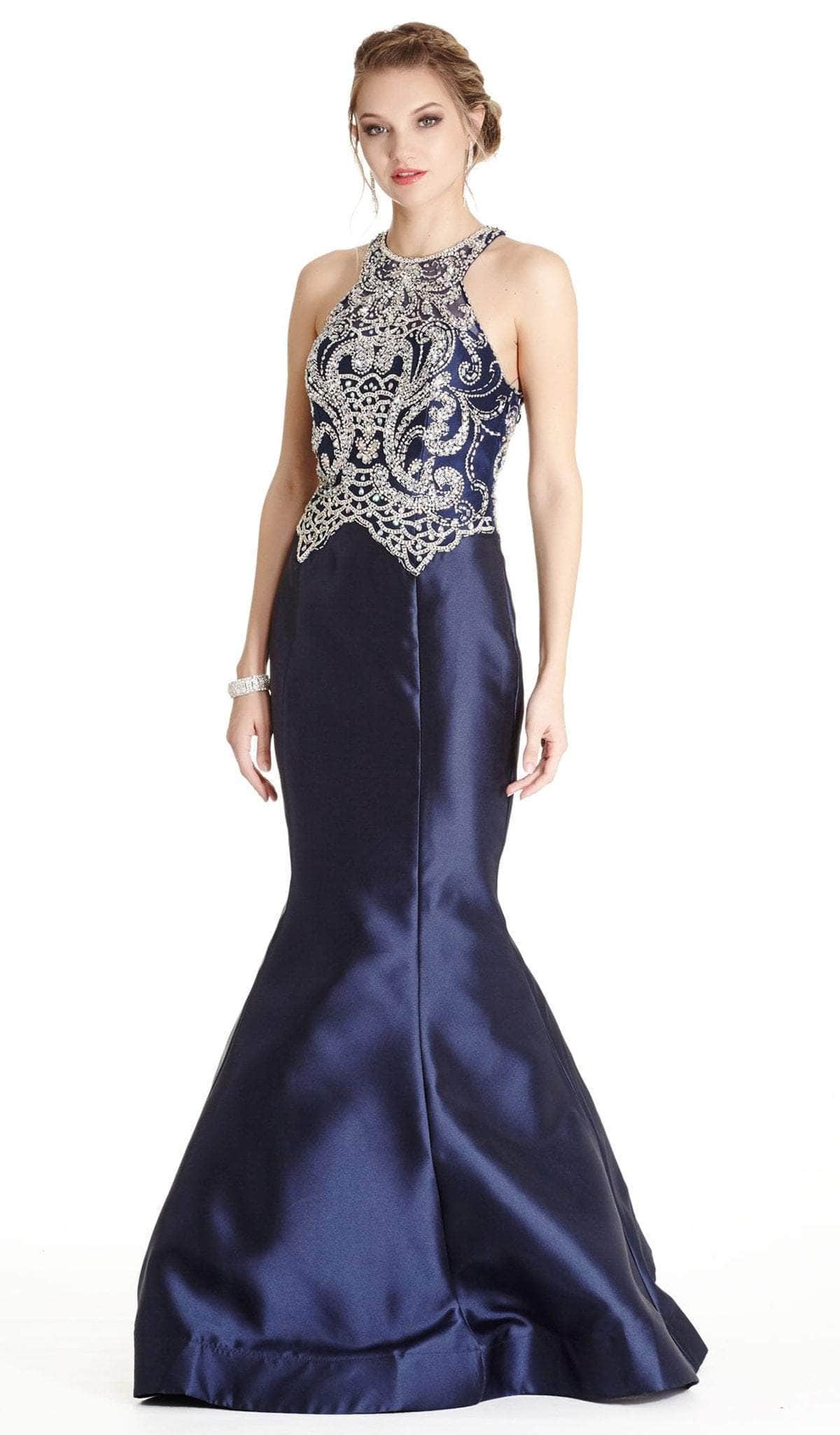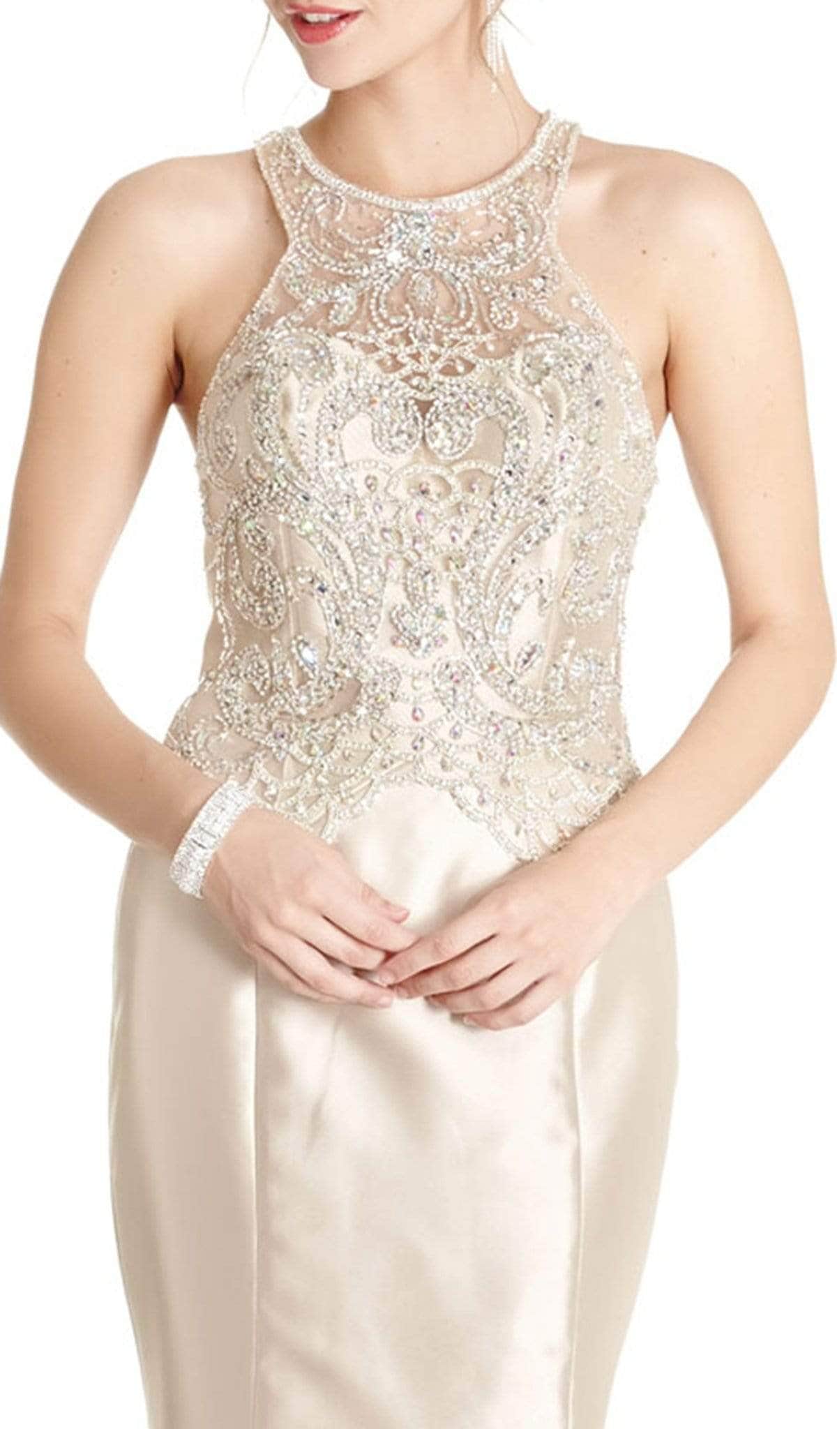 The bodice is styled in a sleeveless, halter neckline bedecked with glittering embellishments. The dress flaunts a strappy back. The skirt fits at the thighs and flares at the bottom. Models are wearing the Champagne, Fuchsia and Navy colors.