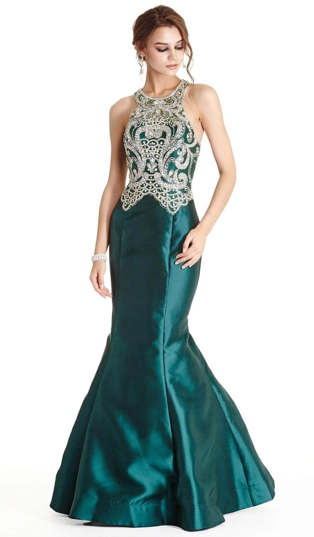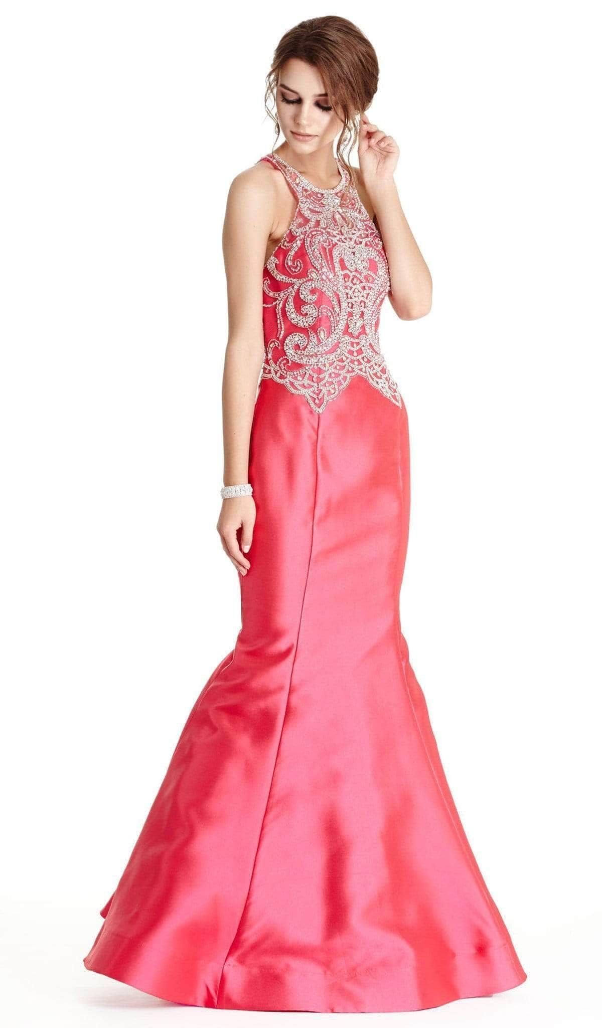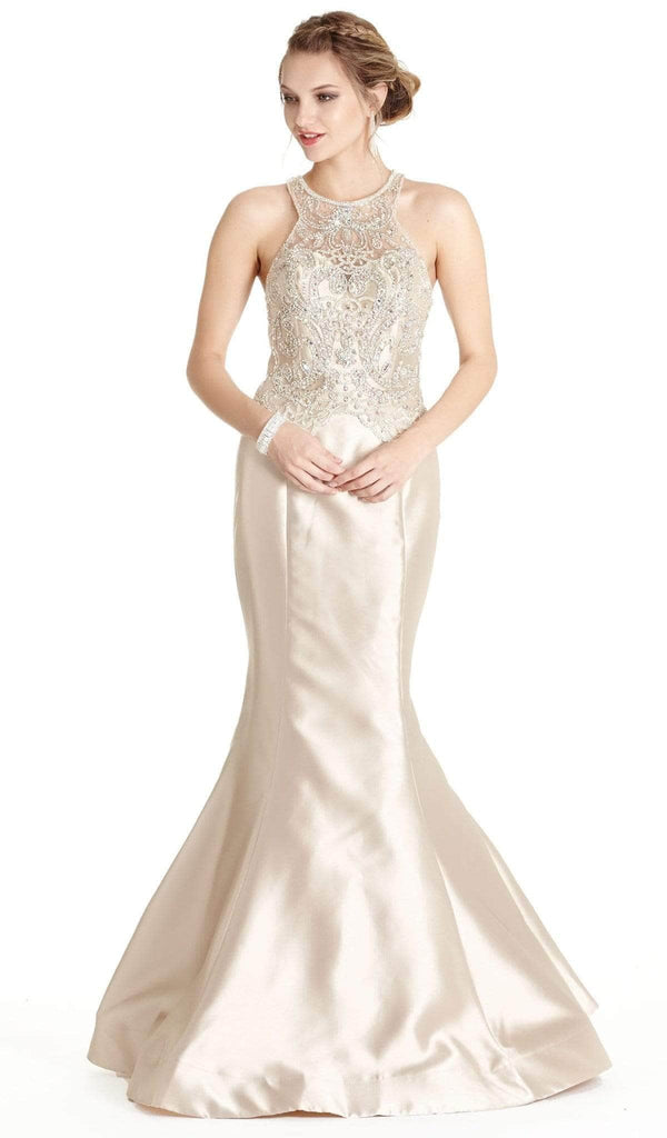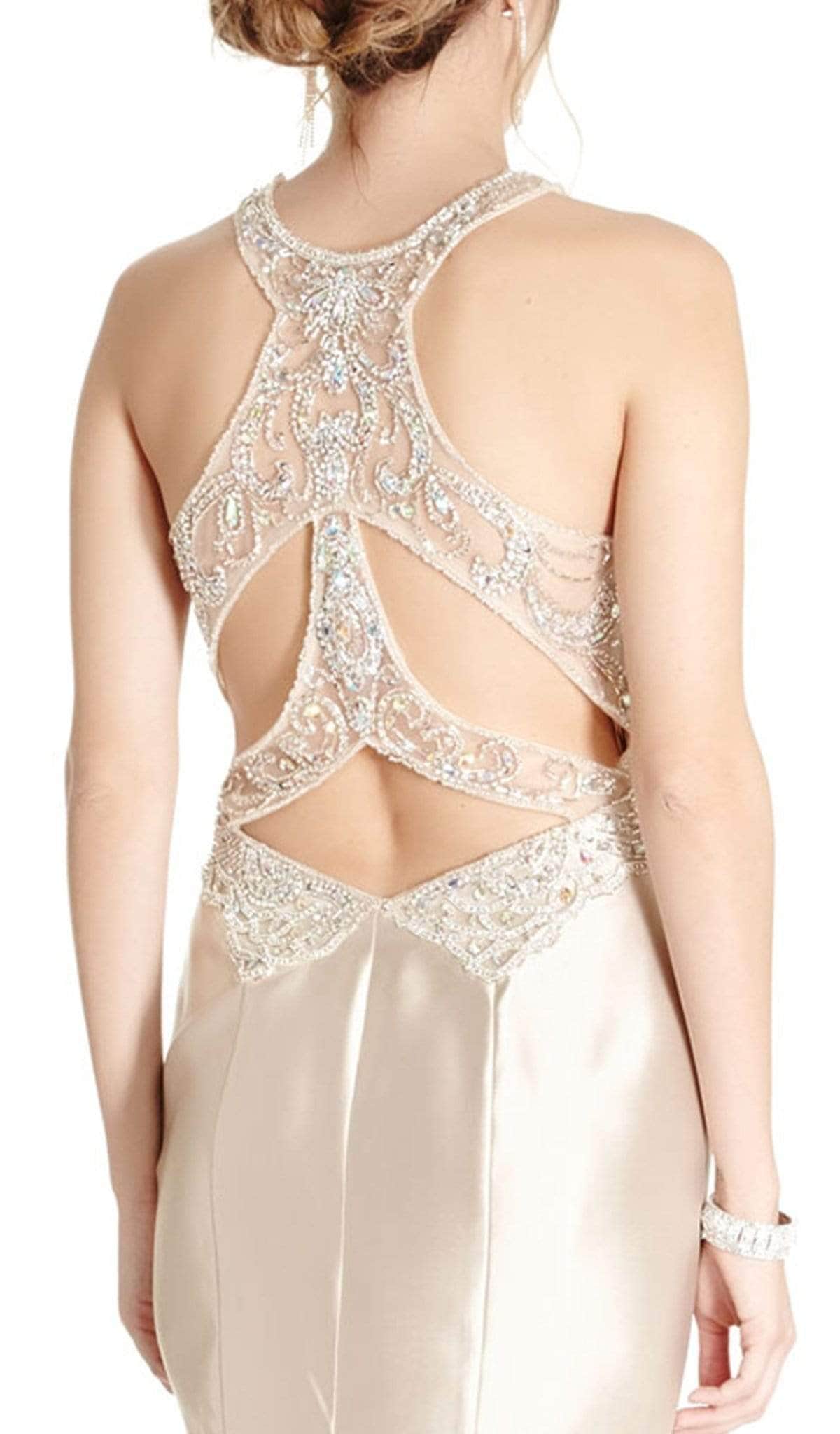 The bodice is styled in a sleeveless, halter neckline bedecked with glittering embellishments. The dress flaunts a strappy back. The skirt fits at the thighs and flares at the bottom. Models are wearing the Champagne, Fuchsia and Navy colors.