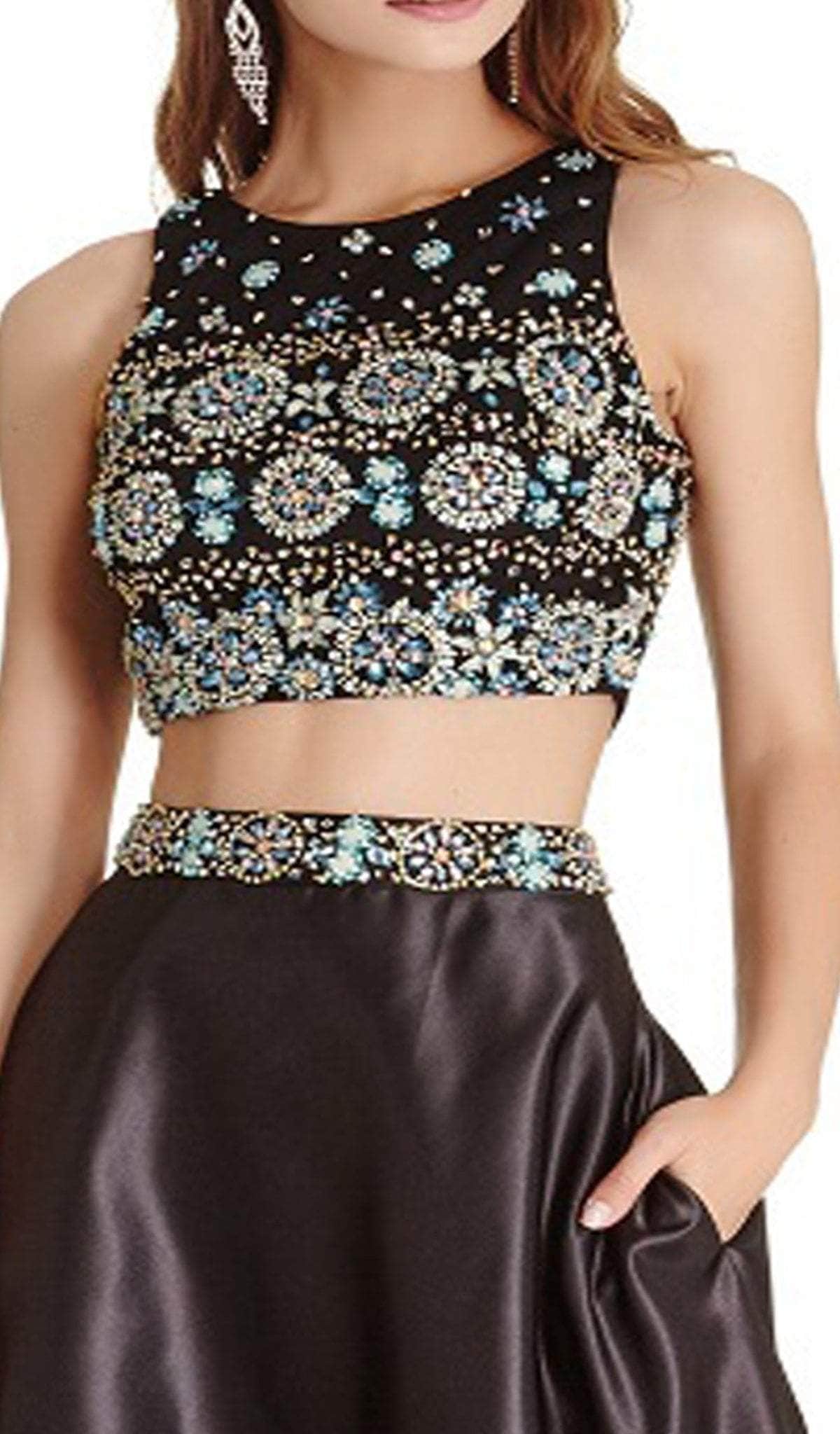 | Details: | Two piece, Sleeveless, Crop top, Embellished top and waist, A-line skirt, Pockets |