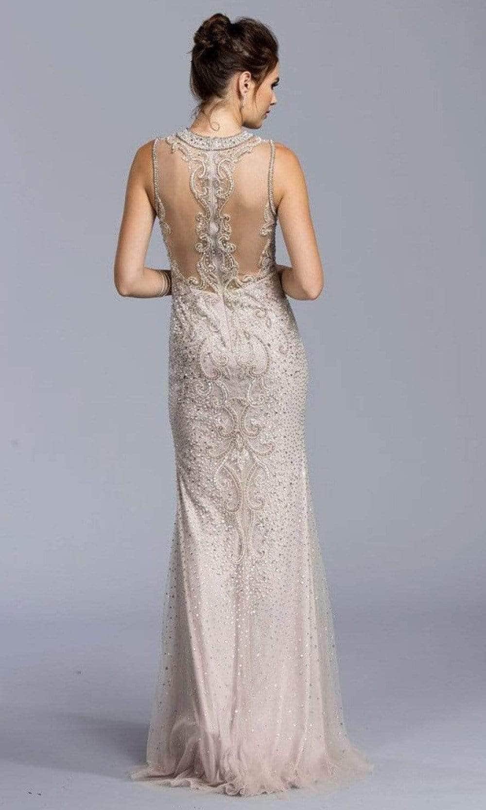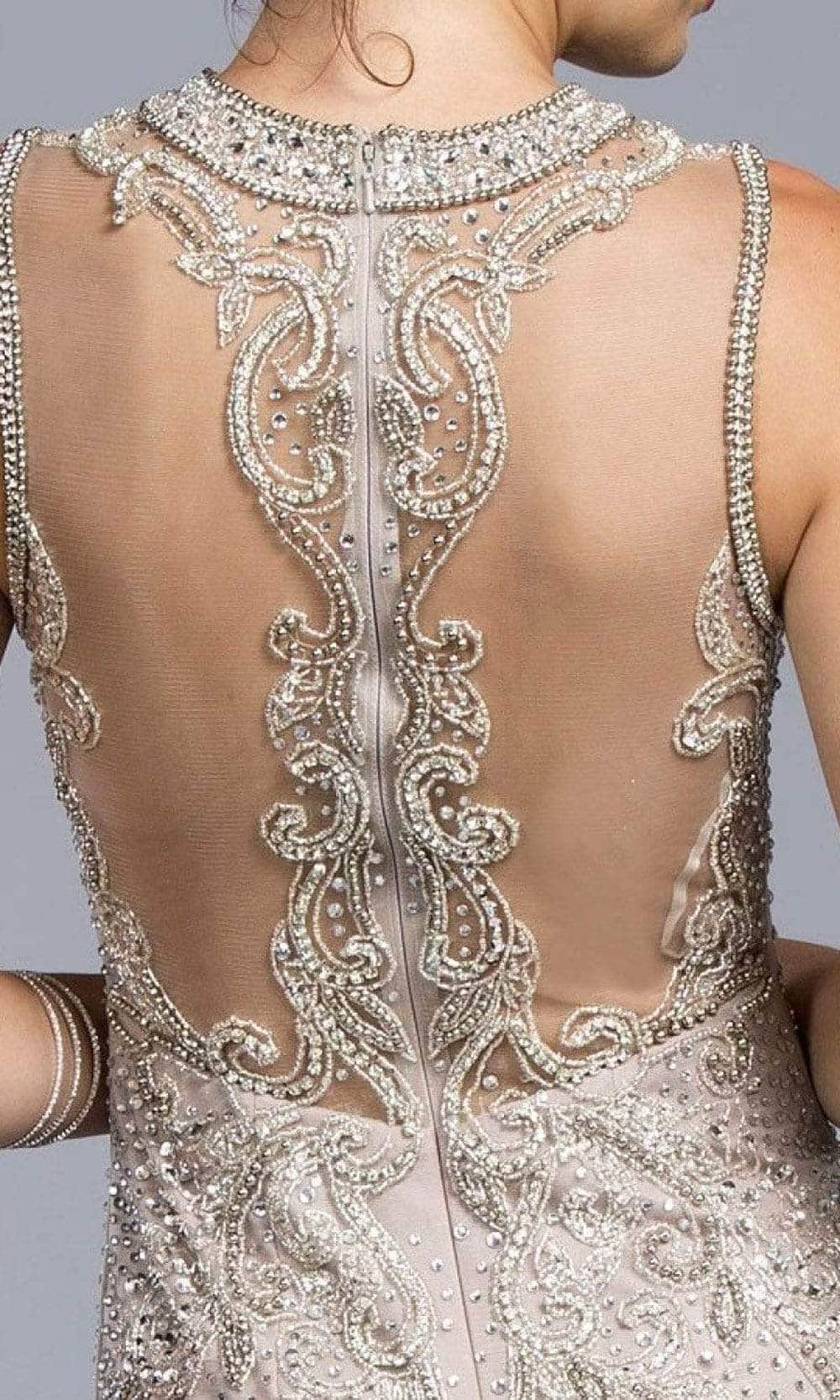 Embellished with an intricate spectacle of beadwork, this piece reveals a sheer jewel neckline on a sleeveless bodice. The back has an illusion style and a zipper closure. The mermaid skirt sparkles as it flares into a full-length finish. Model is wearing the Champagne color.