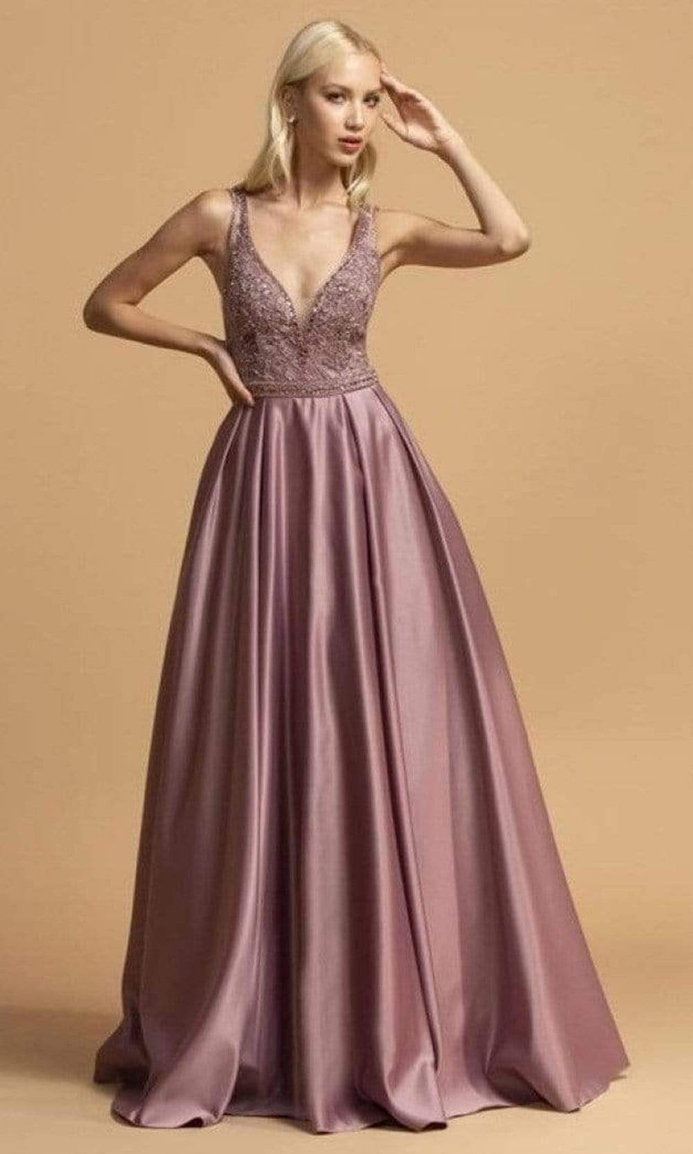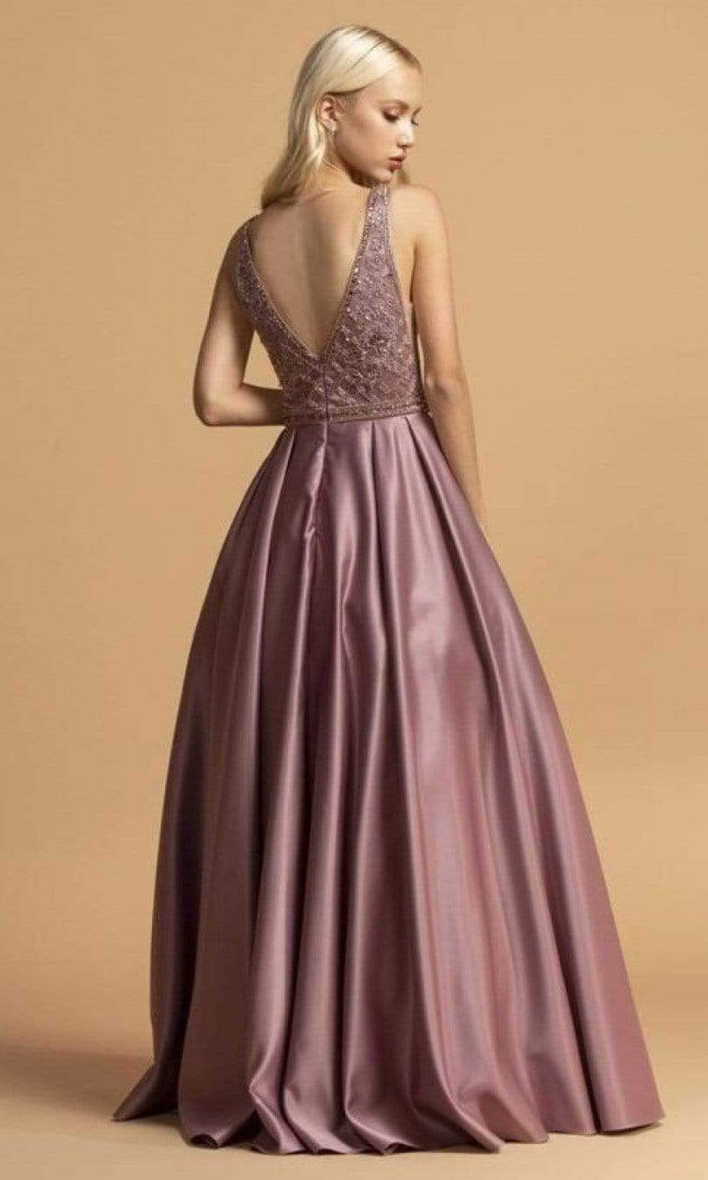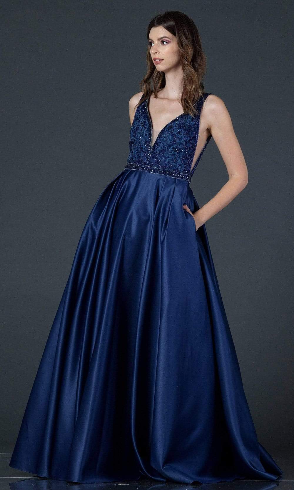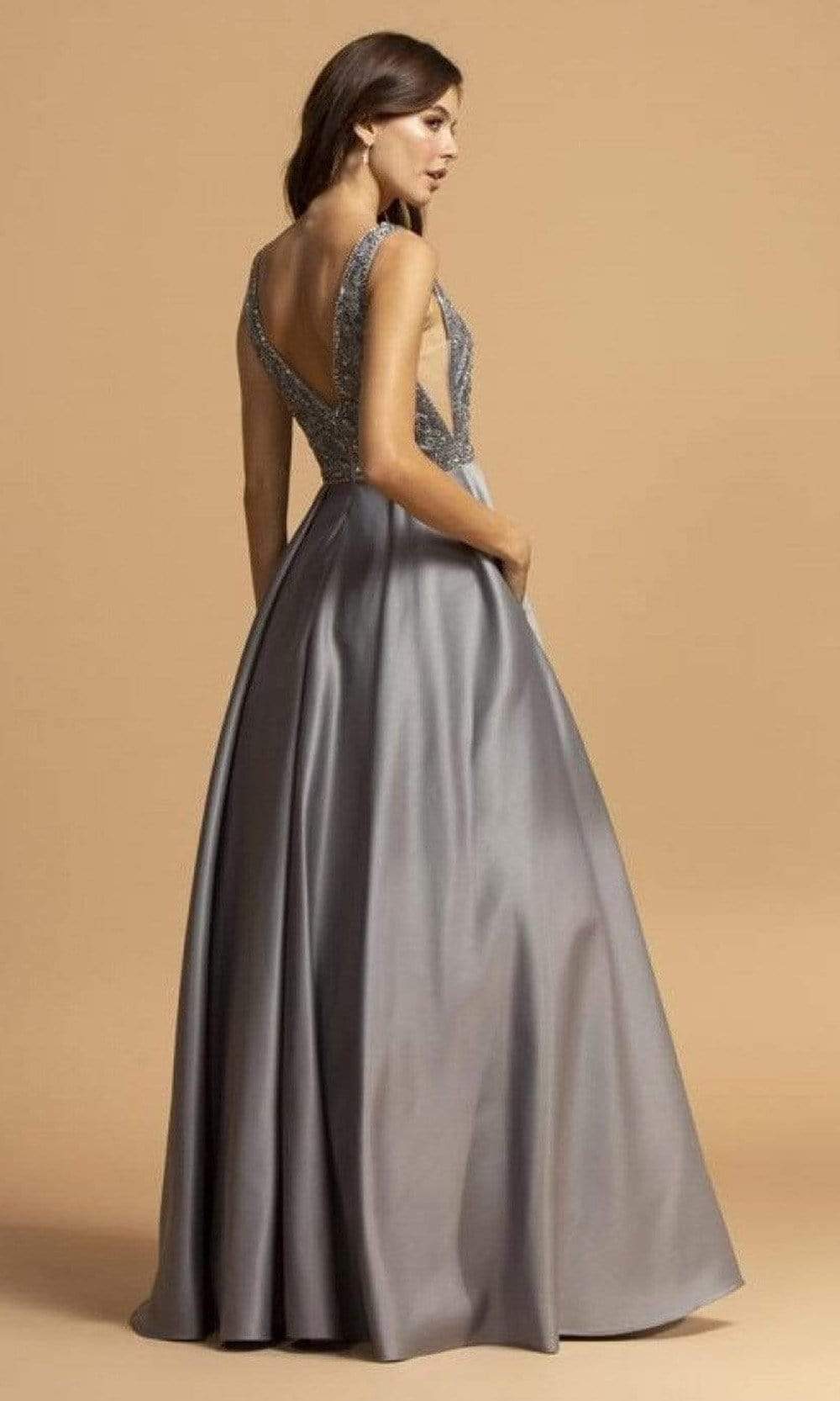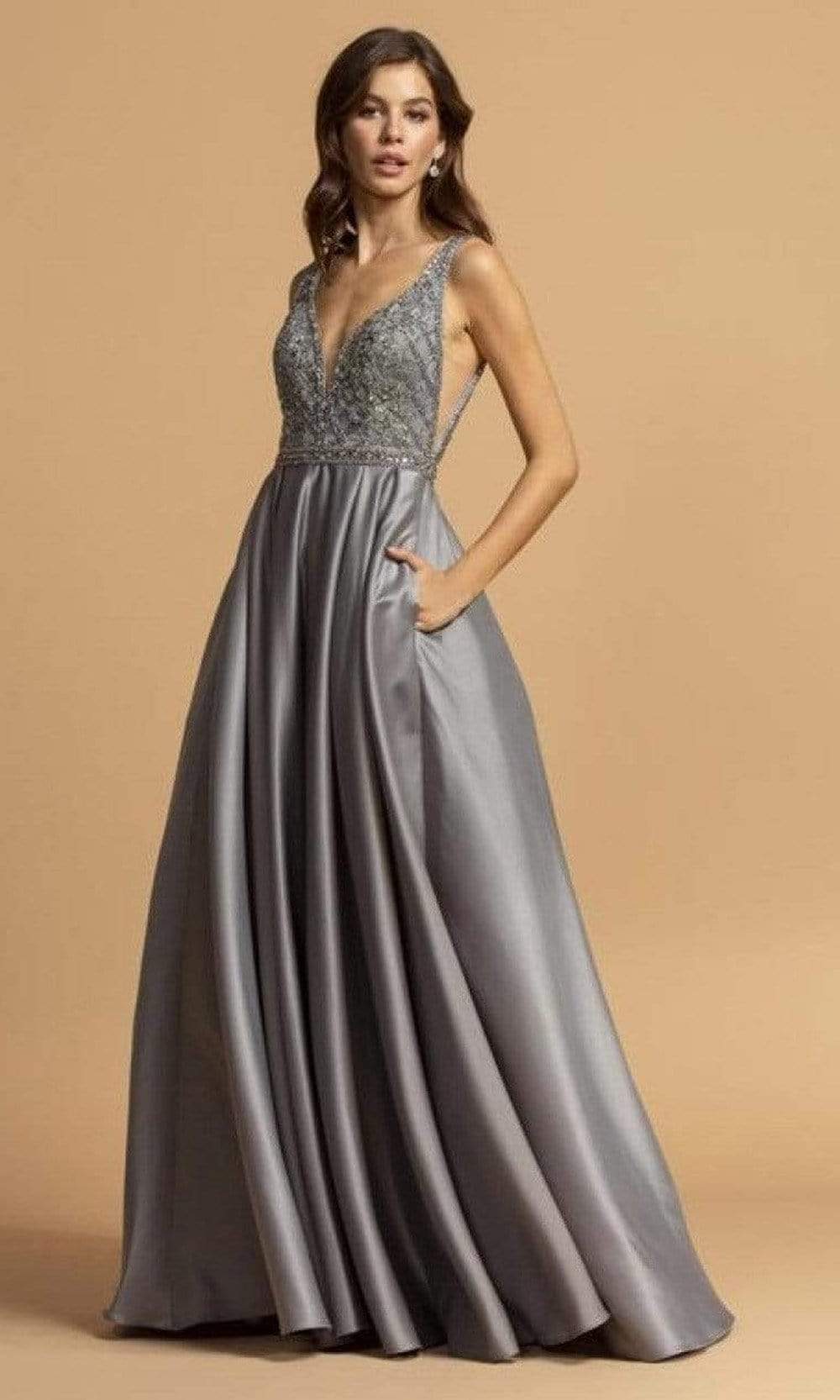 Aspeed Design - L2001 Embroidered Deep V Neck Satin A-Line Gown