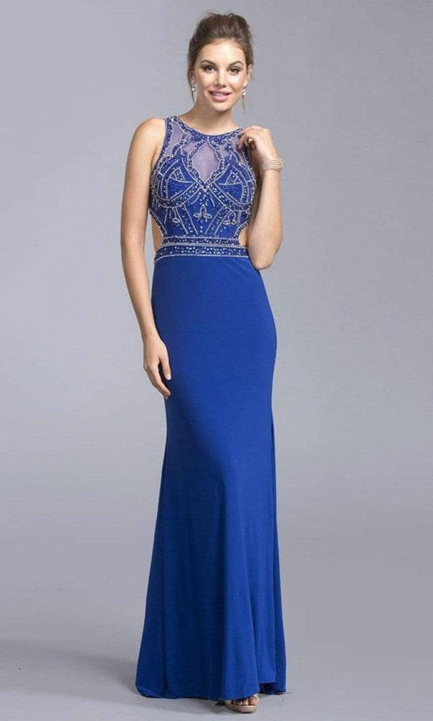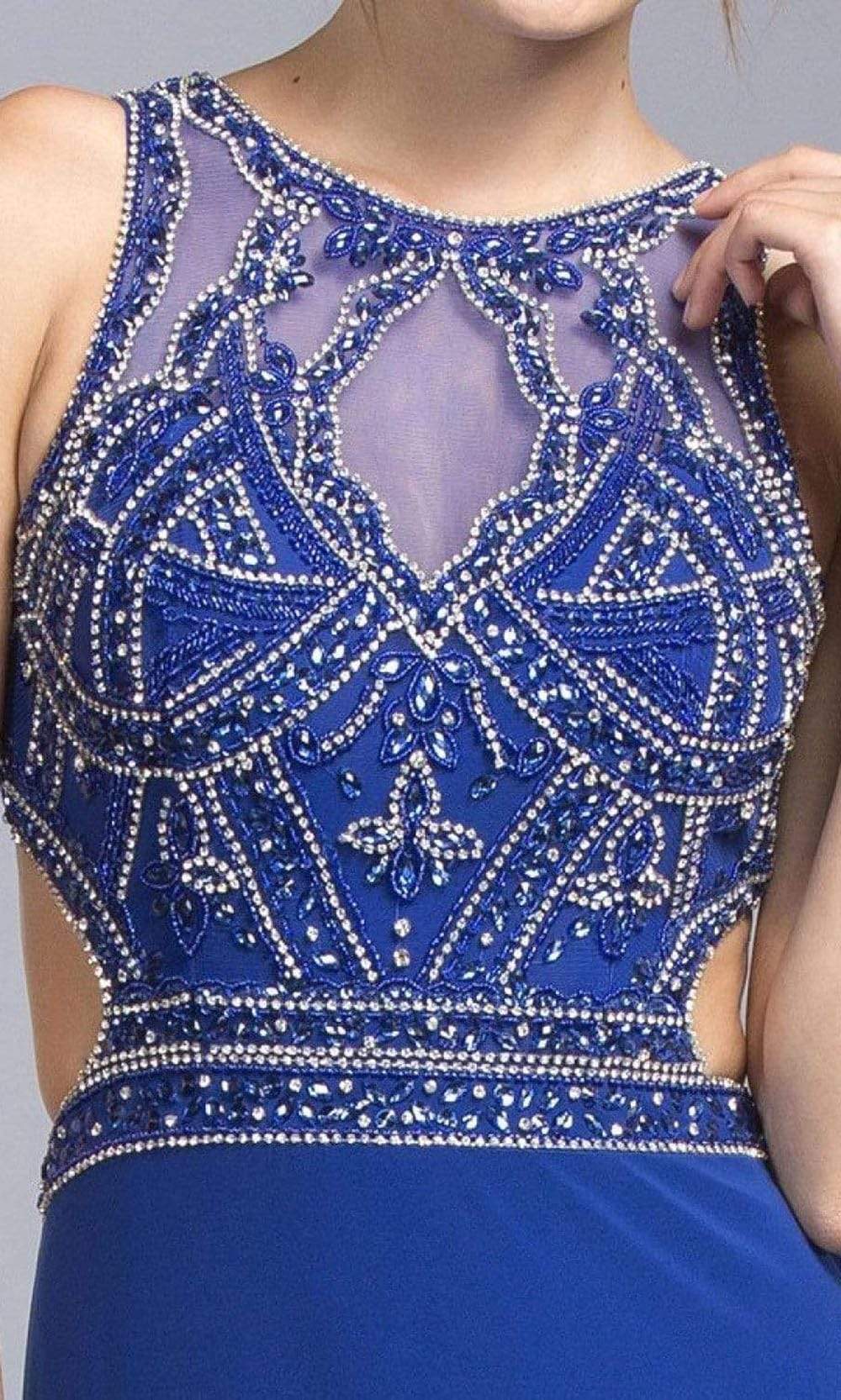 | Details: | Sleeveless, Illusion, Cut outs, Beads, Fitted bodice, Open back, Back zipper, Floor length, Sweep train |