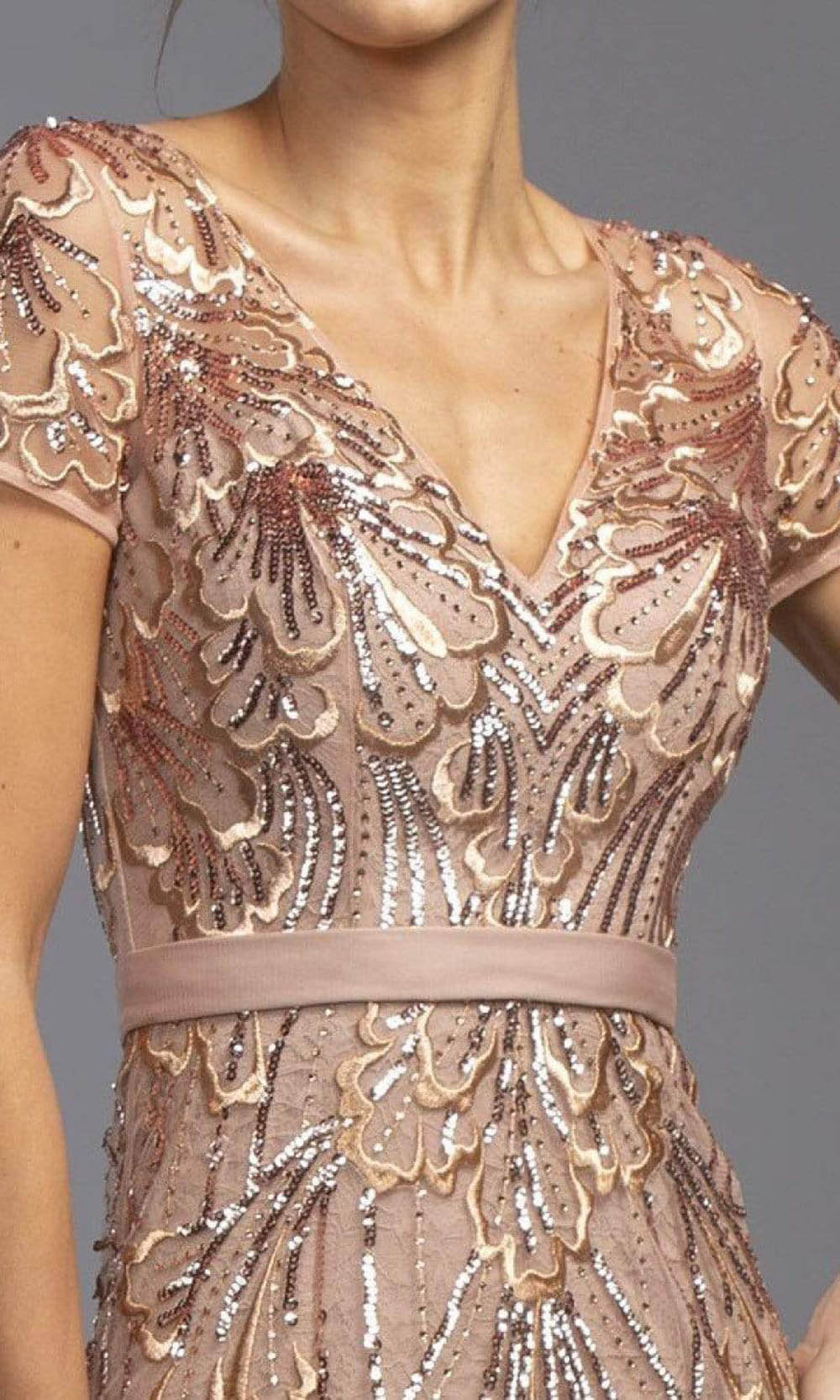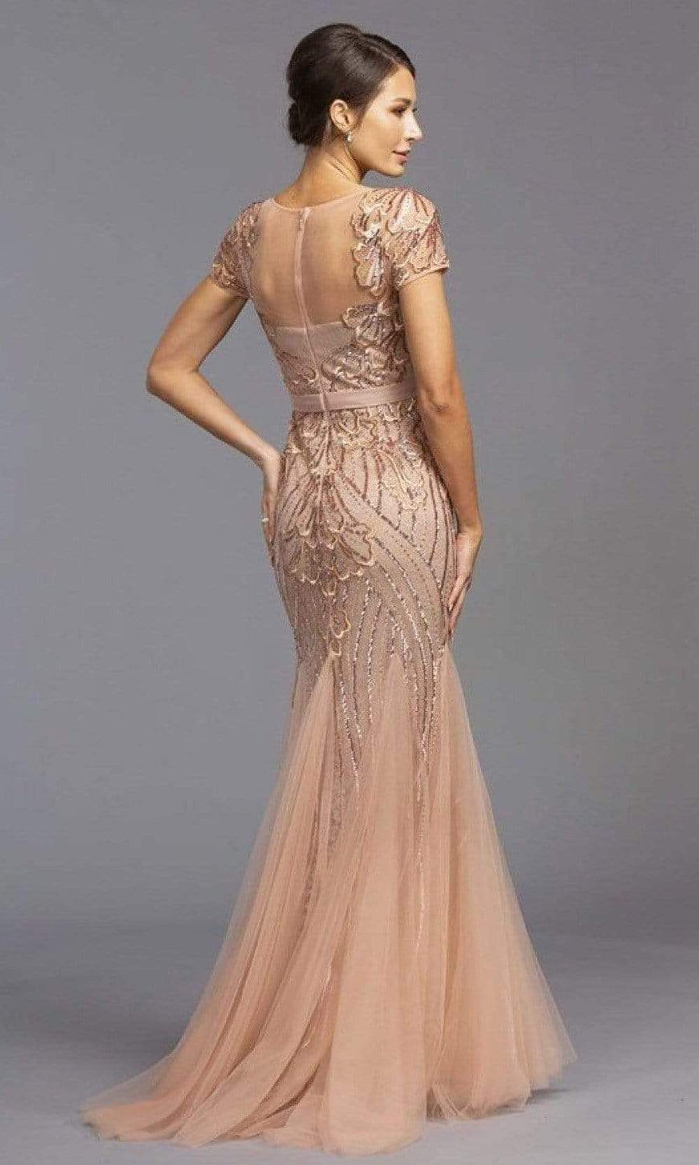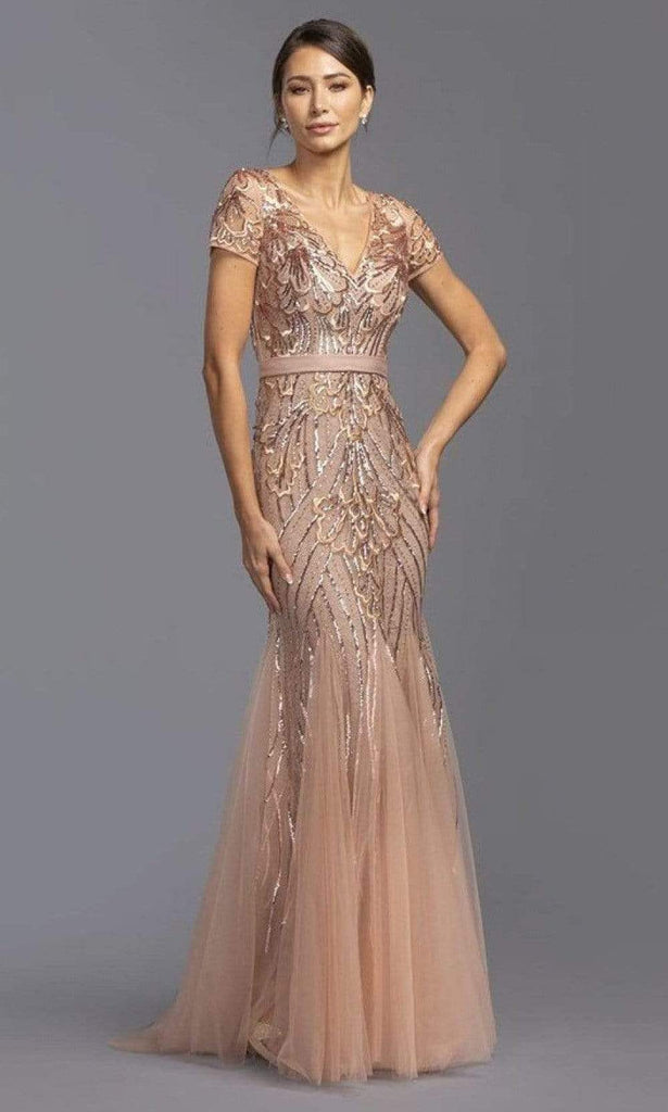 Be impressed by the iridescent style of this Aspeed Design L2068 creation. Impressively ornate with embroidery and sequins, this short sleeve dress flaunts a v neckline with an illusion back. Streaming with embellishments and godets, the skirt glamorously flares into a mermaid silhouette and train. Show off that stunning pair of legs in this Aspeed Design masterpiece. Model is wearing the Dusty Rose color.