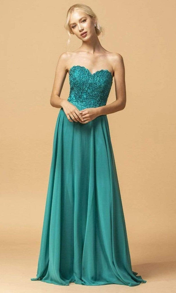 Exude a romantic flair at your stunning event in this Aspeed Design L2073 creation. Flatteringly shimmering with rhinestones and embroidered details, this strapless dress creates a sweetheart neckline with a midrise back. The chiffon skirt flow into a floor length hemline with a train. Strike a pose in this Aspeed Design masterpiece. Model is wearing the Jade color.