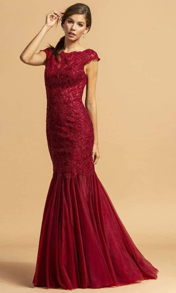 Bring about the sparkle of interest into the eyes of many in this Aspeed Design L2093 creation. Adorned with lace appliques topped beadwork, this dress shows cap sleeves and a bateau neckline. This figure-flattering stunner showcases a plunging scoop neckline as the trumpet skirt streams into a train. Deck yourself out in unparalleled style with this Aspeed Design masterpiece. Models are wearing the Burgundy and Navy colors.