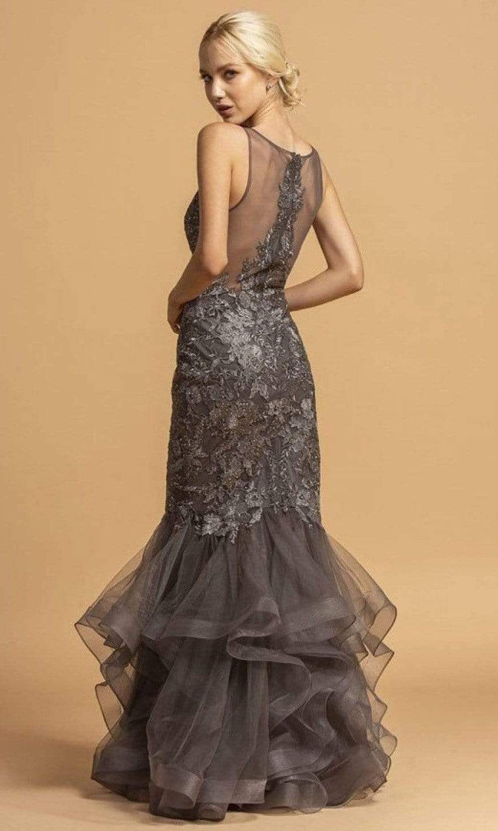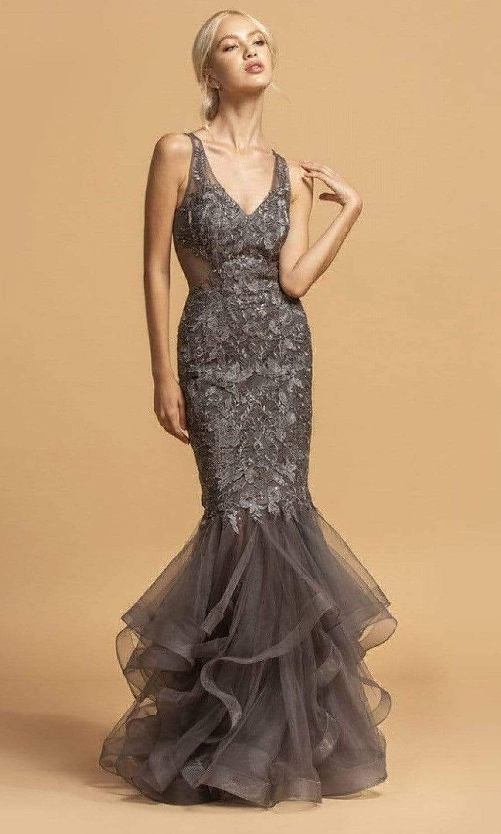 Take their breath away with this stunning Aspeed Design L2116 evening dress. This dress displays a V-neckline in an embroidered sleeveless evening dress. The skirt reveals a trumpet silhouette while having a full back with back zipper closure. Get noticed in any crowd wearing this Aspeed Design creation. Model is wearing Charcoal color.