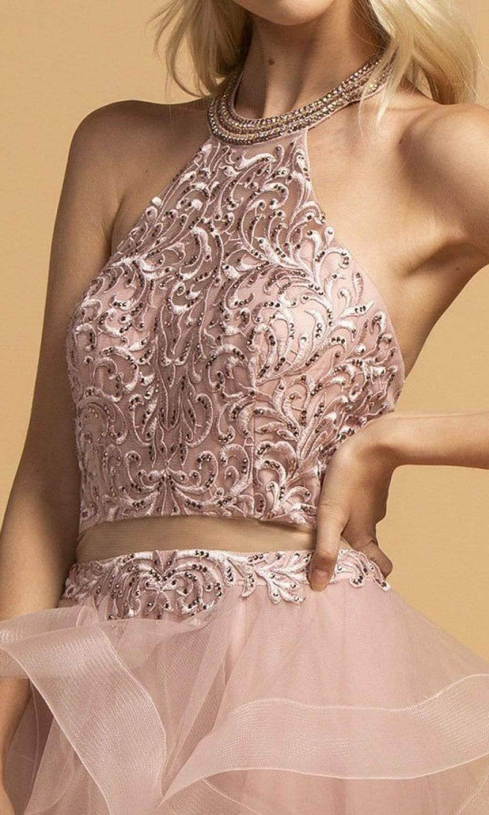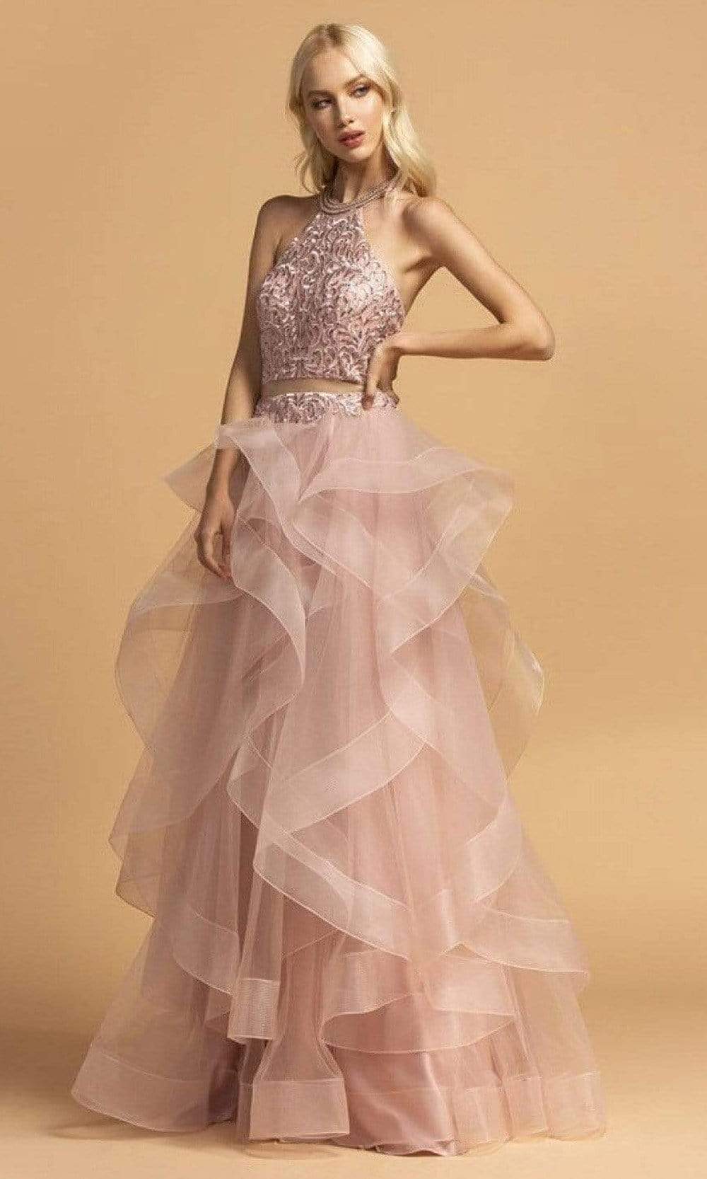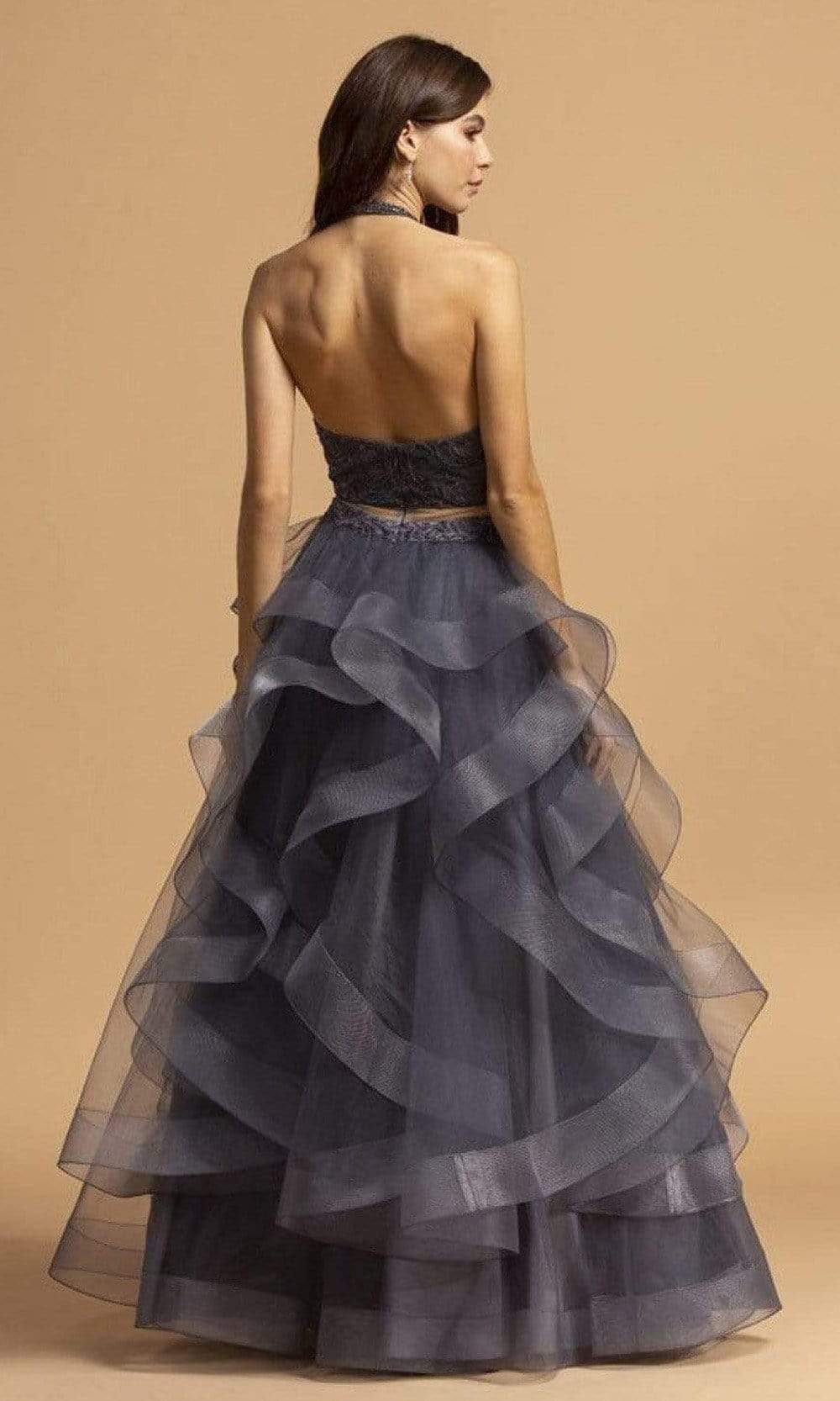 Flaunt an iridescent style that fascinates in this Aspeed Design L2147 creation. Glimmering with rhinestones and embroidered details, this two-piece stunner shows a halter neckline with an open back. The tiered skirt flourishes an A-line silhouette and ends with ruffled horsehair hemlines. Claim your right to be at the top in this Aspeed Design masterpiece. Models are wearing the Charcoal and Dusty Blush colors.
