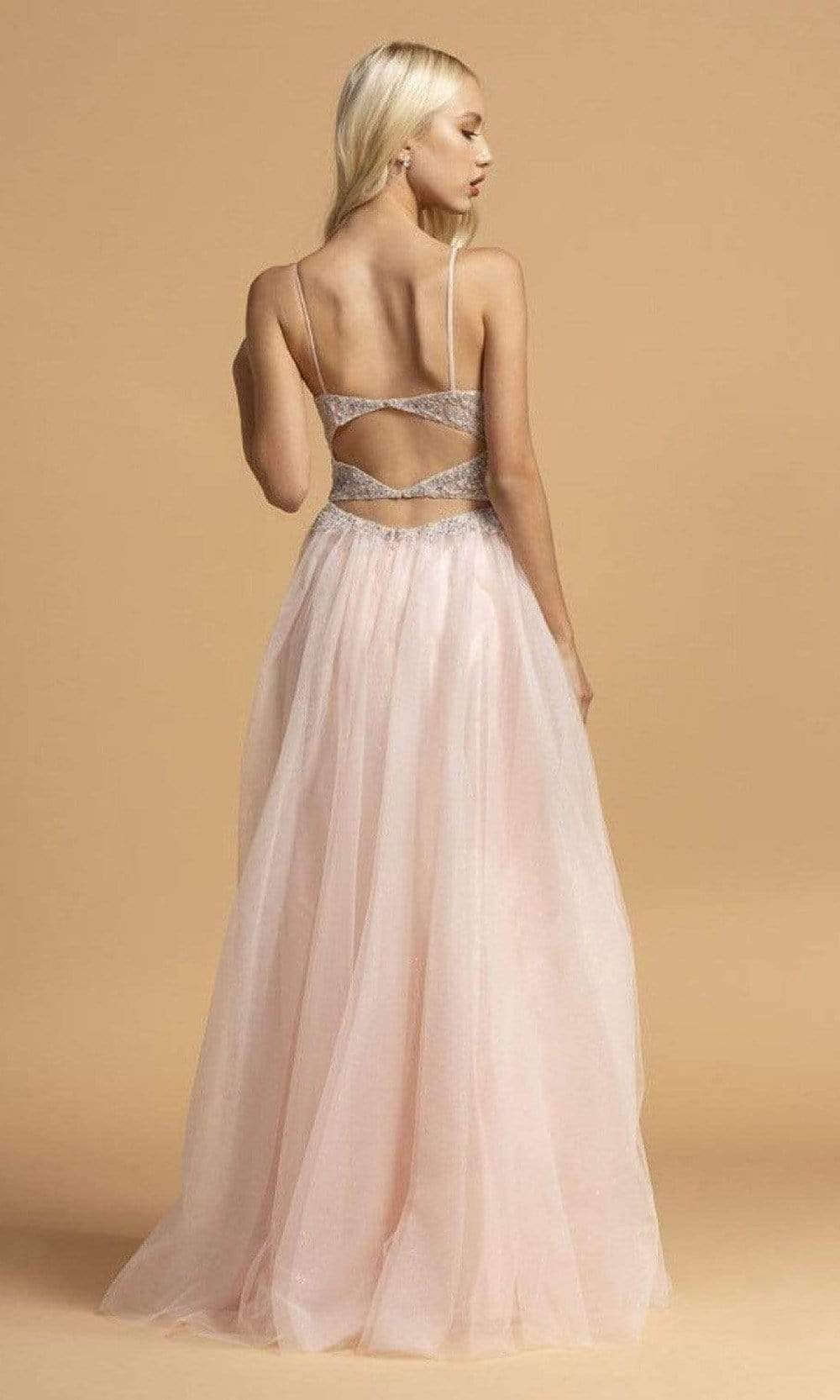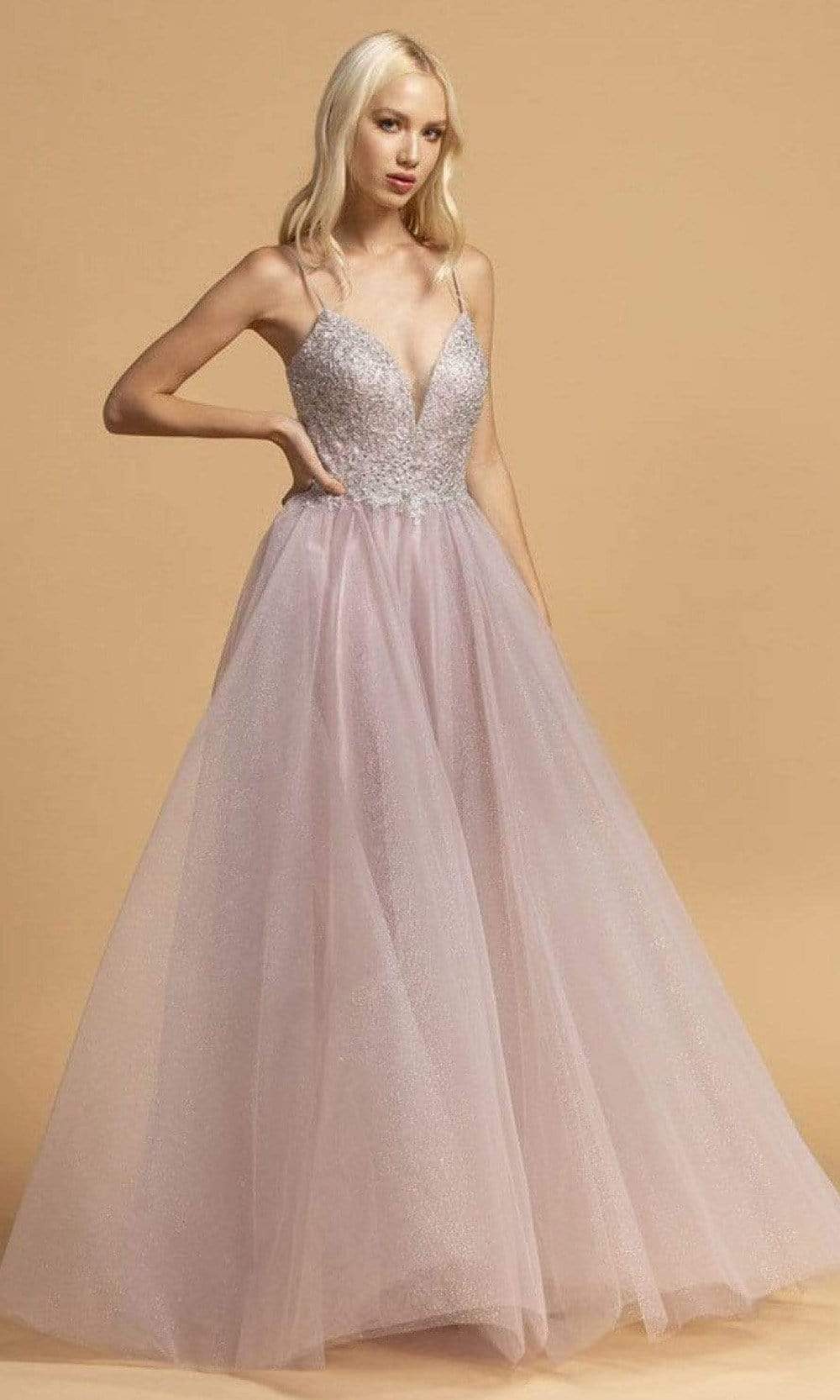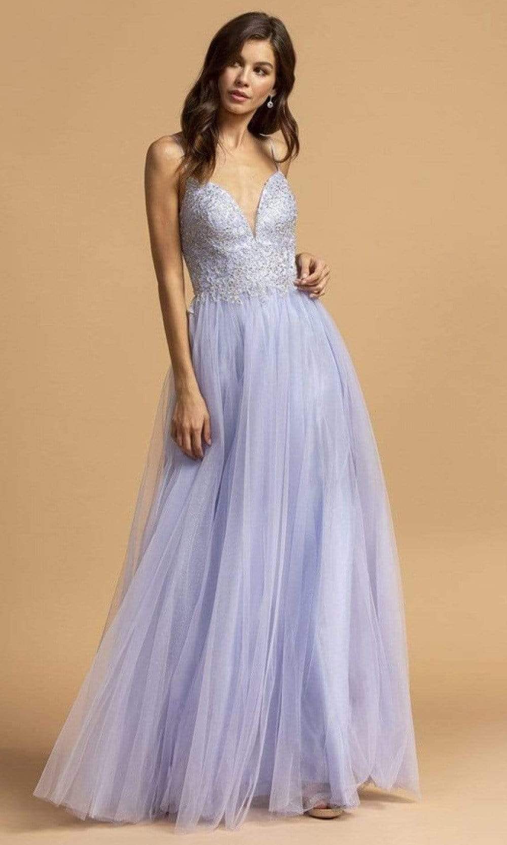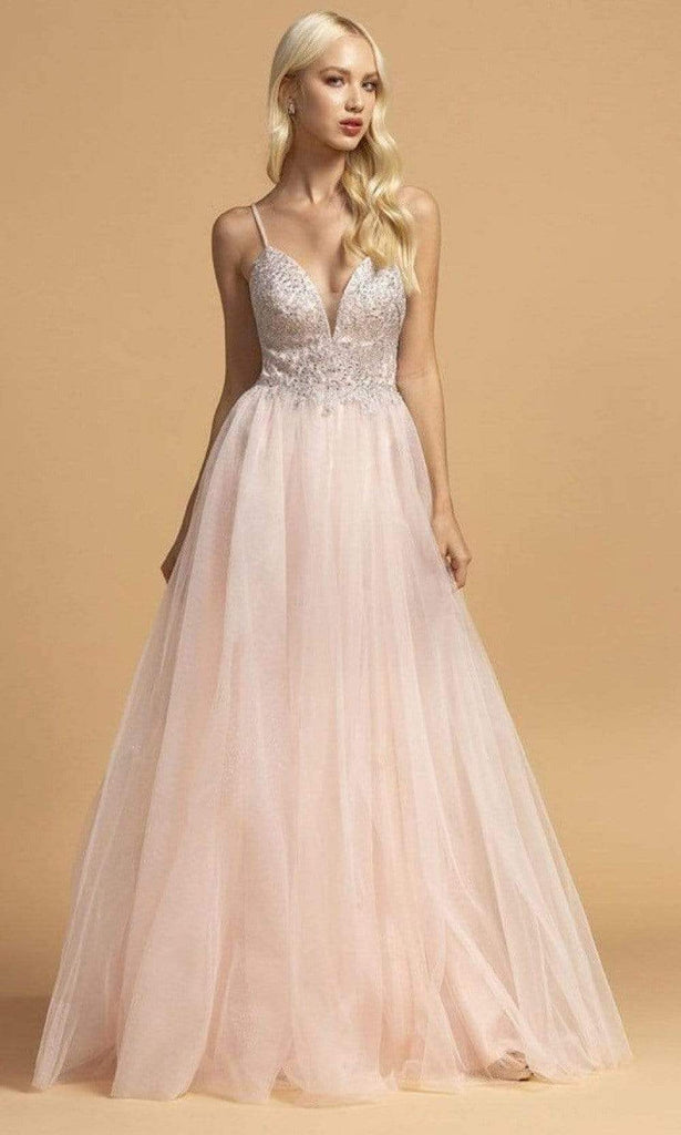 Be held in esteem when you show up in this Aspeed Design L2150 creation. Glimmering with rhinestones and lace details, this spaghetti strap dress shows a plunging v-neckline and a sheer inset. The back reveals double cutout accents. The glittering tulle skirt streams into an outstanding silhouette with a train. Get noticed in this Aspeed Design masterpiece.