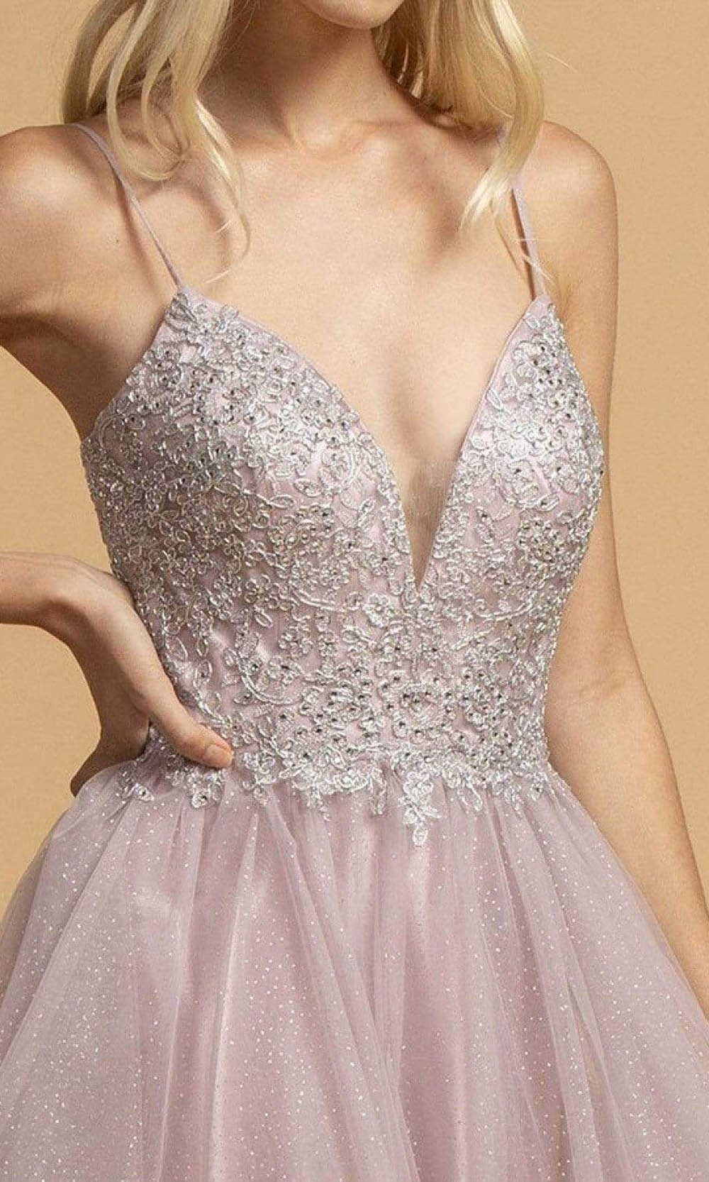 | Details: | Tulle, Spaghetti Straps, Illusion Inset, Double Cutout Back, Glitter Skirt, Sweep Train |