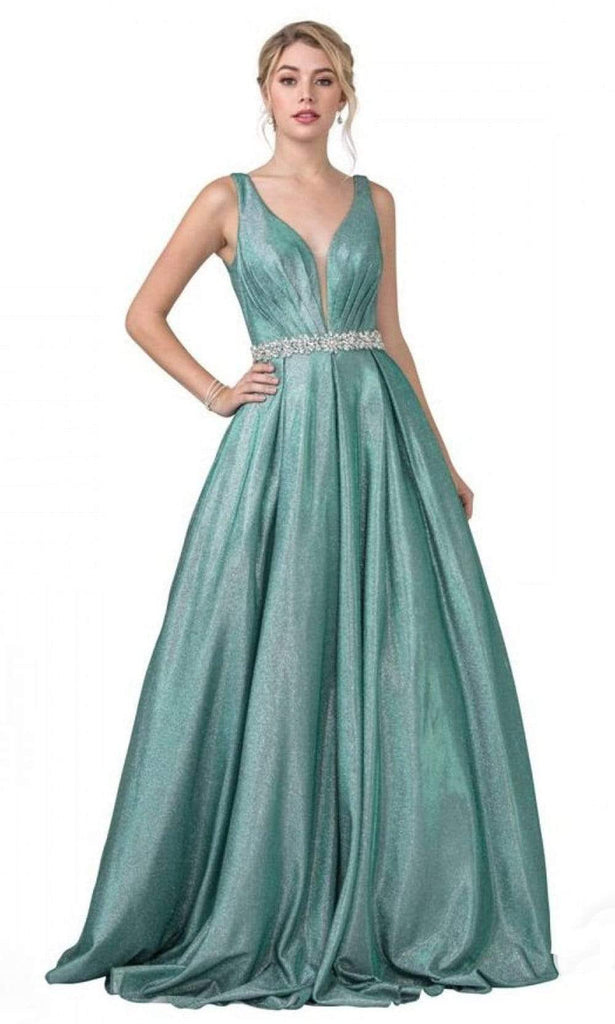 Fall in love with the iridescence and style of this Aspeed Design L2200 creation. Accented with pleats gathering on a sleeveless bodice, this dress reveals a plunging v-neckline with a sheer inset. A bejeweled patterned band wraps the waist as a v-style opening graces the back. The skirt flares into a glittering silhouette with a train. Reflect a sterling sense of style in this Aspeed Design masterpiece. Models are wearing the Royal and Sea Green colors.