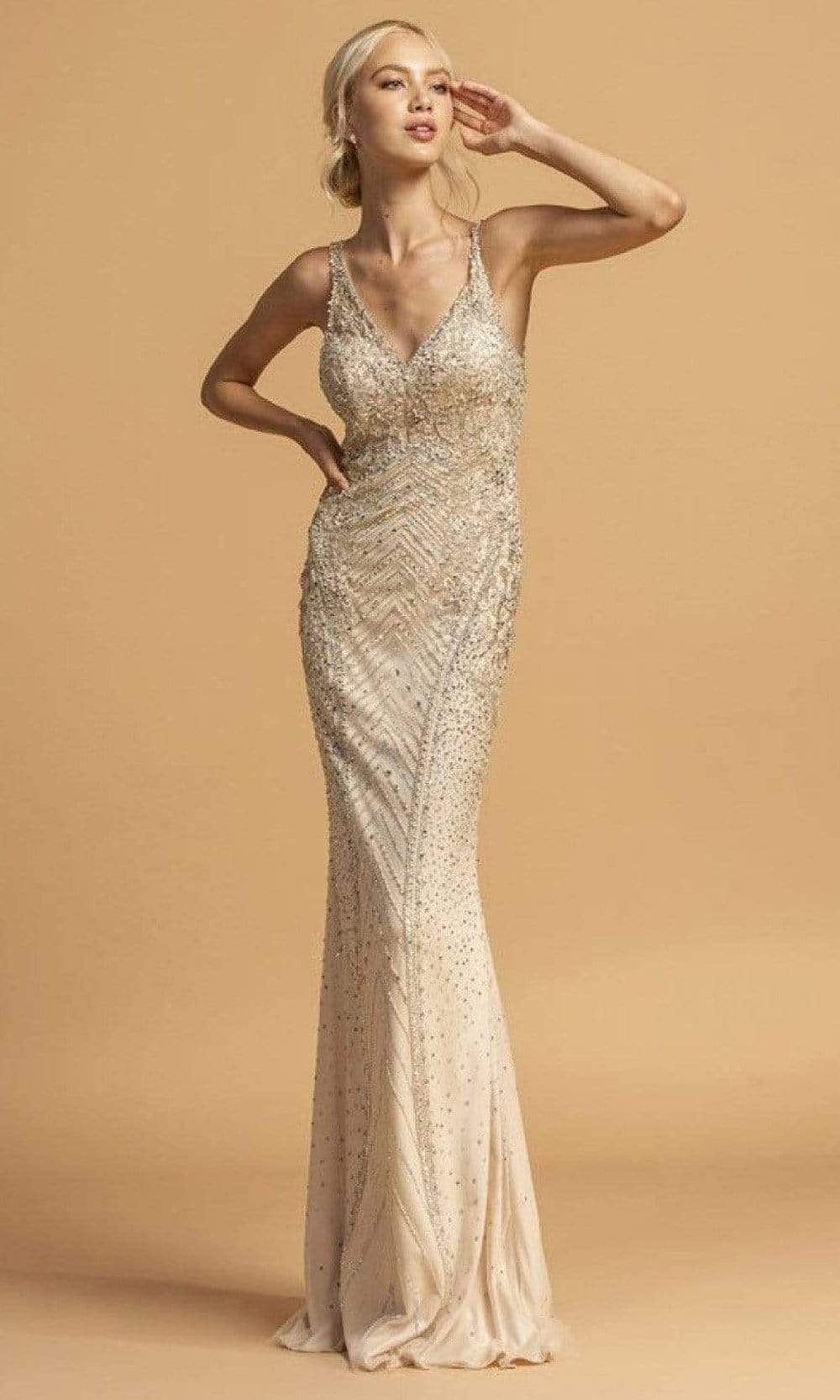 Get glamorous underneath the modern and classic detailing on the sheath silhouette Aspeed Design L2228 dress. This dress is simply breathtaking with its deep v-neck neckline and sleeveless. This dress is designed with beautiful embellishment like sequins, beads and rhinestones that will surely make you shine through the night. This long dress has a low v-back to show some skin for sexy and seductive look. It also has a back zipper for closure. Experience the outstanding effect in this gown by Aspeed Design.