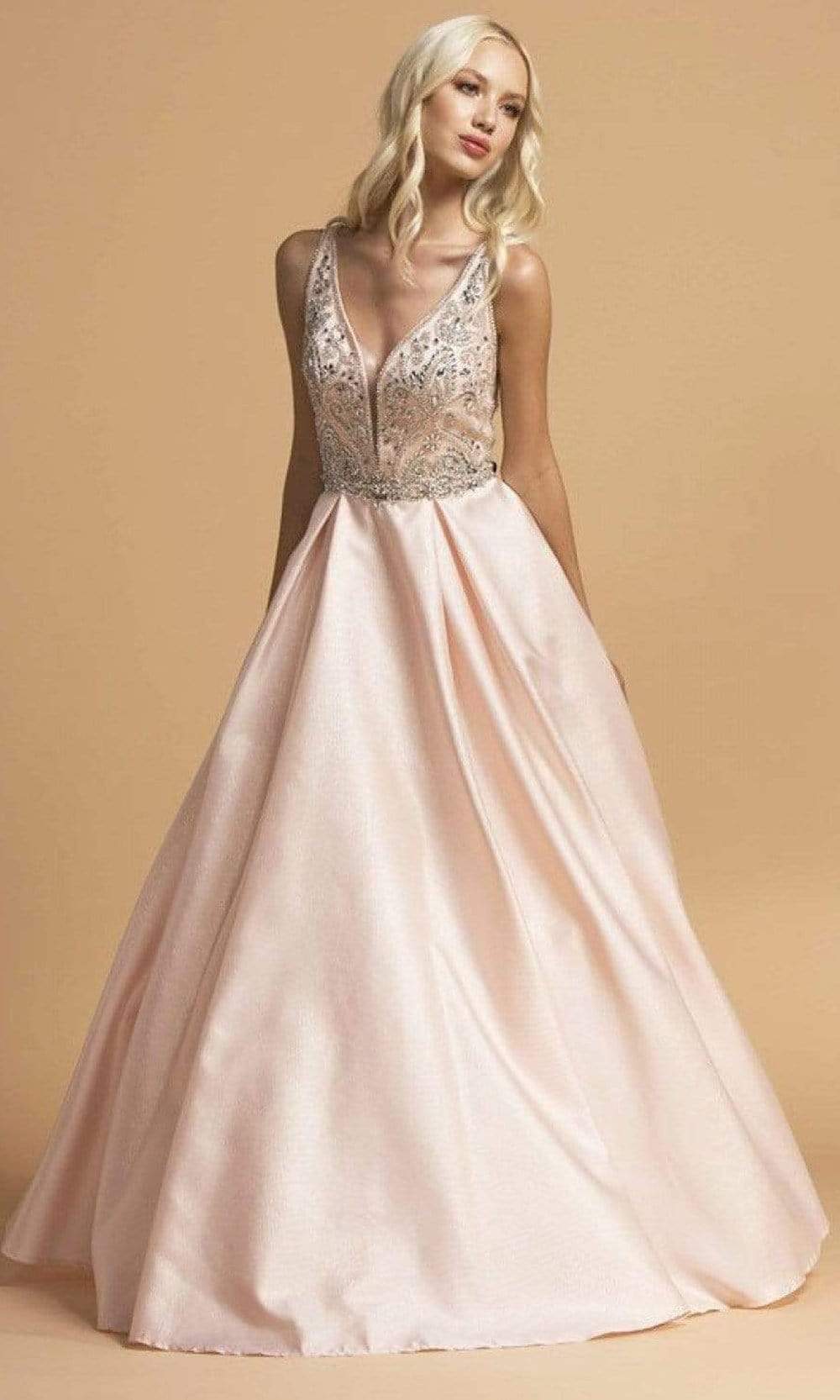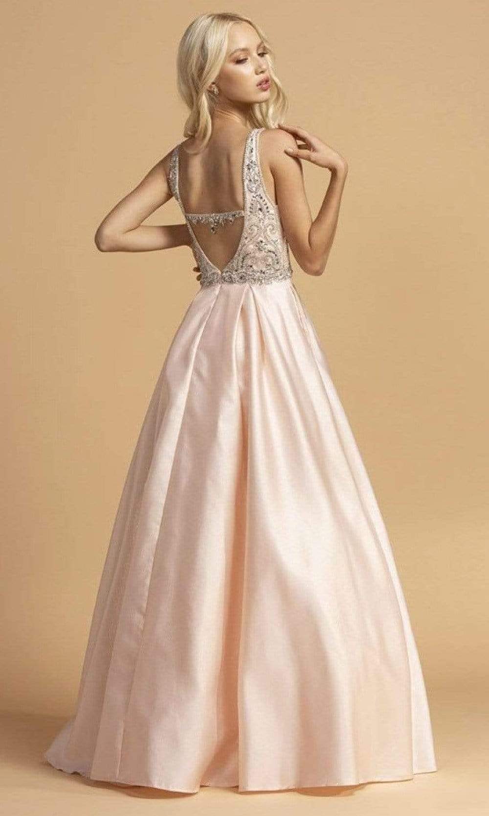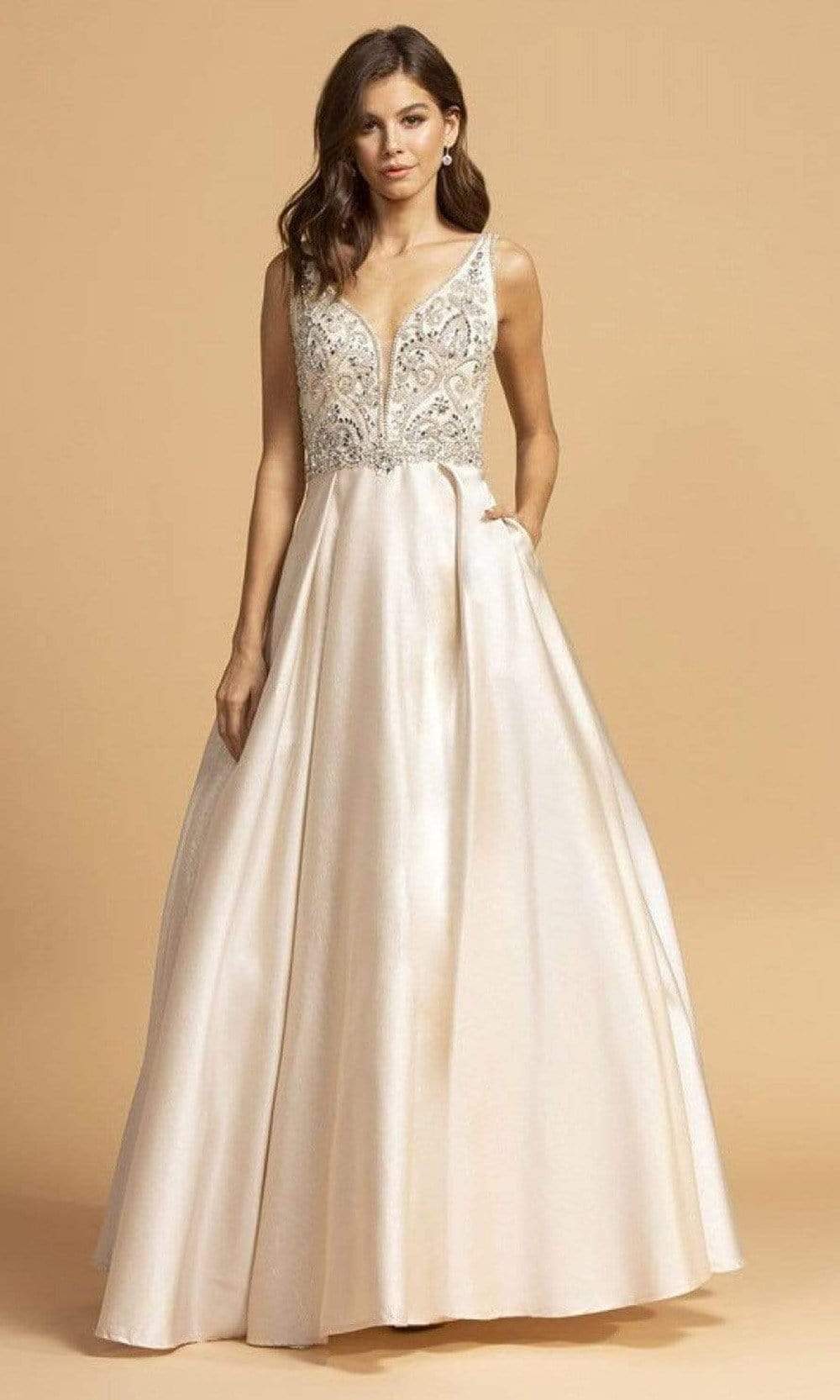 Be adored by the fascinating crowd in this Aspeed Design L2261 creation. Tailored in a sleek satin silhouette, this stylish piece reveals a plunging v-neckline with a sheer inset. Beadwork ornate the bodice and a jeweled cutout back. The shiny skirt streams to the floor. Capture everyone’s attention in this Aspeed Design masterpiece.
