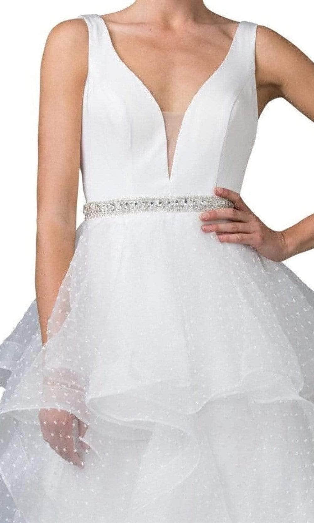 | Details: | Organza, Sleeveless, Illusion Inset, V-Open Back, Zipper Closure, Beaded Waistband, Tiered Skirt, Sweep Train |