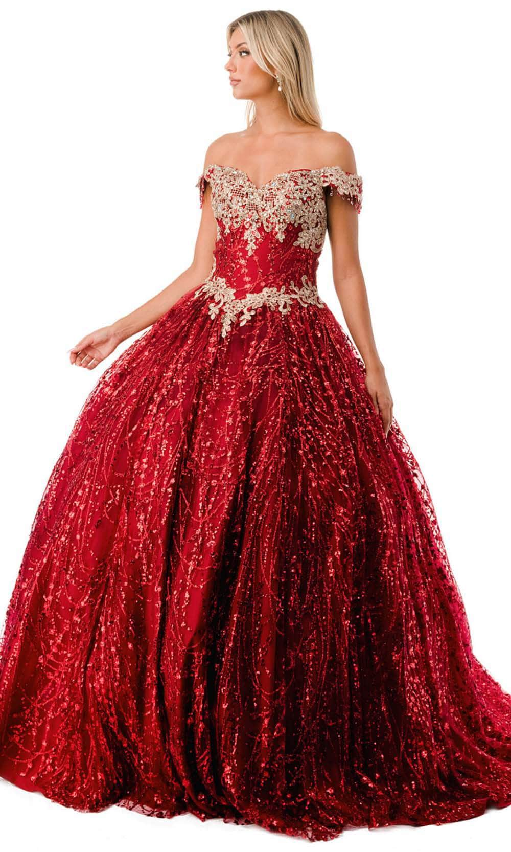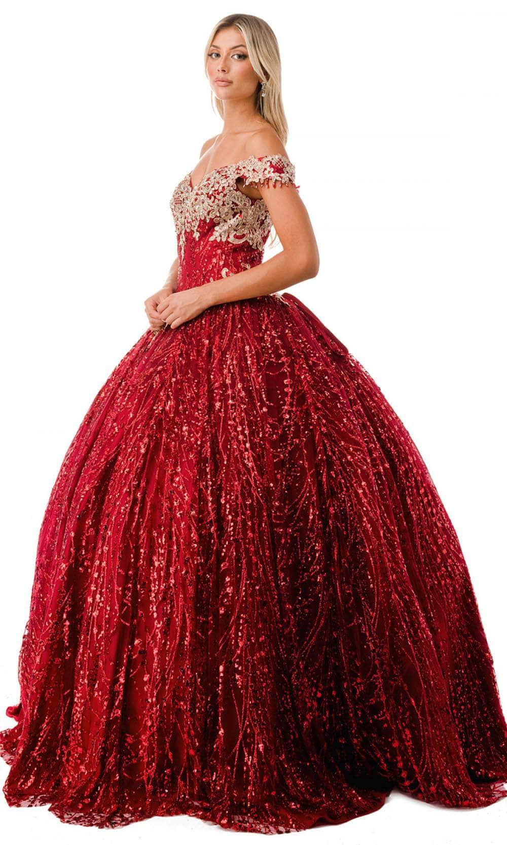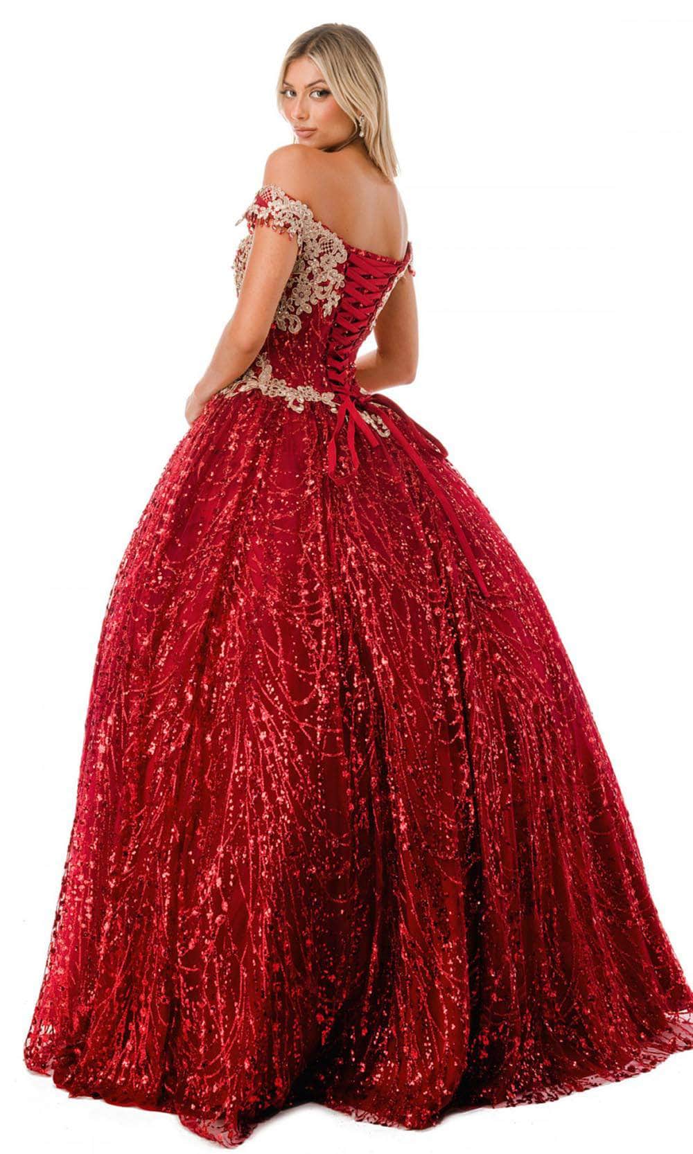 Be a queen of your own right in this remarkable gown by Aspeed Design L2364. Fabulously embellished with lace applique and glittering beads, this gown is sure to be a show-stopper. The off-shoulder sweetheart neckline has cap sleeves with playful beaded fringes. Skin is displayed at the back with its mid-open detail, and it is secured by an adjustable lace-up tie closure. From the basque waist, the skirt forms a voluminous ballgown silhouette that gorgeously glides to the floor and sweeping train. This Aspeed Design L2364 creation gives you an intricate look that will last a lifetime. Models are wearing the Burgundy, and Rosegold colors.