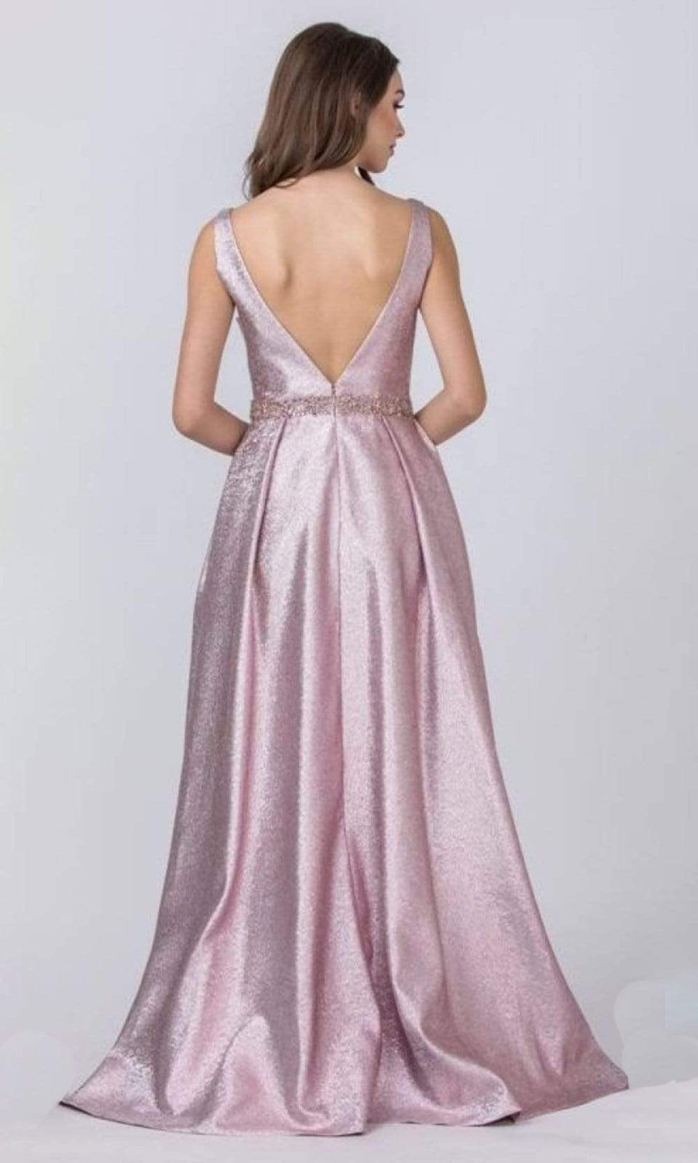 Details: Metallic, Sleeveless, Illusion Inset, Pleated, Low V-Open Back, Beaded Waistband, Pockets, Sweep Train