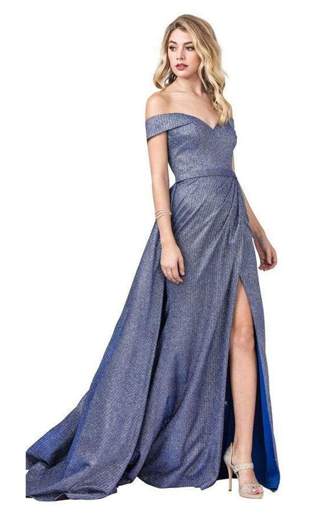 Look sophisticated and classy with this Aspeed Design L2435. This long dress is glittered allover in a fabric and presents off shoulder sleeves in a sweetheart neckline. Thigh-high slit gives enhancement to the sheath silhouette and then an overskirt makes it an A-line for added length and volume. Aspeed Design is sure to be an attention-grabber in any occasion.