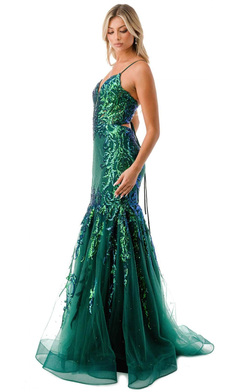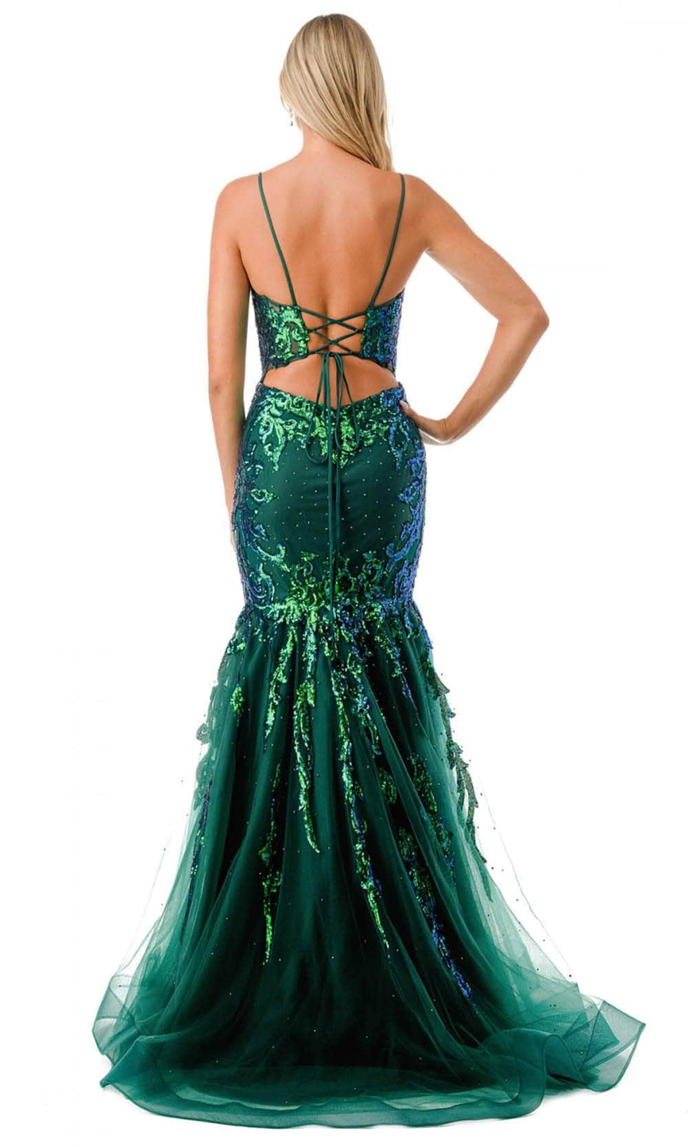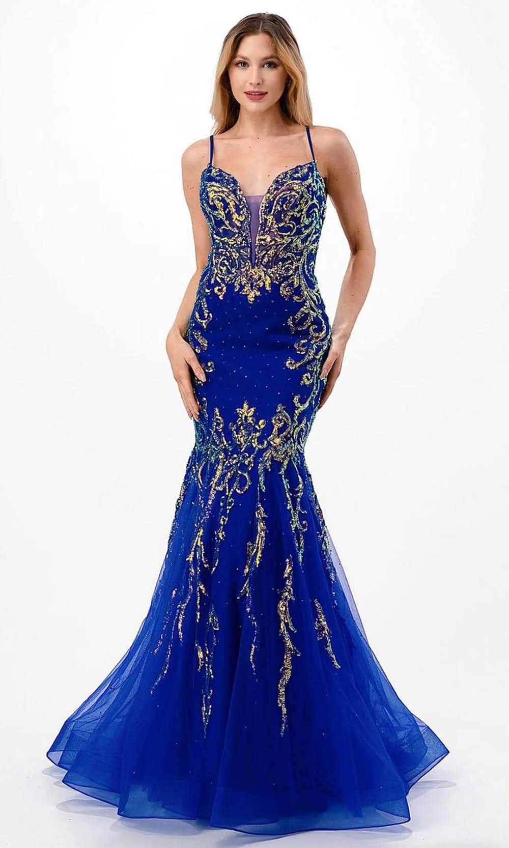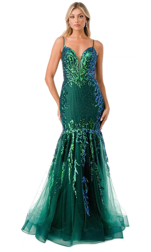 Flow captivatingly through the night in majestic iridescence in this fascinating Aspeed Design L2659 creation. Opulently charmed with shimmering rhinestones and dazzling sequins, this long gown parades delicate spaghetti straps trailing into a plunging sweetheart neckline with a tonal illusion inset. The lace-up bandeau and a low cutout at the small of the back, this piece enhances the overall design as it crafts into a trumpet silhouette with an ethereal flare and a sweeping denouement. Look perfect at your special occasion as you make a lasting impression in this Aspeed Design L2659 masterpiece. Model are wearing the Emerald and Royal colors.