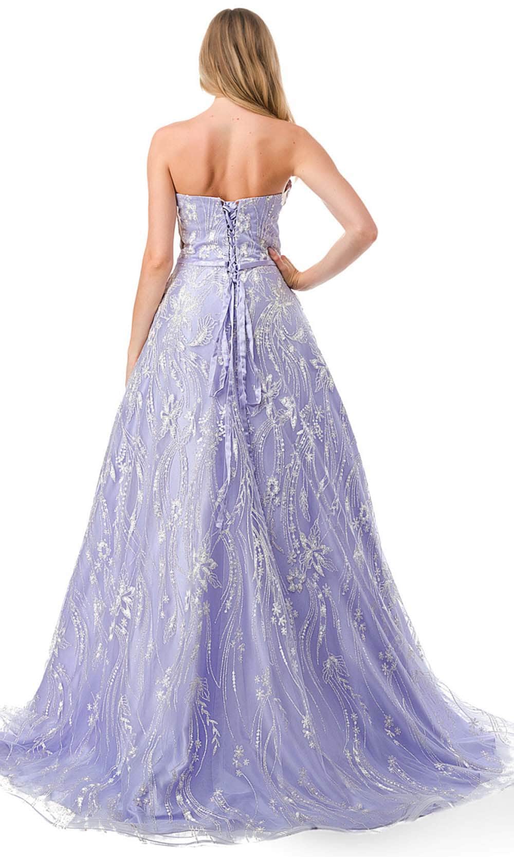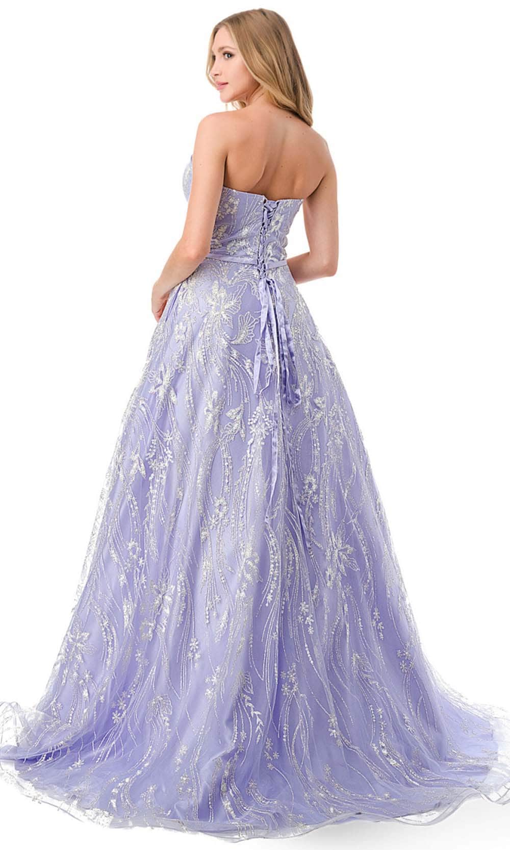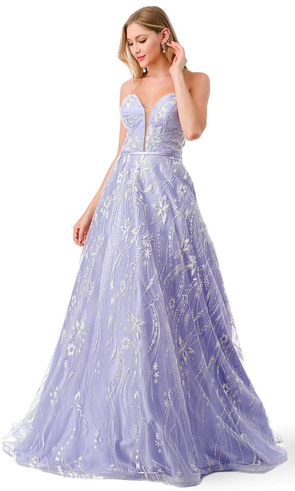 Embrace timeless elegance in this stunning Aspeed Design L2774B creation as you make a mesmerizing entrance. Adorned with a trailing glitter print design overlaying a tailored silhouette, the strapless gown features a flattering sweetheart neckline that accentuates the decolletage. Flaunting a lace-up back that allows a customized fit, a tonal satin band cinches the waist as it enhances the silhouette. To complete the ensemble, a sweep train elegantly trails behind the glimmering skirt as it crafts an A-line silhouette. Make a memorable entrance when you arrive in this Aspeed Design L2774B masterpiece. Model is wearing the Lilac color.