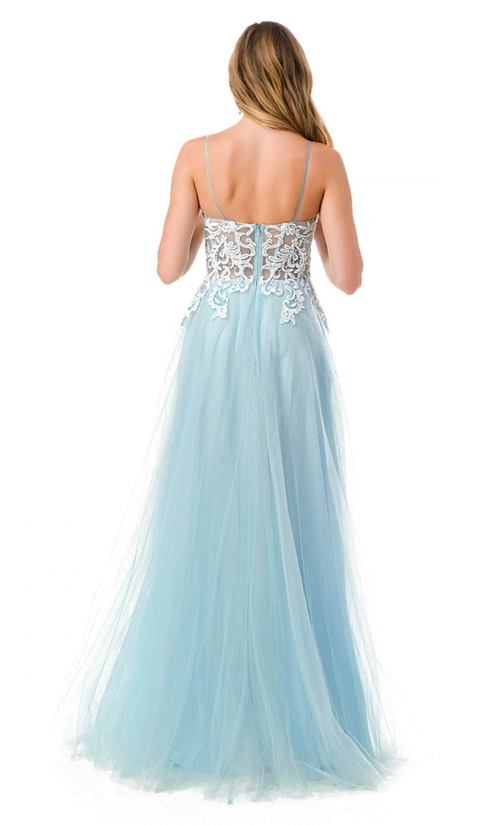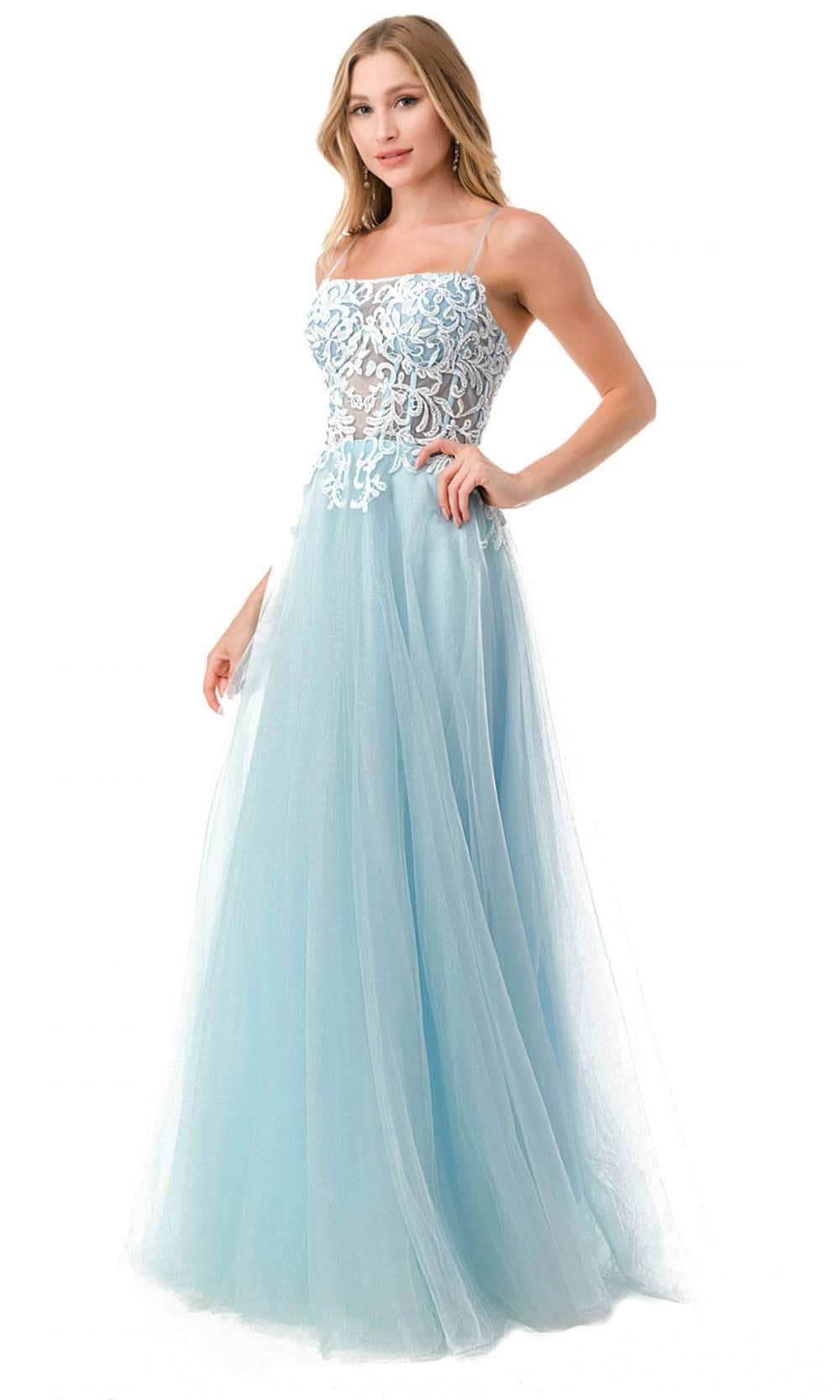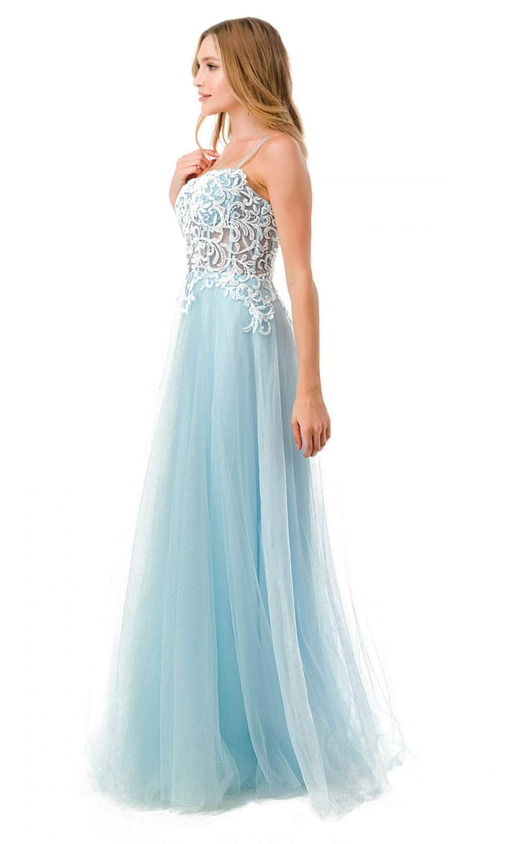 Be the belle of the ball in this Aspeed Design L2809A. The sleeveless corset bodice is a stunning display of intricate lace appliqué, exuding an air of timeless elegance. The straight-across neckline adds a touch of sophistication to this enchanting ensemble. The mid-open back, secured with a back zipper closure, ensures a seamless fit. The full-length A-line skirt gracefully cascades, allowing you to dance with grace and charm, and finishes with a train that adds a sense of grandeur and drama. This Aspeed Design L2809A is a true statement piece, perfect for making a lasting impression on any special occasion. Model is wearing Ice Blue color.