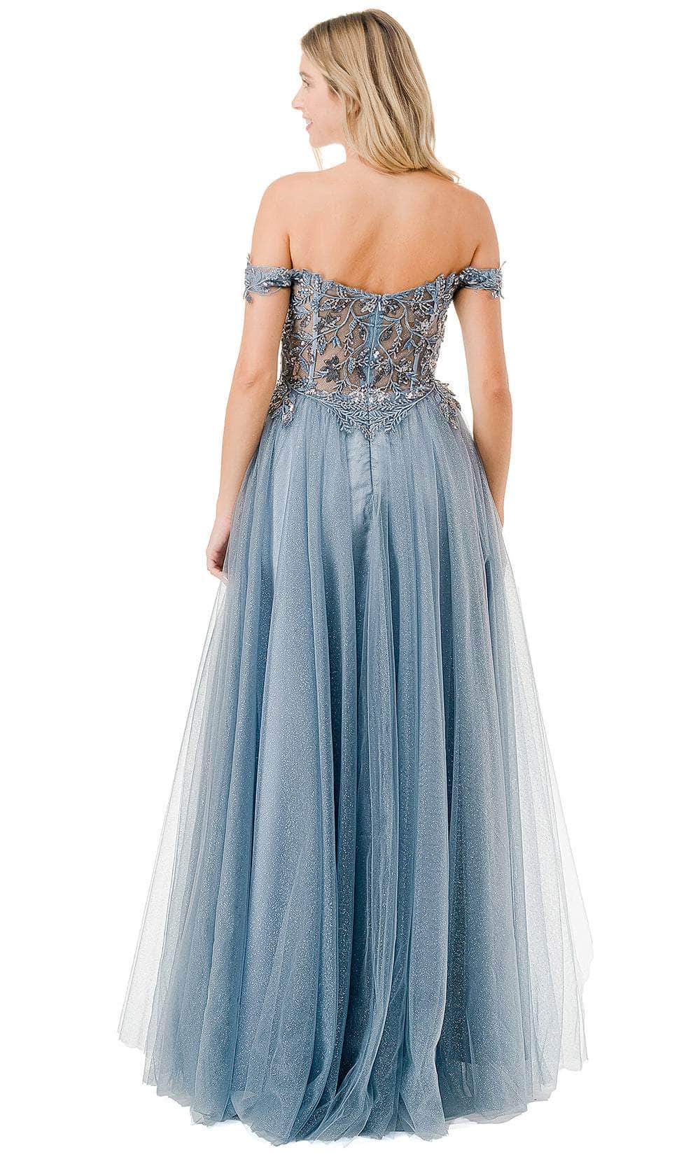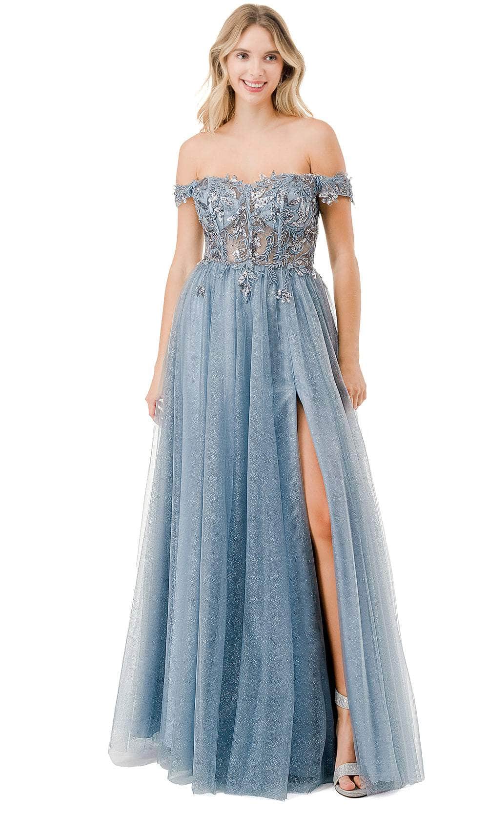 Embrace your inner enchantress in this Aspeed Design L2837Y dress. Crafted with an illusion corset bodice adorned in shimmering sequin and embroidery, this dress exudes sheer elegance and sparkle. The off-shoulder sweetheart neckline paired with cap sleeves enhances your femininity and creates a timeless appearance. The alluring mid-open back and high leg slit displays add a hint of your skin. With glitters that catch the light, the skirt flows from your waist to the floor, creating an ethereal A-line silhouette. This Aspeed Design L2837Y dress will make your night genuinely remarkable. Models are wearing Sage, and Slate Blue colors.