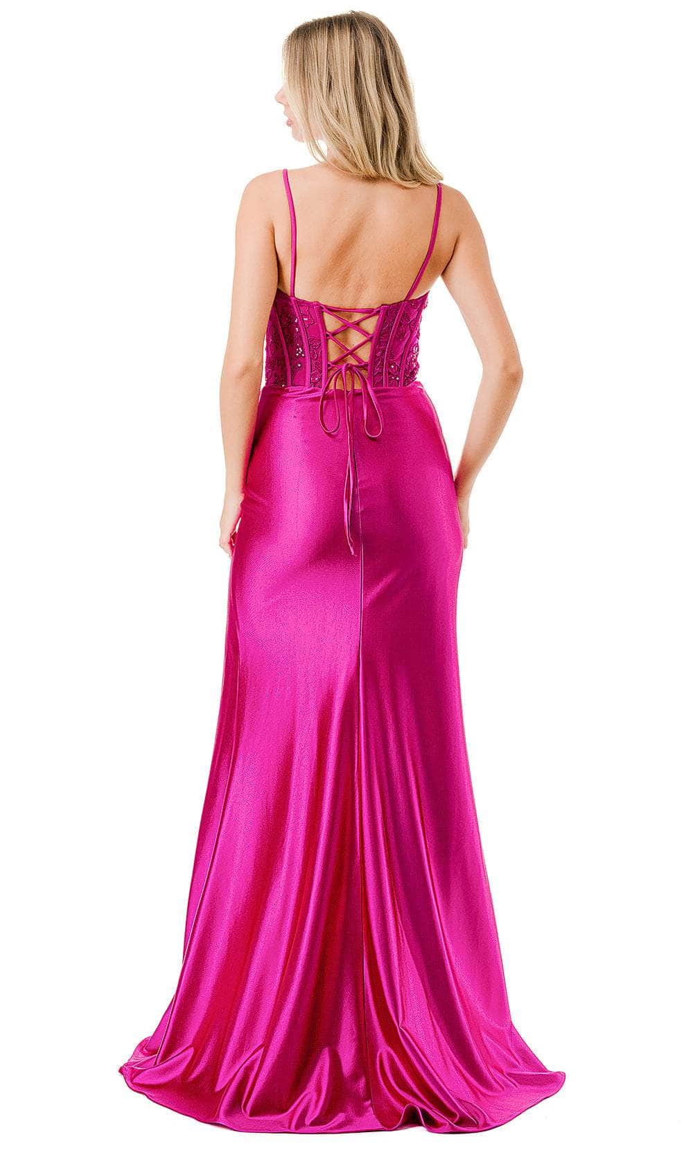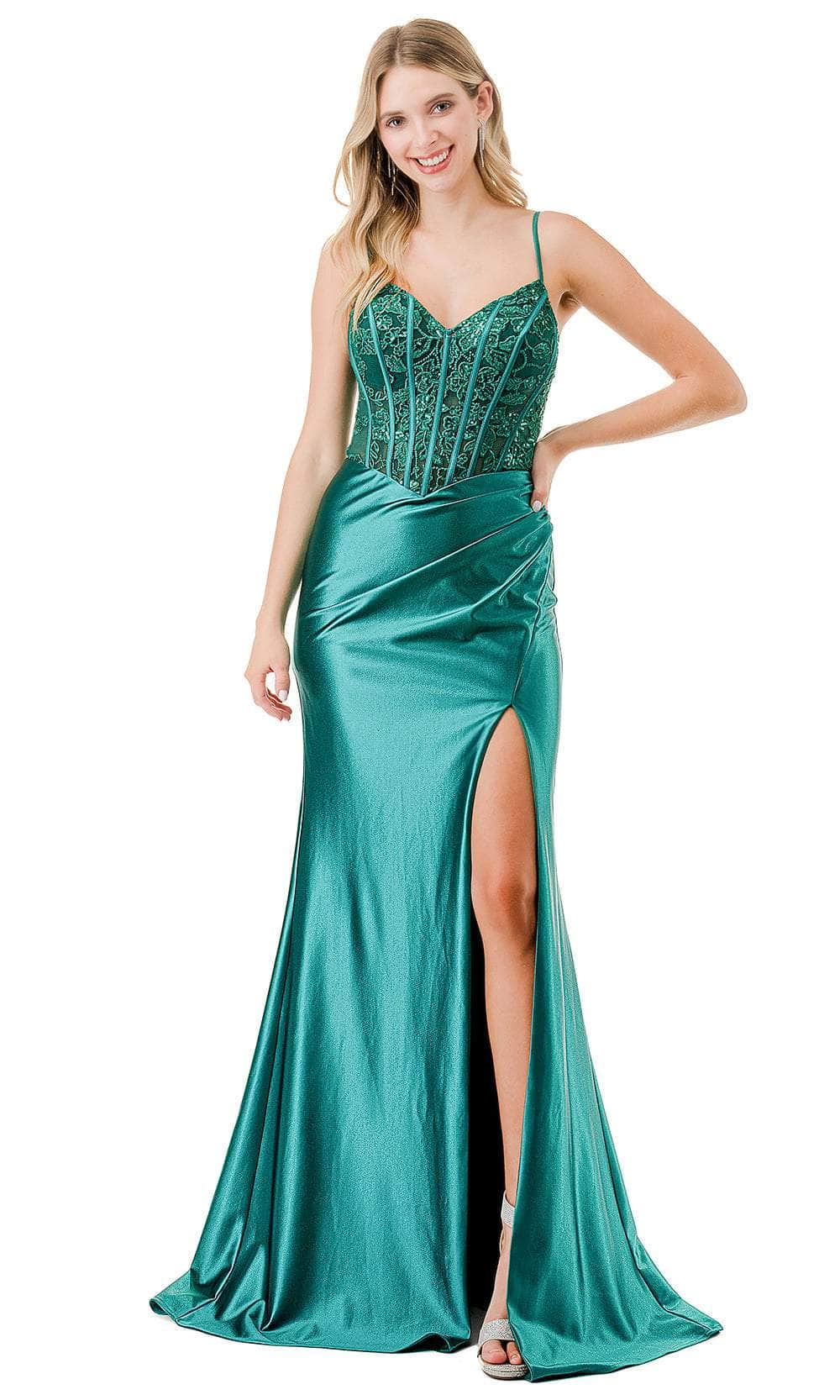 Be crowned as a statuesque beauty in this Aspeed Design L2900P creation. Adorned with lace applique and beaded, this sleeveless dress exudes elegance and charm. It features slender spaghetti straps and a sheer corset bodice with boning details. The ruched elements add dimension and texture, while the corset lace-up back promises a custom fit. With its captivating sheath silhouette, the skirt enhances your natural curves and flows to the sweeping train. A thigh-high slit adds drama and seductive finish. This Aspeed Design L2900P dress is a perfect choice for your prom and night event. Models are wearing Emerald, Magenta, and Navy colors.