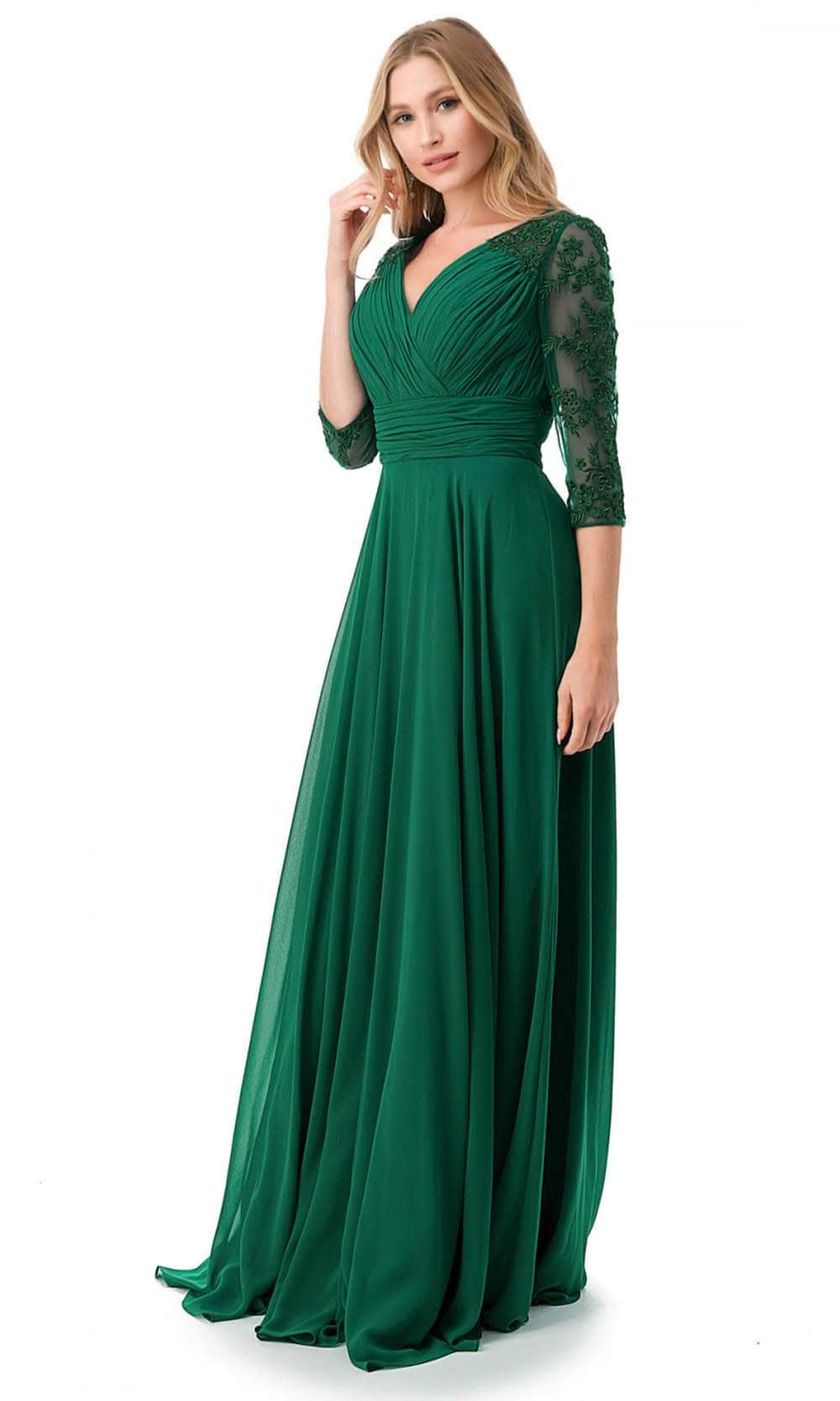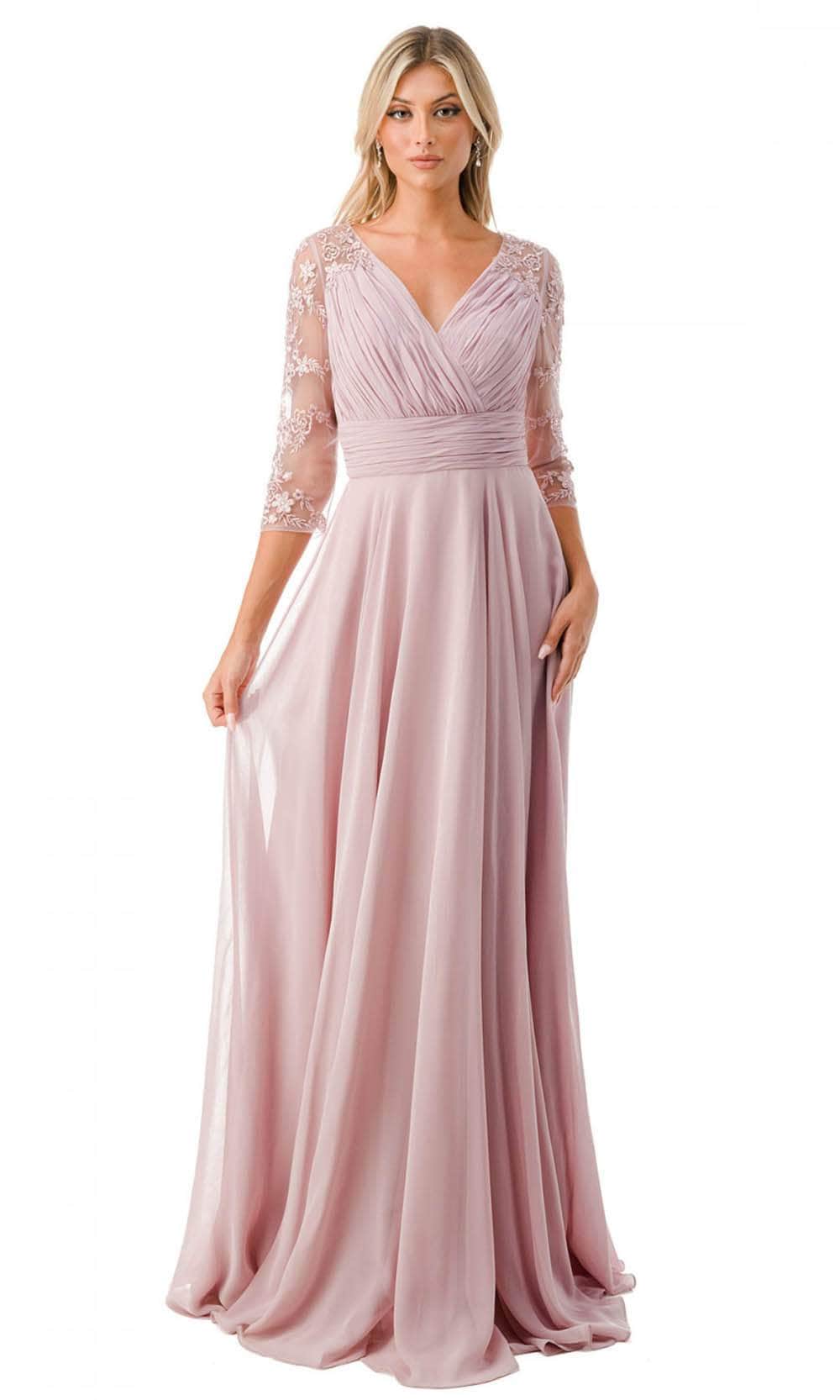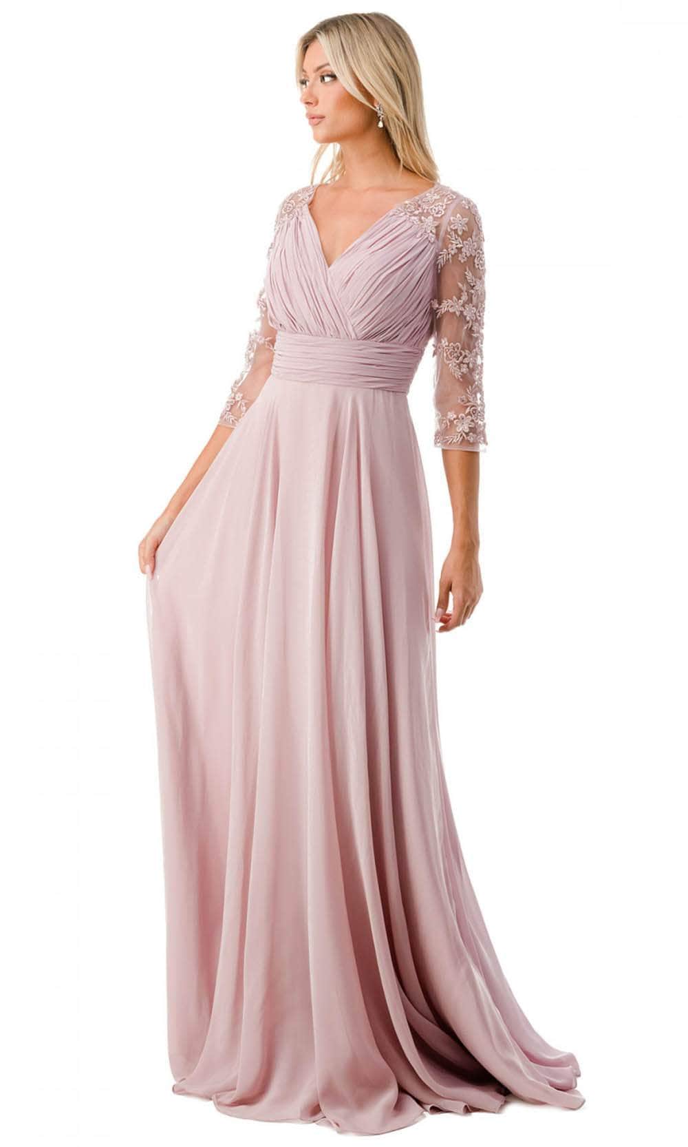 Dazzle the world in Aspeed Design M2733F, a masterpiece of elegance and sophistication. The exquisite dress is a canvas of gorgeous embroideries, intricately adorned with shimmering beads that catch the light from every angle. The quarter sleeves and the back showcase the artistry of craftsmanship, leaving onlookers mesmerized. The ruched bodice cinches with a cummerbund, creating a flattering silhouette, while the V-neckline adds a touch of allure. The full-back with a back zipper closure ensures a seamless fit, and the A-line silhouette gracefully flows to the floor, accented with a sweep train finish, leaving behind an air of enchantment with every step. This Aspeed Design M2733F is the epitome of timeless beauty and charm, a perfect choice for making a lasting impression on any special occasion. Models are wearing Mauve and Emerald colors.