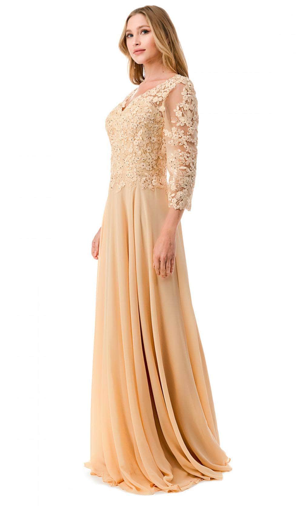 You will be an enchanting beauty in Aspeed Design M2758Q creation. Displaying a fitted top adorns with lace appliqued and sparkly beadings, this simply eye-catching gown is perfect for any upcoming event. It consists of a modest v-neckline, illusion quarter sleeves and an enclosed back with zipper closure. The flowy A-line skirt drops to the floor length hem and exits into a sweeping train. Capture the glamour as you walk on this stunning gorgeous Aspeed Design M2758Q masterpiece. Models are wearing the Charcoal, Eggplant, and Gold colors.