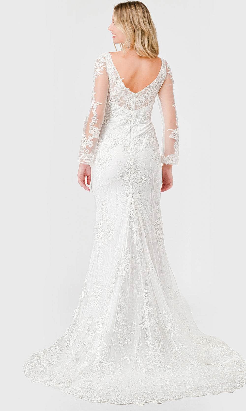 | Details: | Fitted, Long Illusion Sleeve, Floral Lace Embroidery, V-Back, Back Zipper, Sweep Train, Scalloped Hem |