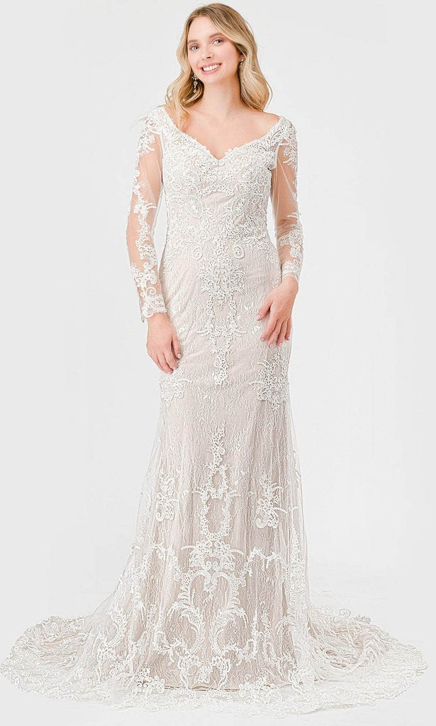 Prepare to enter the realm of bridal bliss by wearing the Aspeed Design MS0034. The gown exudes timeless elegance with its floral lace embroidery enveloped throughout the fitted bodice. Showcases are the long illusion sleeves that wonderfully cover your arms, while the alluring v-neckline is mirrored by the midrise V-shaped back. It also comes with a back zipper closure to make you feel comfortable and confident. The skirt forms a flattering sheath silhouette that spills into a ravishing sweep train. A scalloped design on the hemline captivatingly finishes this ensemble. Enthrall all in sight in this Aspeed Design MS0034 long gown. Models are wearing Off White, and Off W-Nude colors.