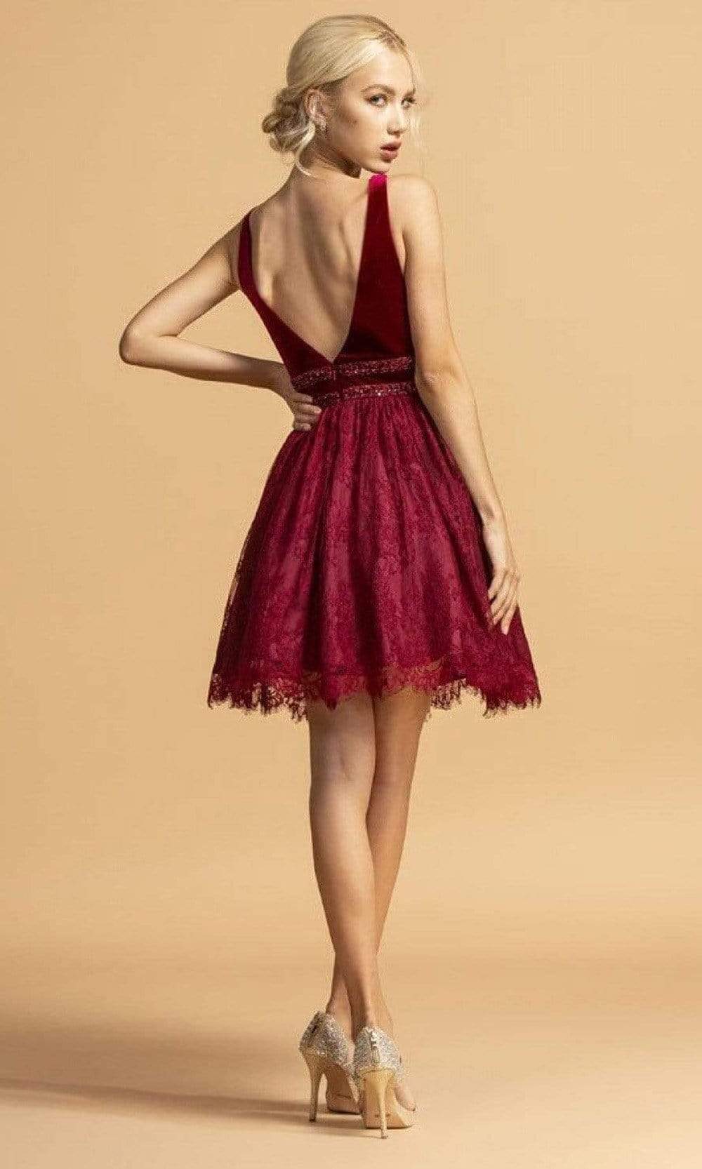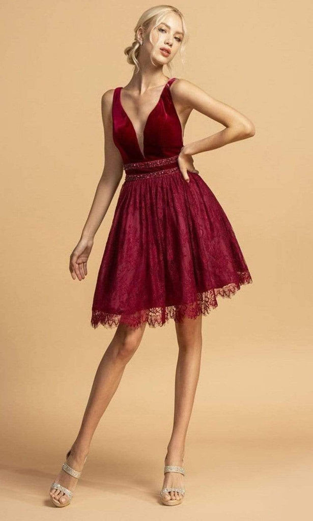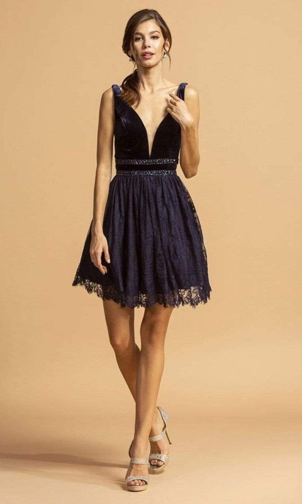 Steal the show while mesmerizing in this Aspeed Design S2082 creation. Tailored with a velvet bodice, this stunner creates a plunging v-neckline with a sheer inset. Nipped with beaded bands along the natural waist, this piece also has a v-open back. The lace draped A-line skirt flares into a short scalloped hemline. Showcase impeccable taste in this Aspeed Design masterpiece. Models are wearing the Burgundy and Navy colors.